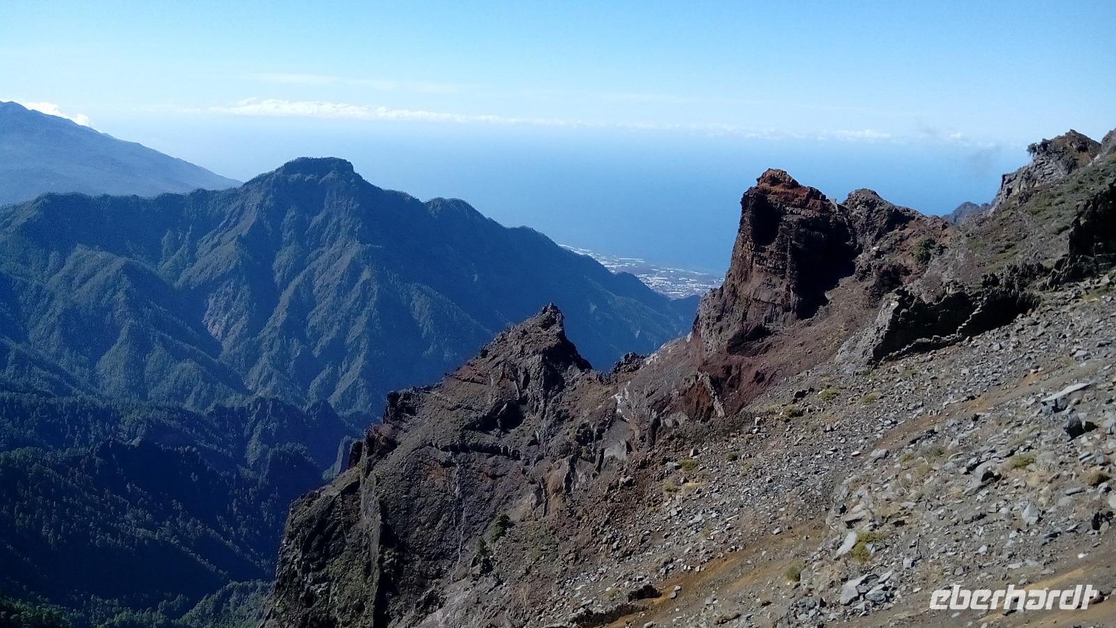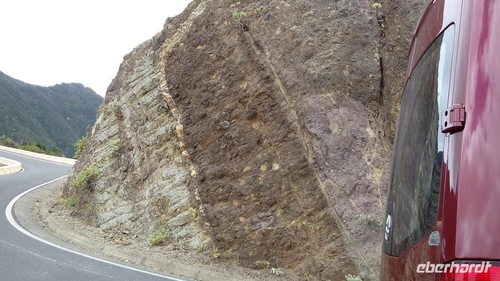 Am Mirador de Los Roques sahen wir beeindruckende Vulkanschlotkerne, einen auf der einen Seite, drei weitere auf der anderen. Die eigentlichen Vulkanschlote sind wegerodiert, das Gestein vom letzten Ausbruch (der nicht komplett stattgefunden hat) ist härter und steht noch beeindruckend da.