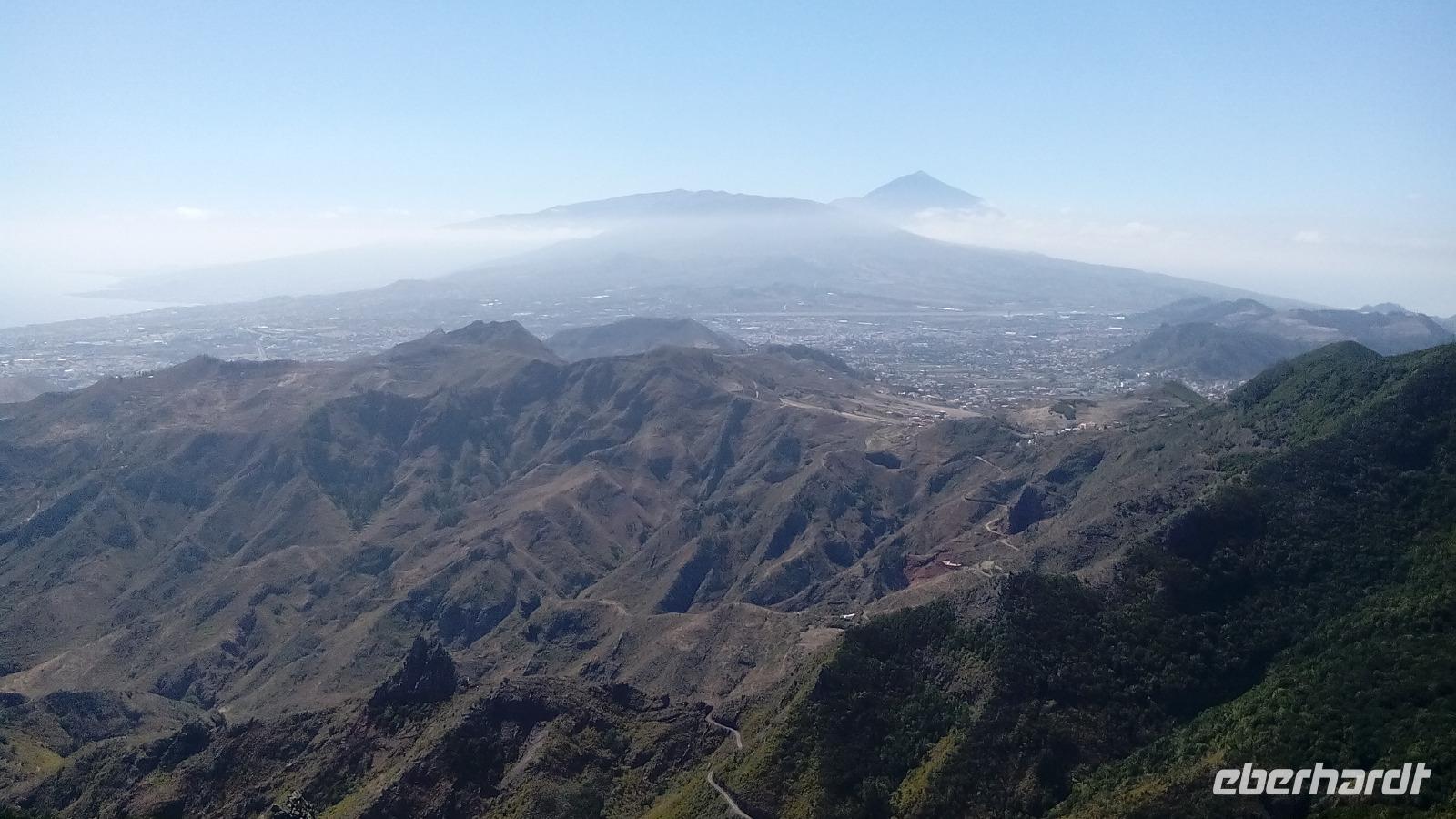 Dann musste es aber dennoch weitergehen. Wir fuhren durch den Lorbeerwald, der so schön feucht und bemoost ist, weil er die Wolken melkt. Wir hielten am Pico del Inglés. Dieser heißt so, weil angeblich ein Engländer abgestürzt war, der sich dann aber als Österreicher entpuppte. Hier hatten wir eine dreifache Aussicht: zum Teide (der ganz klar sichtbar war) und Flughafen im Südwesten, Santa Cruz im Südosten und La Laguna im Nordwesten.