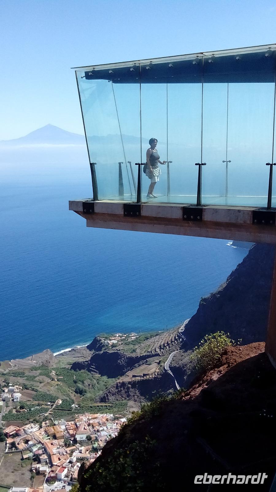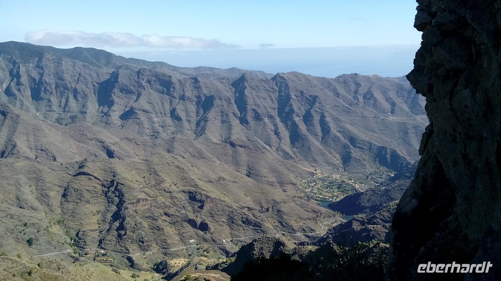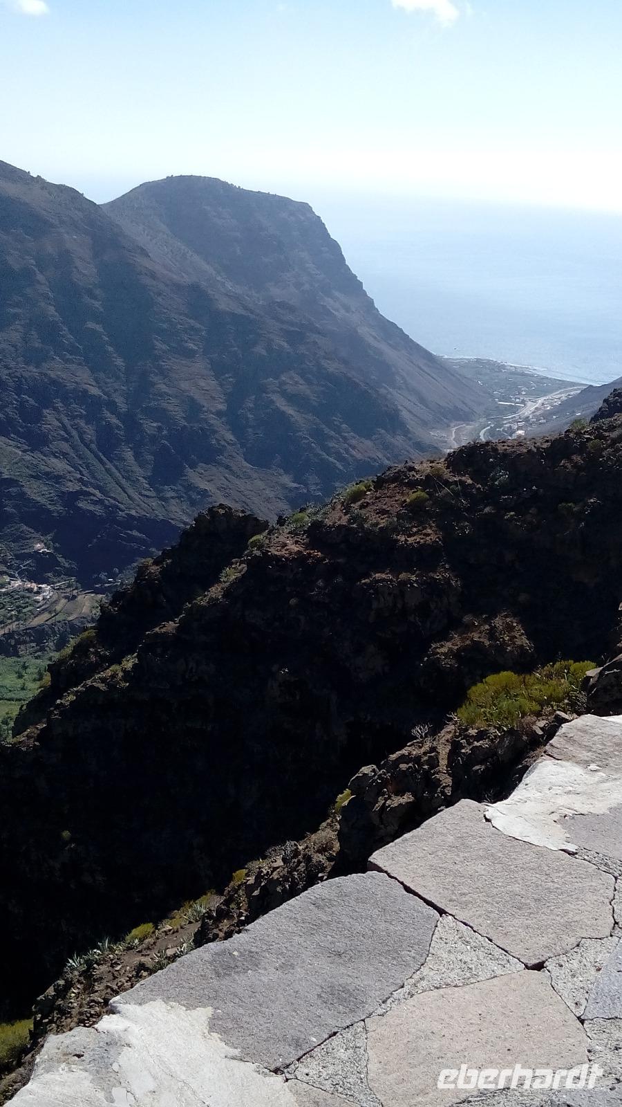 Am ersten Mirador Degollada ("Pass") de Peraza (Name eines Grafen) sahen wir auf der einen Seite das Tal von San Sebastián mit Stauseen, auf der anderen Seite die Südseite der Insel.