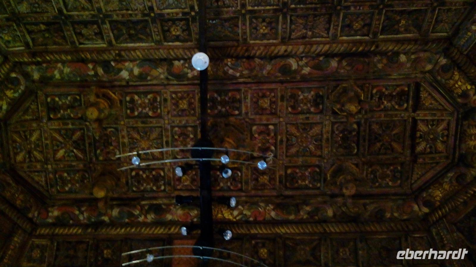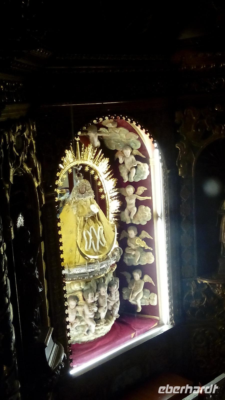 Neben der Kirche, hinter dem Altar, befindet sich ein Minimuseum, das eigentlich nachmittags geschlossen ist, aber Gabriele hat einen guten Draht zu dem Paar, das das Museum verwaltet, und hat uns eine kleine Führung organisiert. So konnten wir wundervolle Kiefernholzdecken und -fußböden und jahrhundertealte Kleider und Schmuckstücke der Jungfrau bewundern. In einem Schaukasten befanden sich unzählige Figuren aus Silber (von reicheren Leuten) und aus Wachs (von ärmeren Leuten), die als Bittstücke gedient hatten: Körperteile bei Krankheit, Tierfiguren bei Problemen mit den Haustieren, usw.