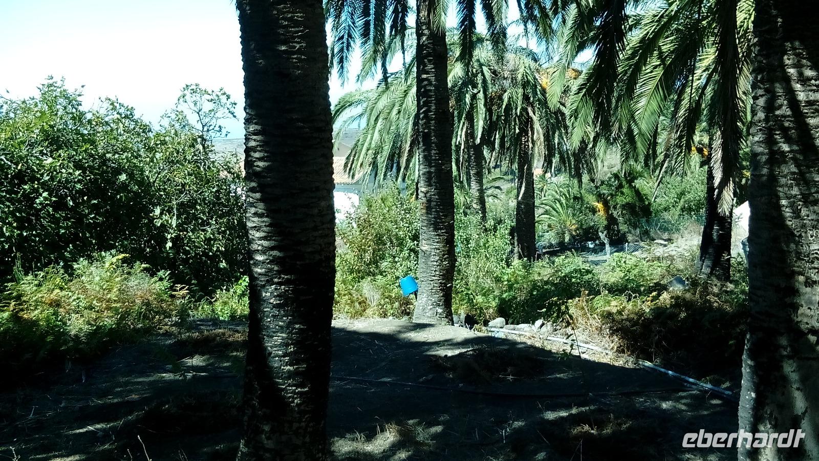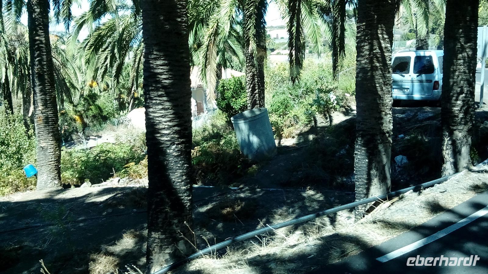 Bei Las Hayas sah man Leitern auf und Eimer an den Palmen und wir bekamen die Herstellung des berühmtem Palmen-"Honigs" erklärt, der eigentlich Palmensirup ist, da keine Bienen beteiligt sind, und um dessen Namen sich La Gomera mit der EU streitet. Nach der Ernte, die über mehrere Wochen von Nächten erfolgt, muss sich die Palme fünf Jahre lang regenerieren.