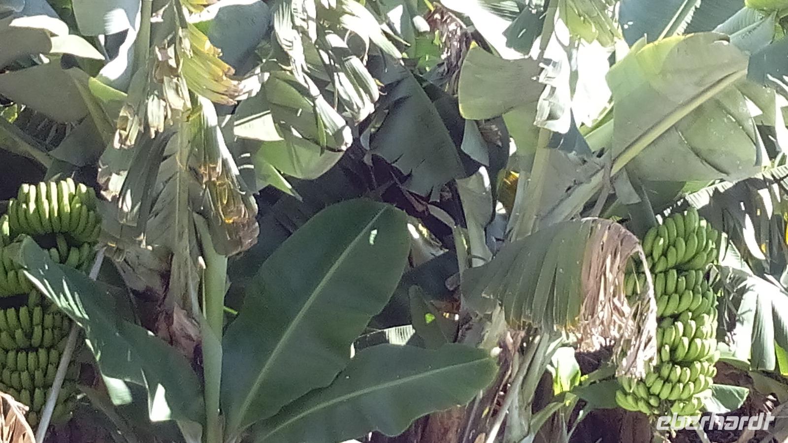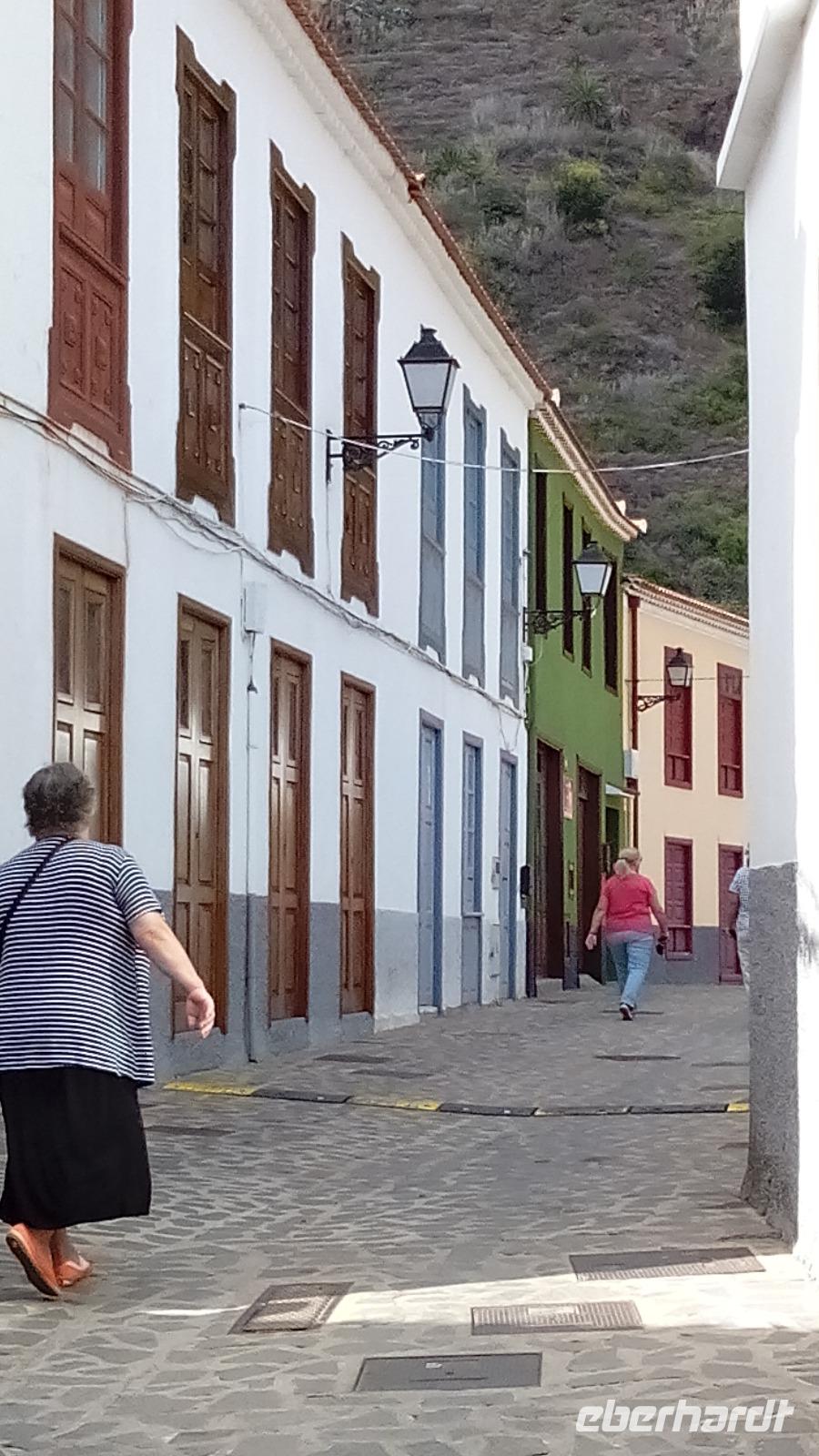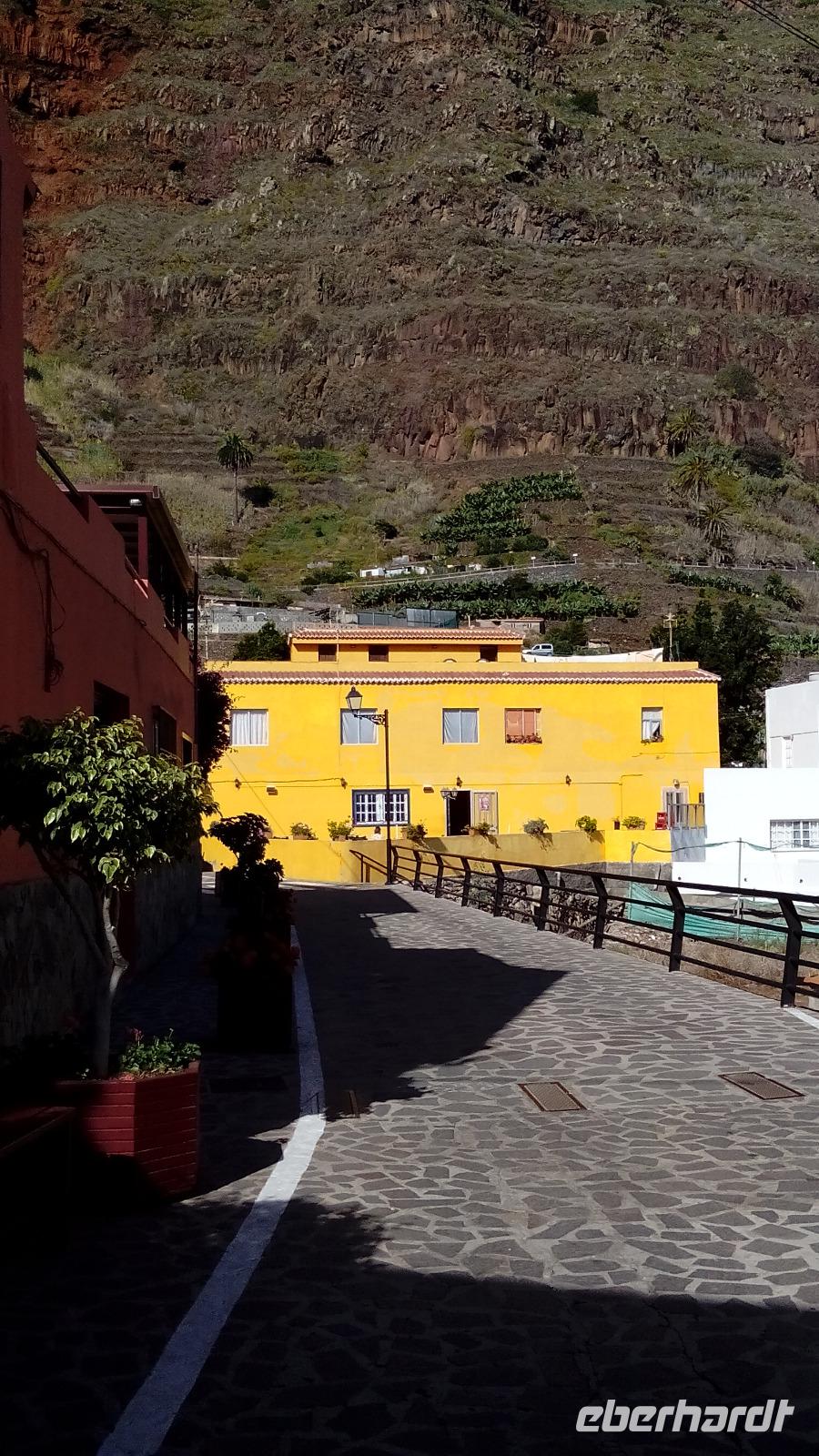 Dann kamen wir in Agulo an und spazierten durch die schönen Gassen bis zur Kirche mit dem ungewöhnlichen weißen Kuppeldach und dem Rathaus gegenüber. Auf dem Weg dahin schauten wir Mangos und Bananen beim Wachsen zu.