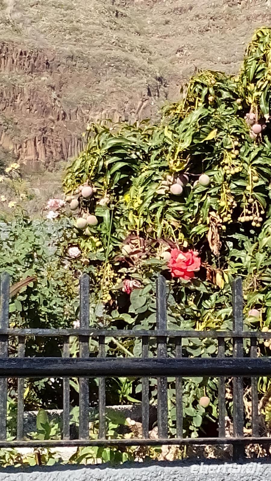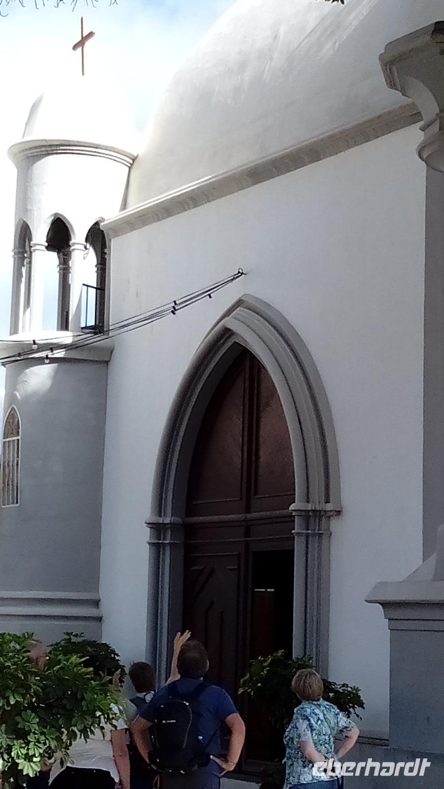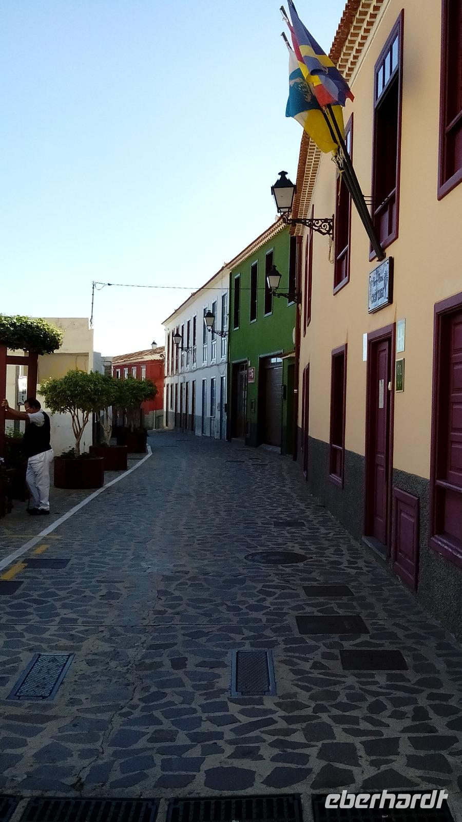Dann kamen wir in Agulo an und spazierten durch die schönen Gassen bis zur Kirche mit dem ungewöhnlichen weißen Kuppeldach und dem Rathaus gegenüber. Auf dem Weg dahin schauten wir Mangos und Bananen beim Wachsen zu.