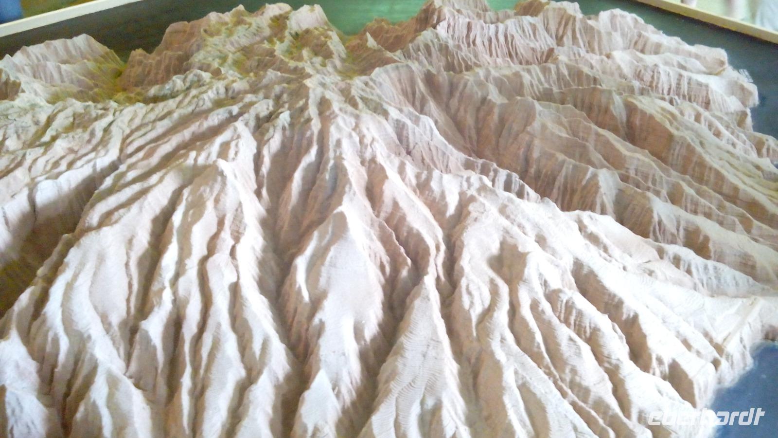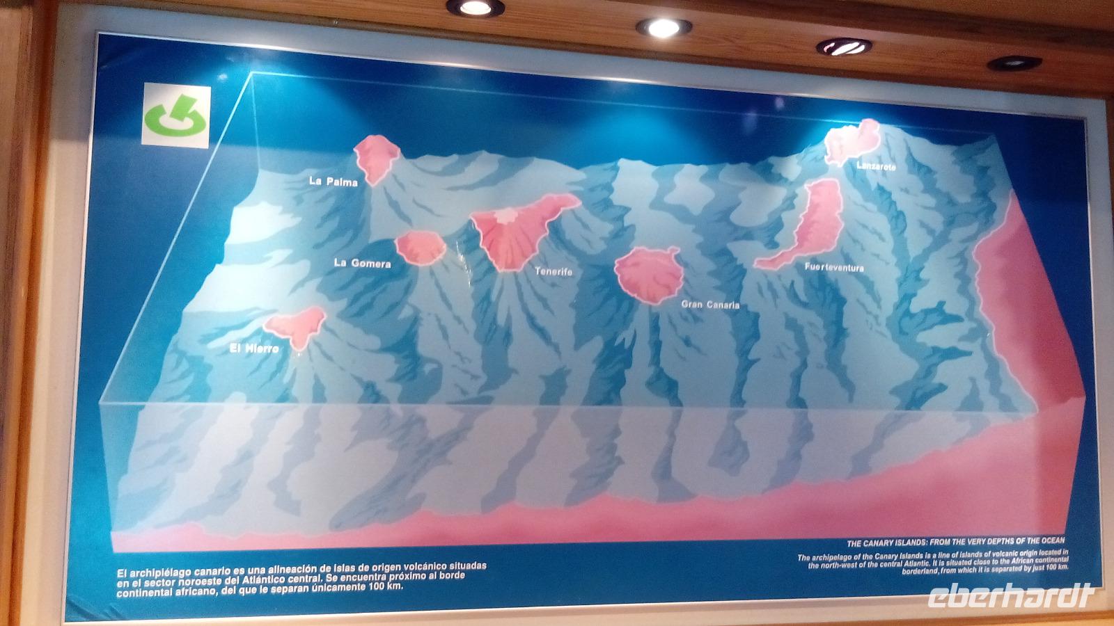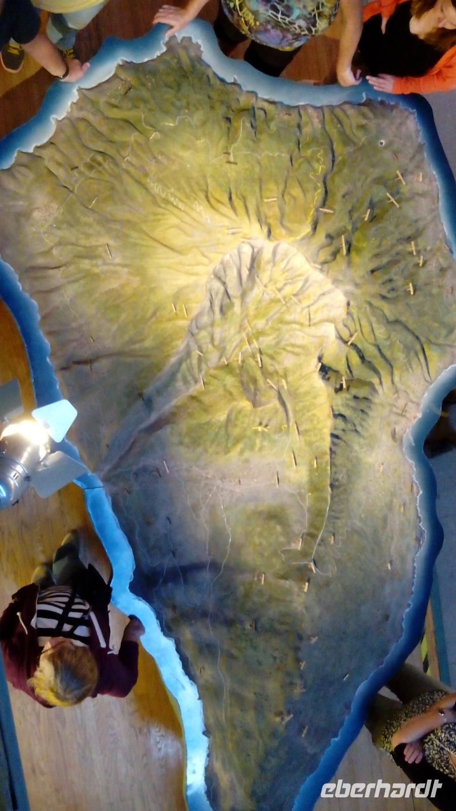 Wir fuhren weiter in die Mitte des Vulkanschlotes des nördlichen, breiten Teils der Insel, in das Besucherzentrum Caldera de Taburiente. Hier gab es ein Relief der Insel, daran erklärte uns Gabriele, wie die Vulkaninsel strukturiert ist, so dass wir uns besser orientieren konnten.