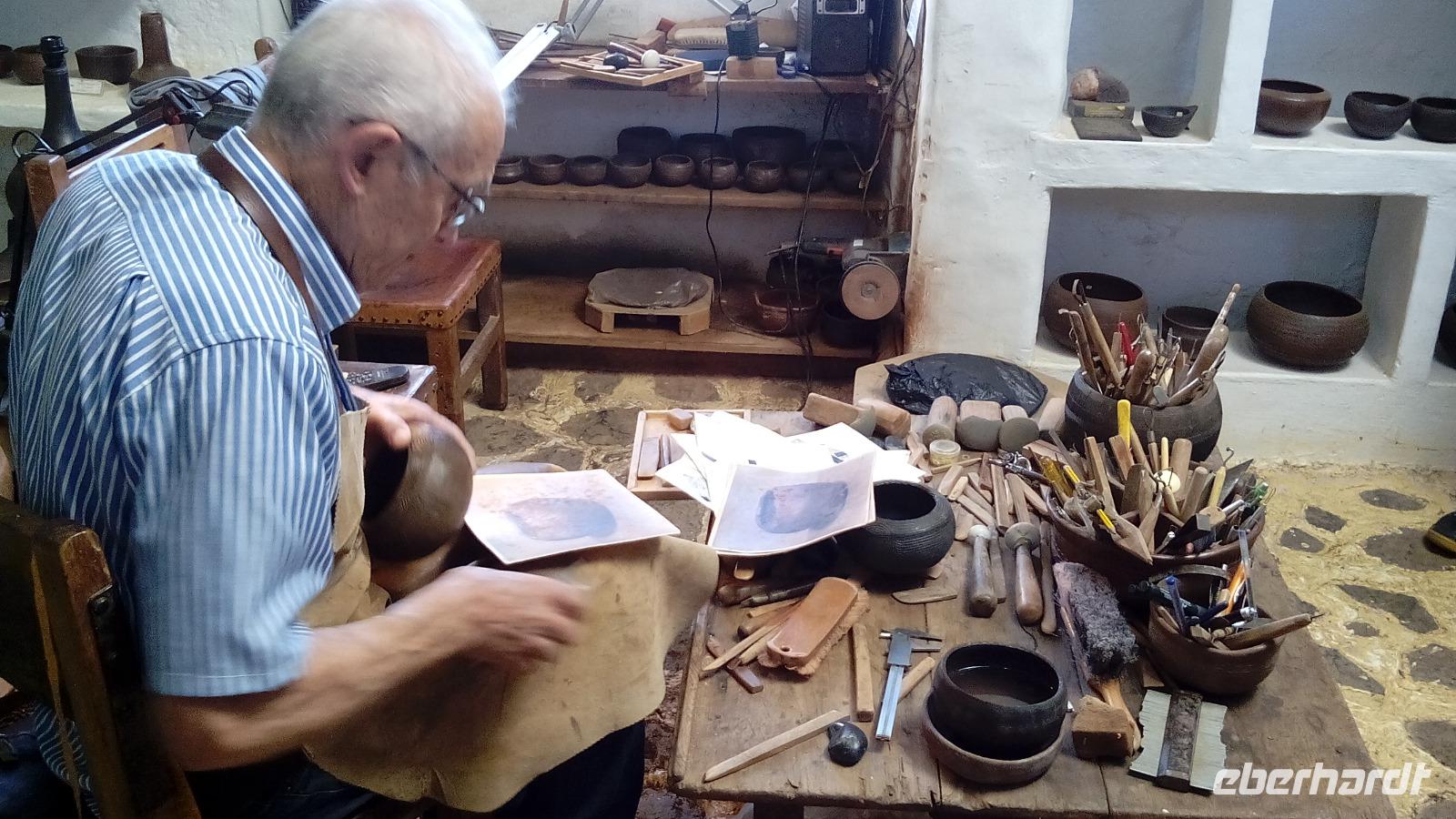Es war ein nationaler Feiertag (Día de la Hispanidad), und trotzdem öffnete Don Ramón seine Keramikwerkstatt in Mazo für uns, eine renovierte alte Mühle, die mit liebevoll gepflegten Pflanzen umgeben war. Nach einem Film sahen wir dem Töpfer bei der Arbeit zu und staunten, wie äußerst detailgetreu er die alten Keramikfunde kopierte. Er imitierte jeden Fehler des Originals. Auf der einen Seite waren es 14 Linien, auf der anderen nur 13; die ersten vier Linien verliefen parallel, die übrigen als Spirale um das Gefäß herum; dort war ein Knick in der Linie etc. Bei jedem einzelnen Stück im Ausstellungs- und im Verkaufsraum erinnerte er sich an die Eigenheiten, unglaublich!