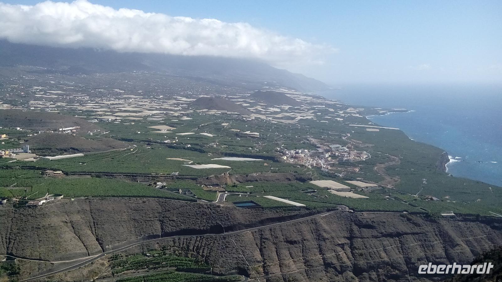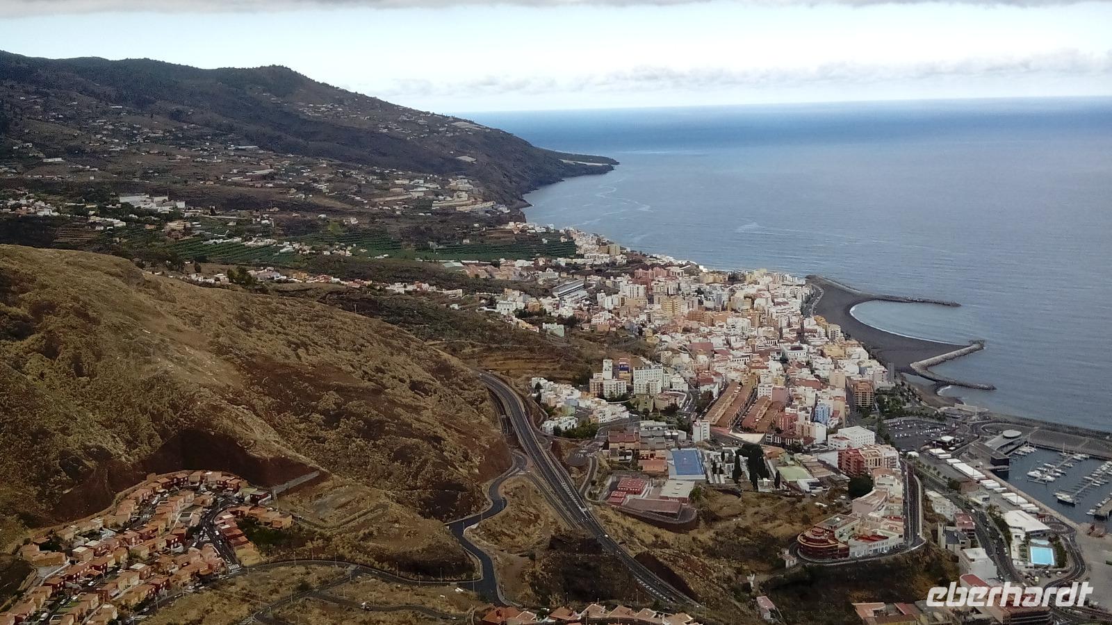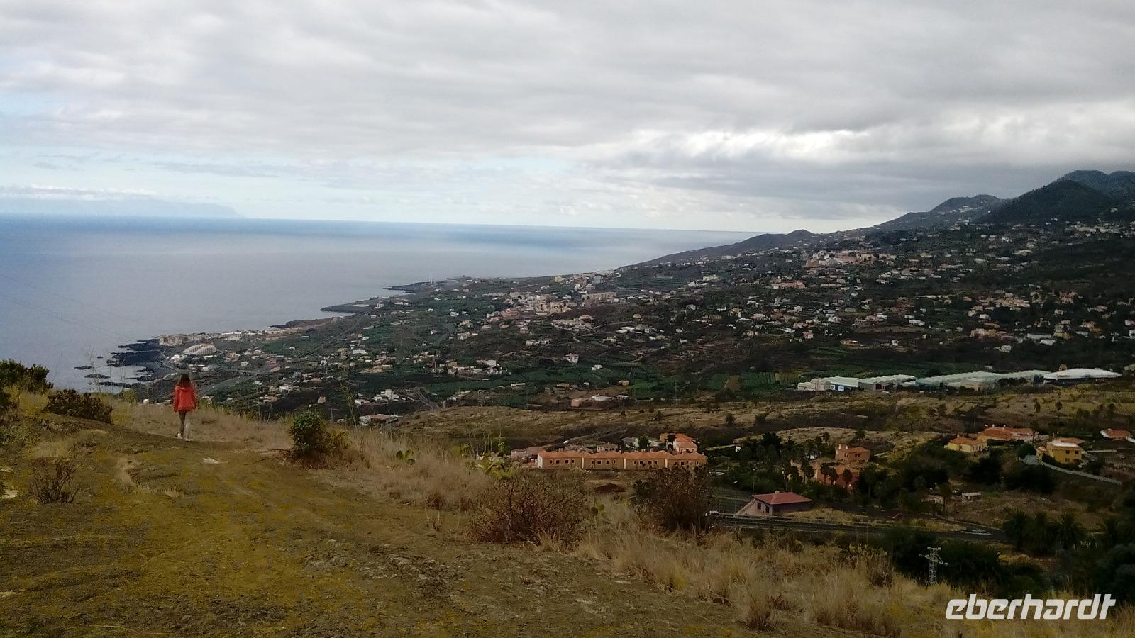 Auf dem Rückweg hielten wir am Mirador La Concepción, auf dem Hydrovulkan Caldereta, wo wir wieder eine Sicht nach zwei Seiten hatten, auf Santa Cruz mit seinem nagelneuen Strand, der bisher aus unbekannten Gründen nicht benutzt werden darf, und Cancajos.