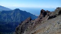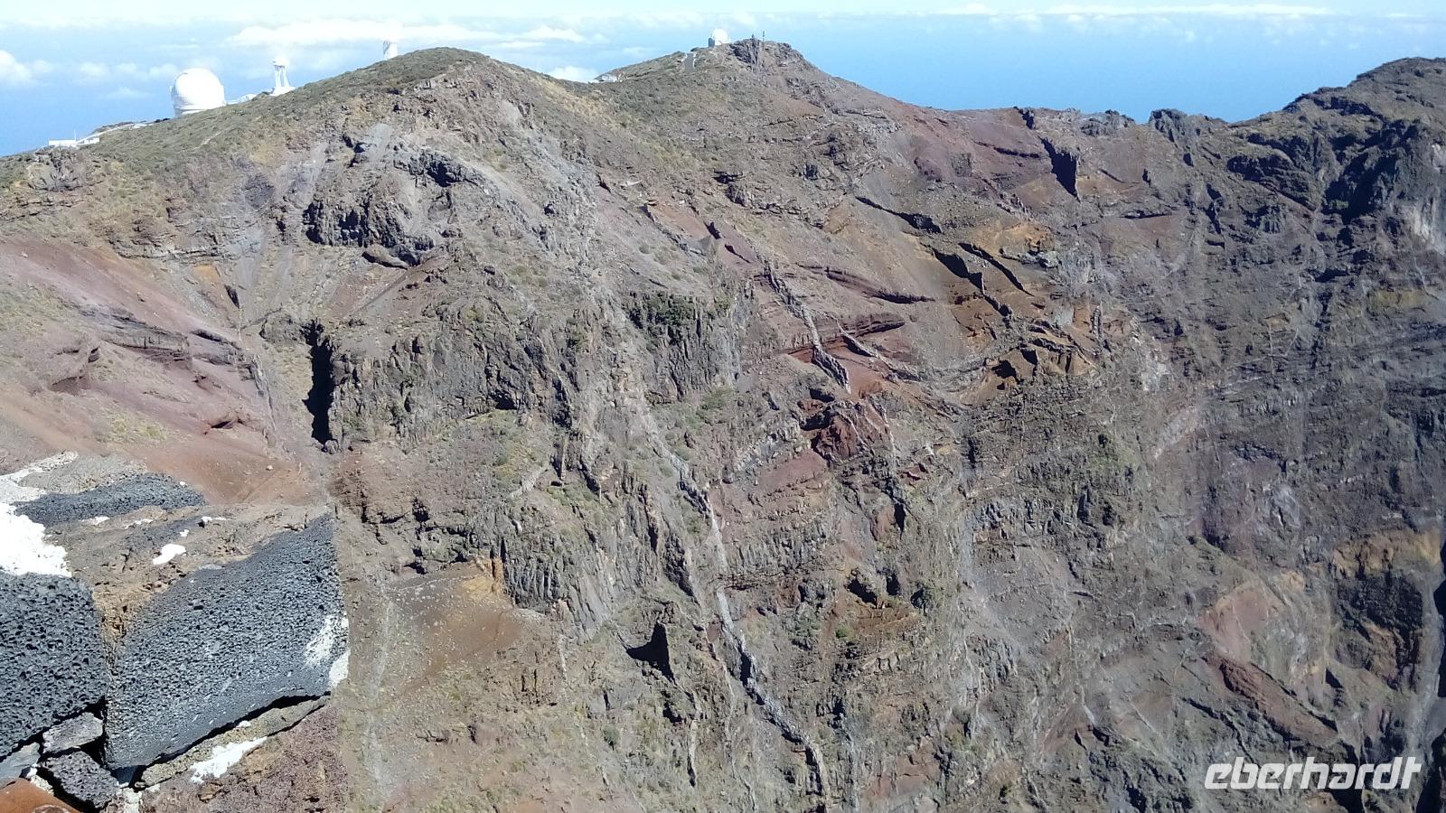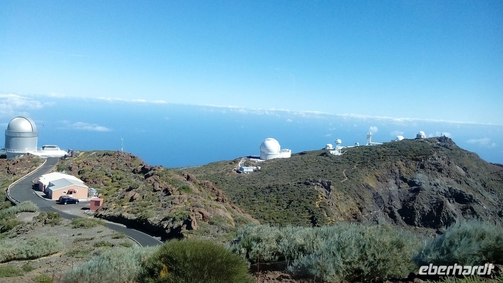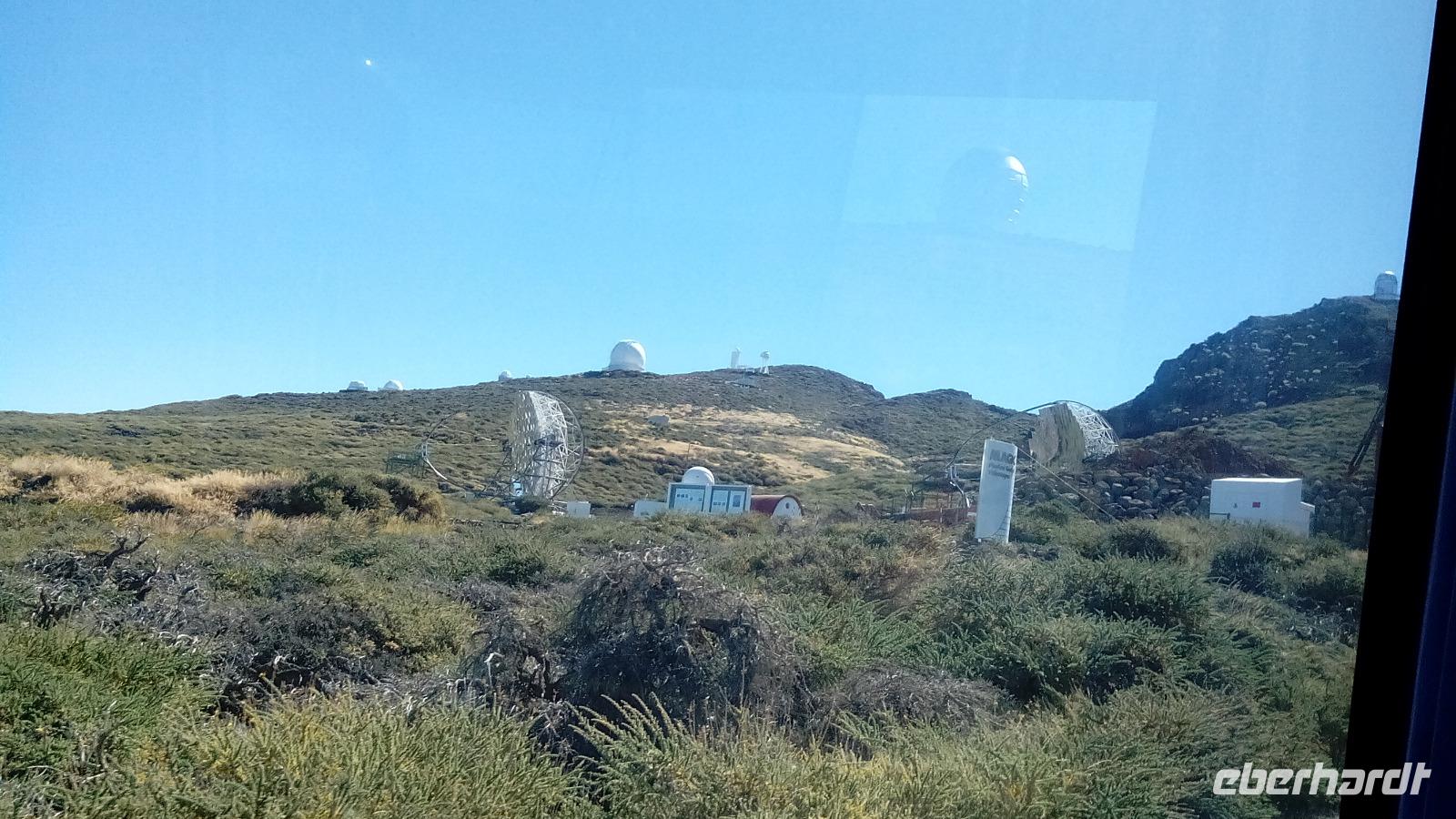 Der Mirador de los Andenes war unser erster Aussichtspunkt mit Vorgeschmack auf den Roque de los Muchachos, mit 2426 m der höchste Gipfel der Insel und des Vulkanschlotes. Bevor wir unsere kleine Wanderung auf dem 5,9 Grad kalten, aber perfekt sonnigen Kraterrand antraten, fütterten wir zwei mutig-freche Raben, wovon einer sogar bis auf die Schulter kam. Uns eröffnete sich eine beeindruckende, vielgesteinige Kraterwelt, in der man sich kaum sattfotografieren konnte. In unmittelbarer Nähe des Gipfels fuhren wir an mehreren Teleskopen vorbei, den Telescopios Magic, dem Observatorio Astrofísico, dem Gran Telescopio Canarias u.a.m.