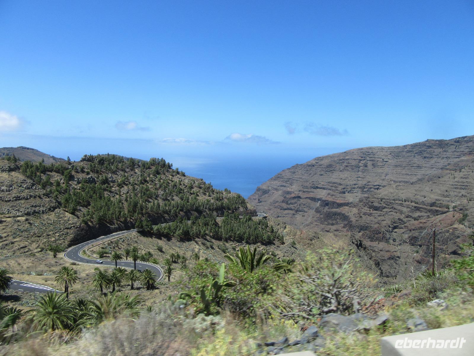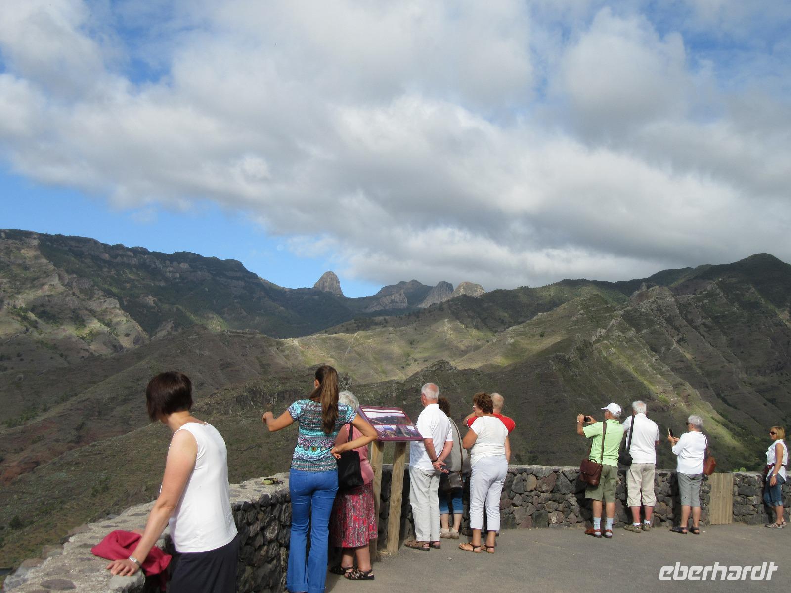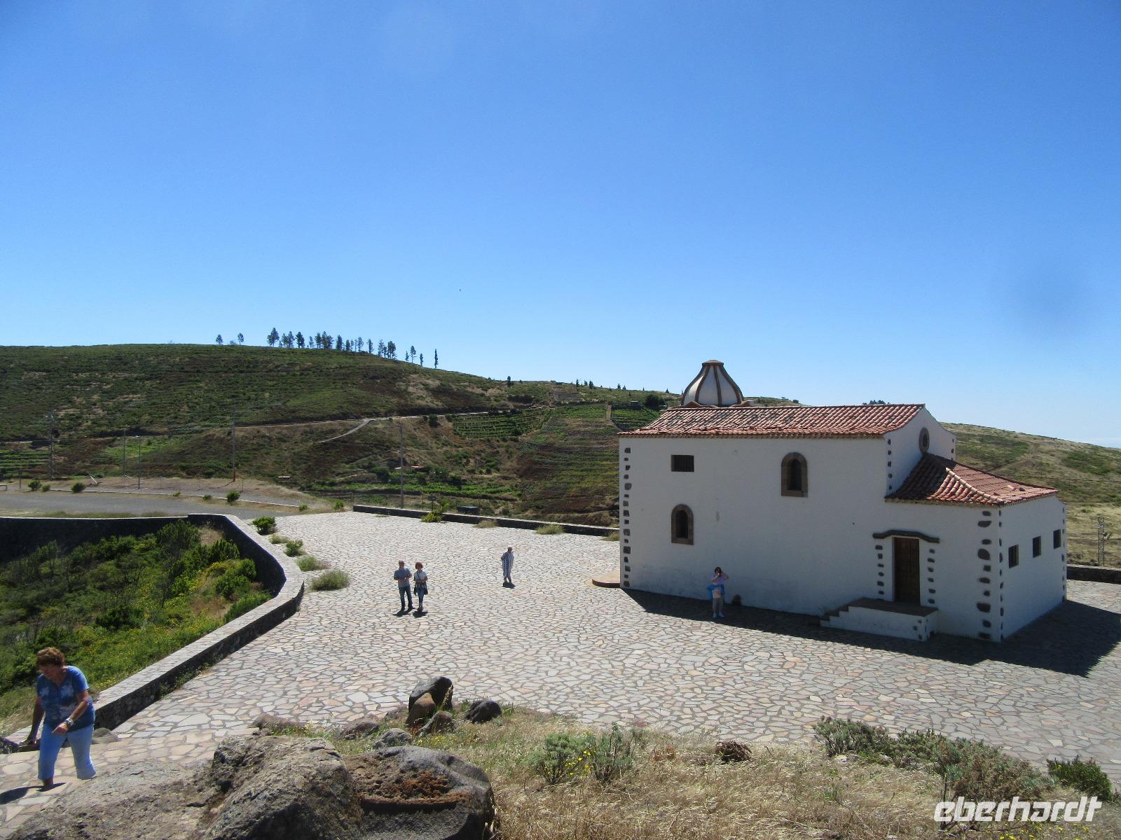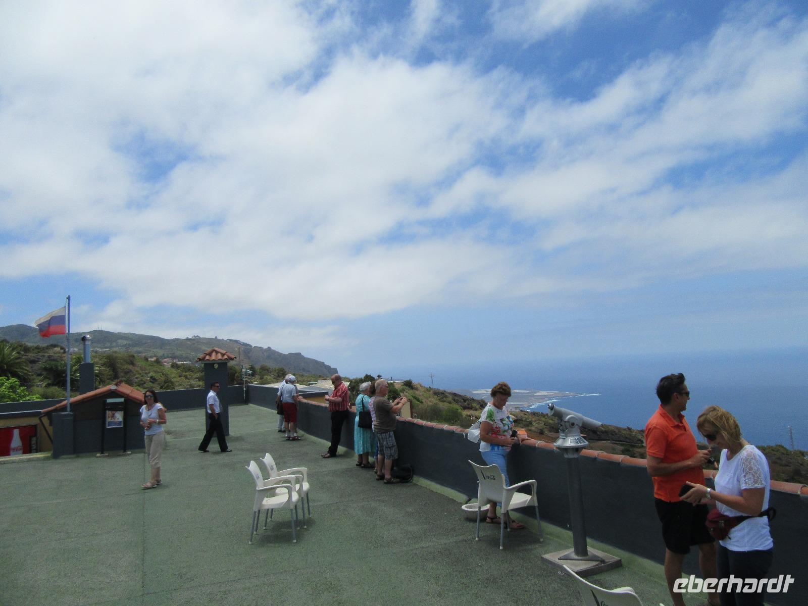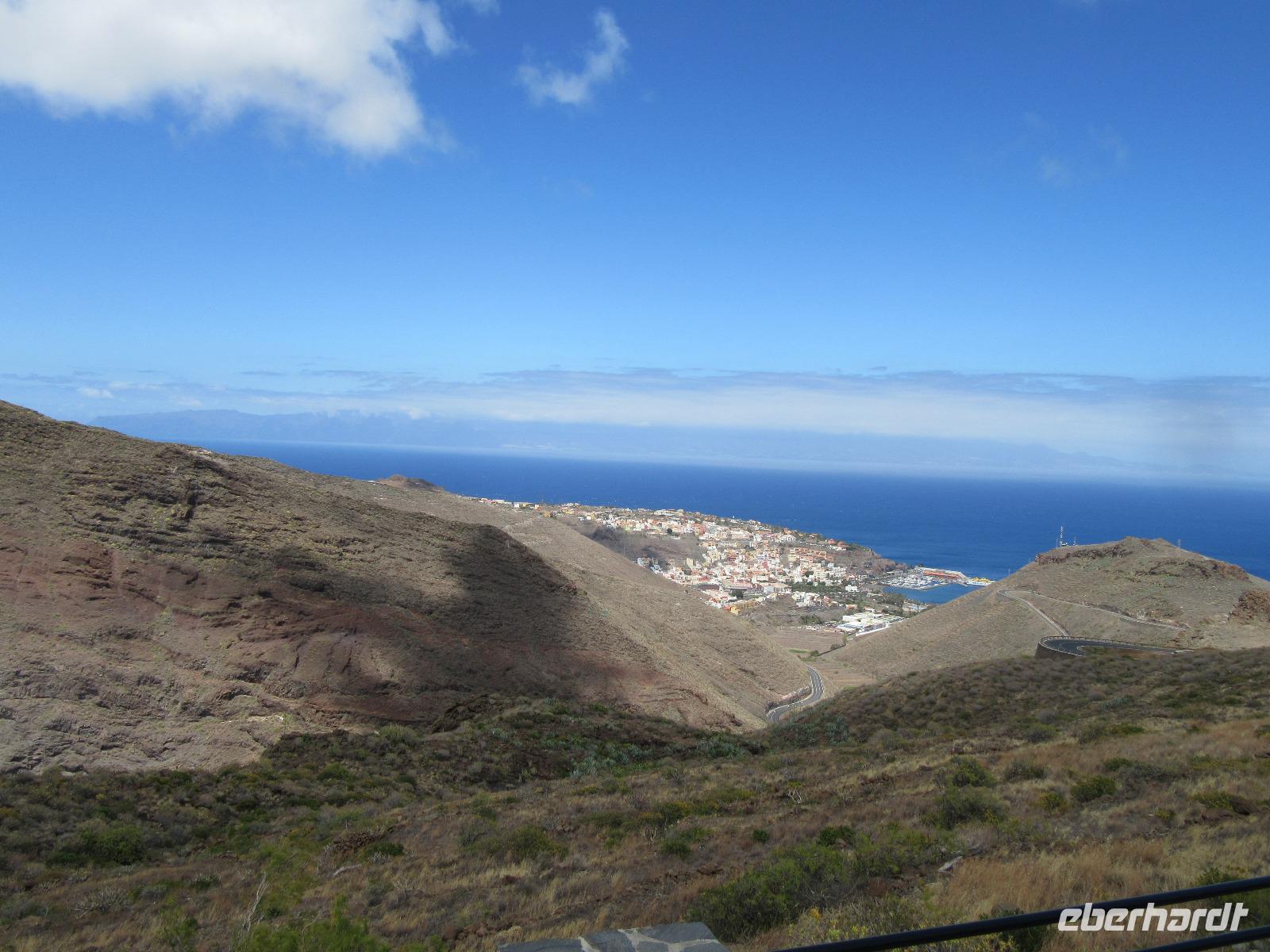 Wir fuhren bergauf und sahen die verschiedenen Schluchten (auf Spanisch Barrancos). Unser erster Stopp war an dem Aussichtspunkt Igualero, wo die San Francisco Kapelle sich befindet und das Denkmal zum Silbo Canario, der Pfeifsprache, welche zum Weltkulturerbe bei der UNESCO erklärt wurde. Von diesem Punkt bekamen wir schöne Ausblicke auf das Meer und konnten den Tafelberg sowie die Inseln El Hierro ganz klar sehen.