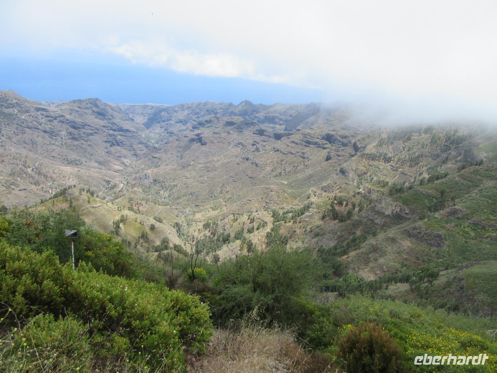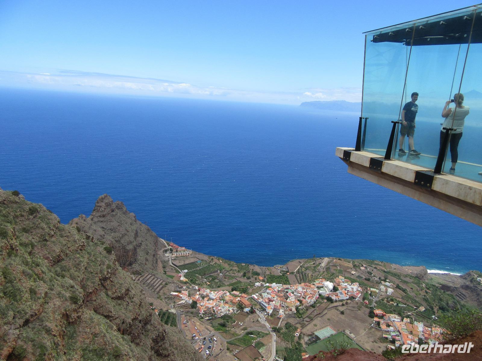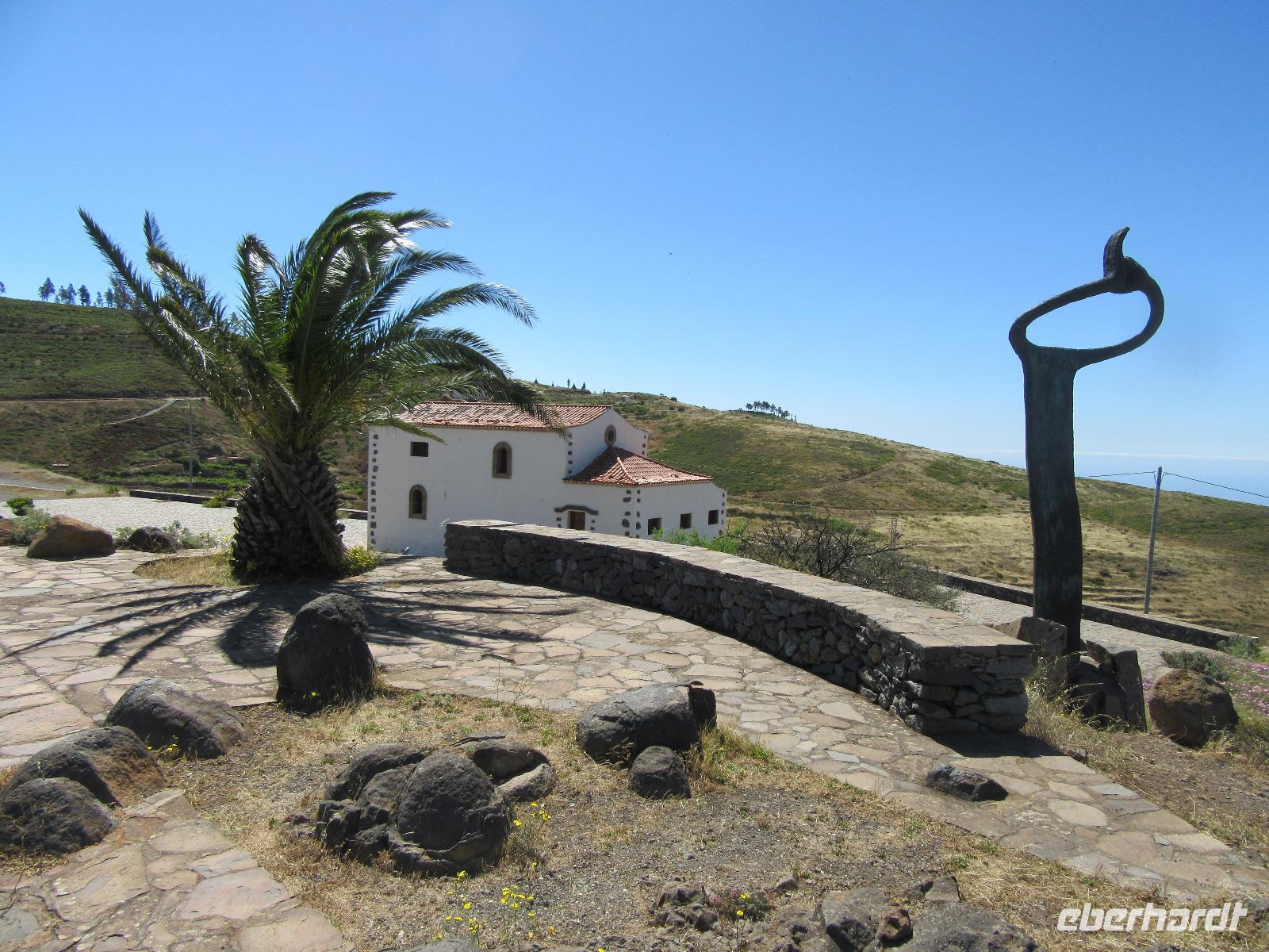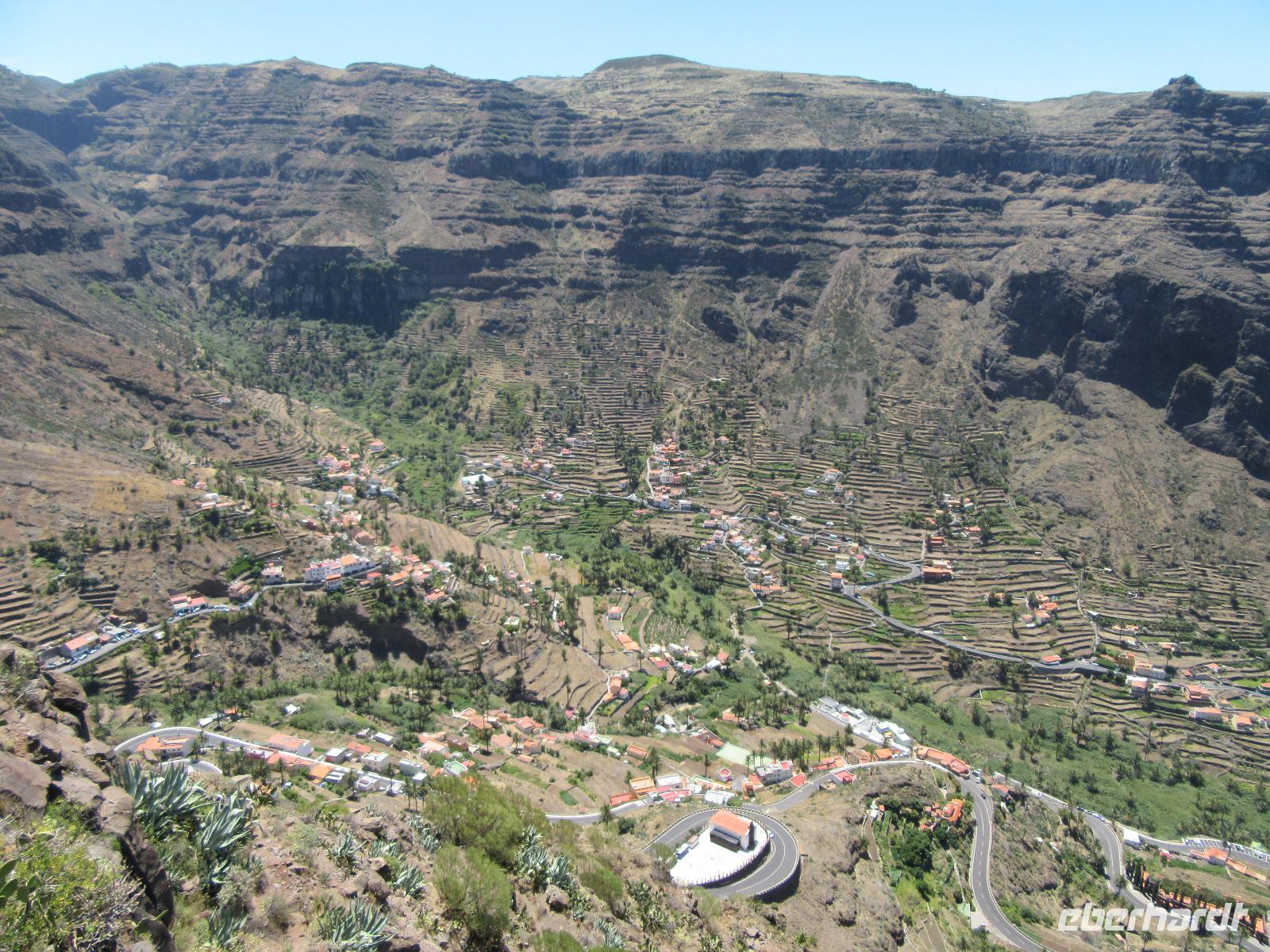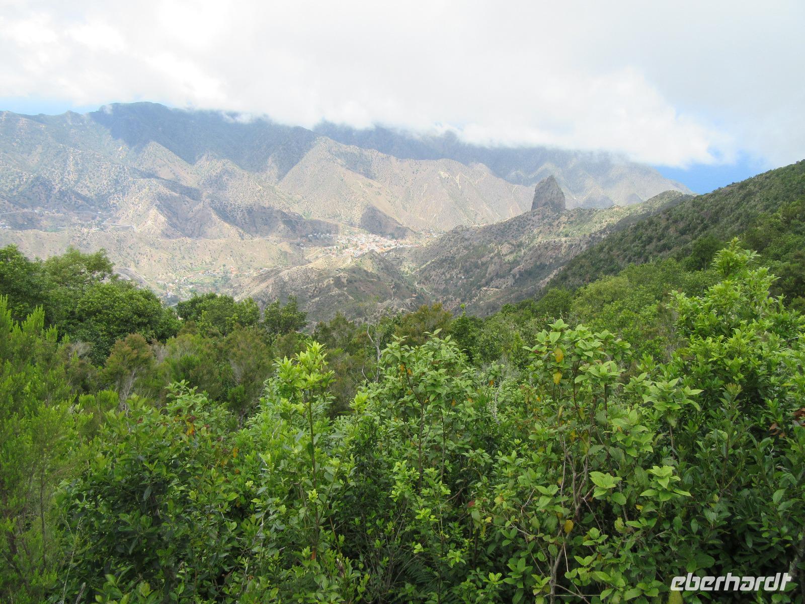 Wir fuhren bergauf und sahen die verschiedenen Schluchten (auf Spanisch Barrancos). Unser erster Stopp war an dem Aussichtspunkt Igualero, wo die San Francisco Kapelle sich befindet und das Denkmal zum Silbo Canario, der Pfeifsprache, welche zum Weltkulturerbe bei der UNESCO erklärt wurde. Von diesem Punkt bekamen wir schöne Ausblicke auf das Meer und konnten den Tafelberg sowie die Inseln El Hierro ganz klar sehen.
