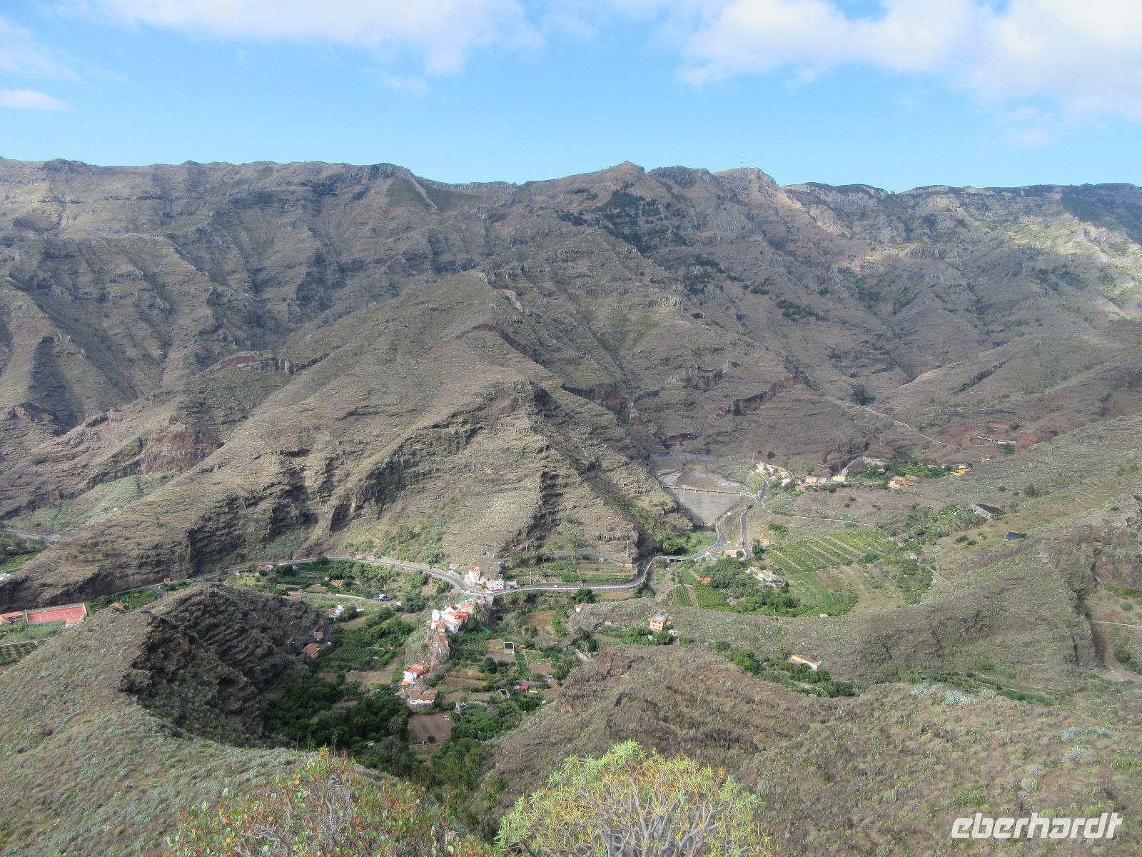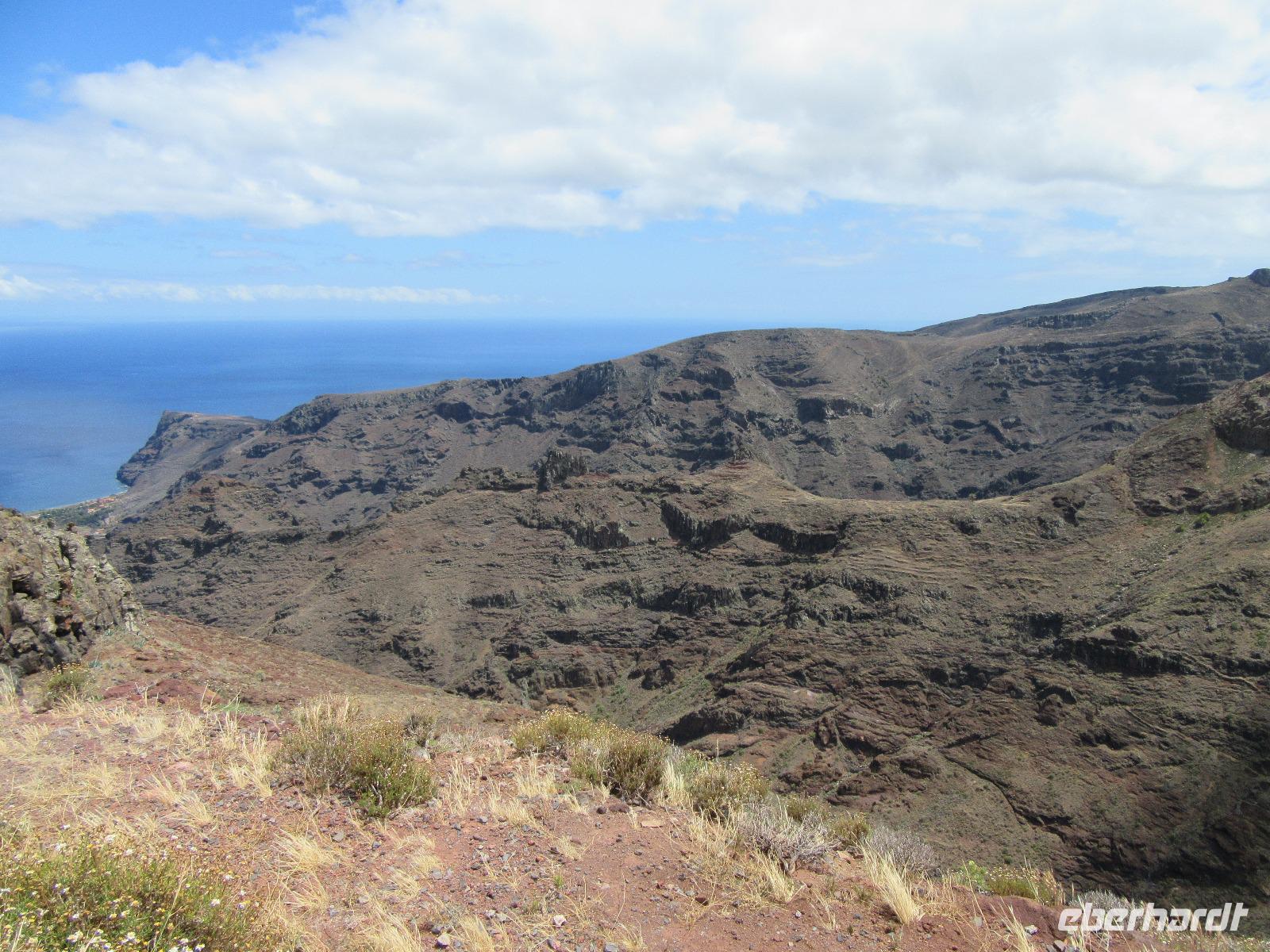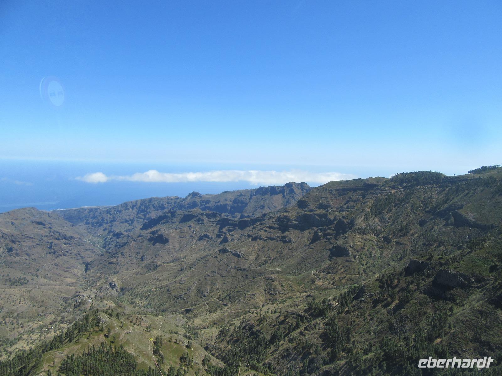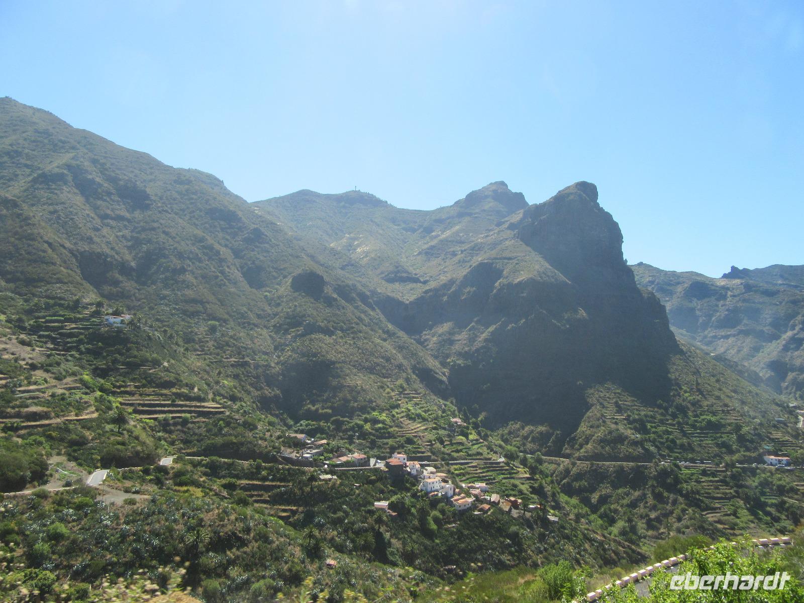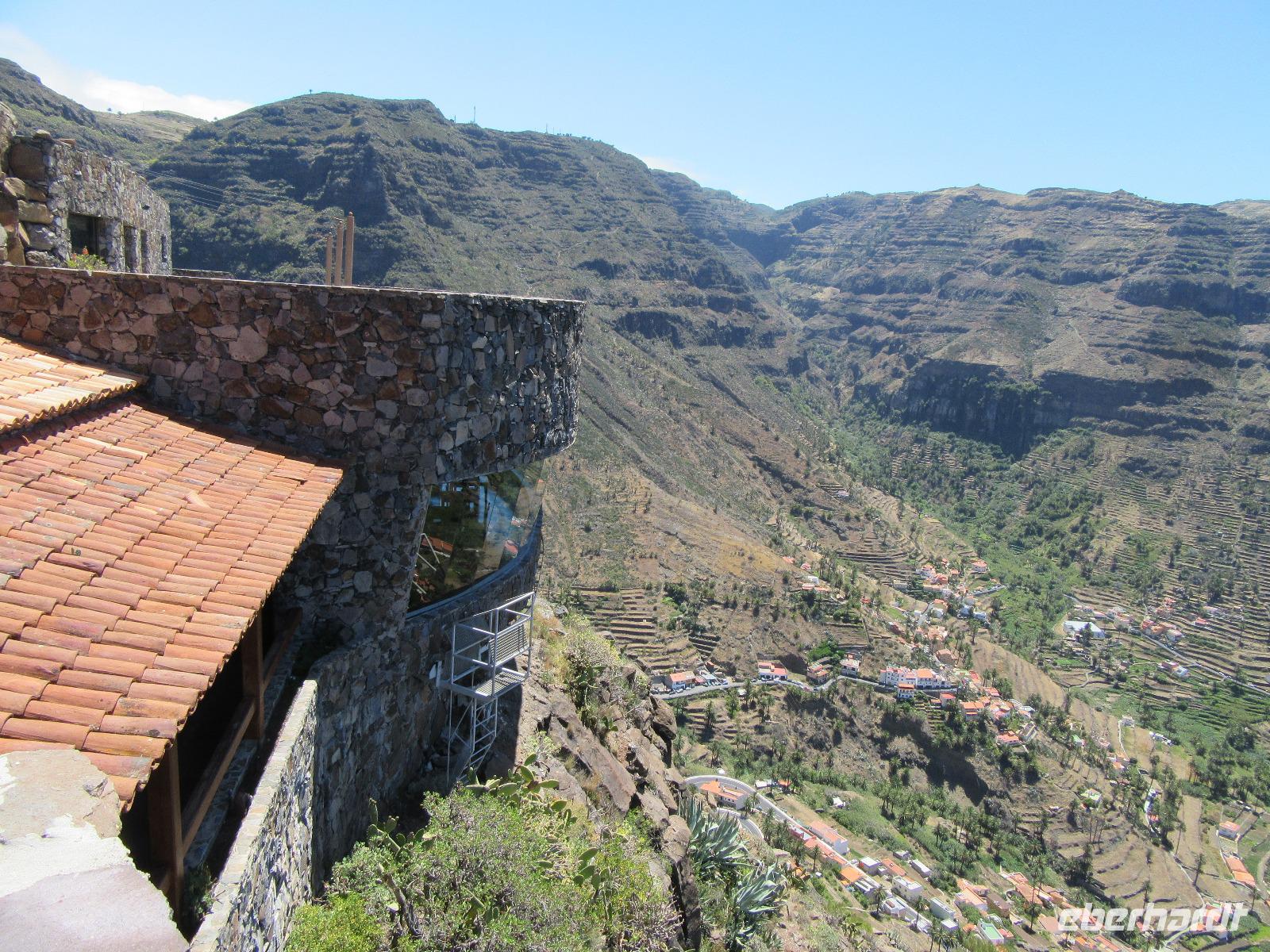 Wir fuhren bergauf und sahen die verschiedenen Schluchten (auf Spanisch Barrancos). Unser erster Stopp war an dem Aussichtspunkt Igualero, wo die San Francisco Kapelle sich befindet und das Denkmal zum Silbo Canario, der Pfeifsprache, welche zum Weltkulturerbe bei der UNESCO erklärt wurde. Von diesem Punkt bekamen wir schöne Ausblicke auf das Meer und konnten den Tafelberg sowie die Inseln El Hierro ganz klar sehen.