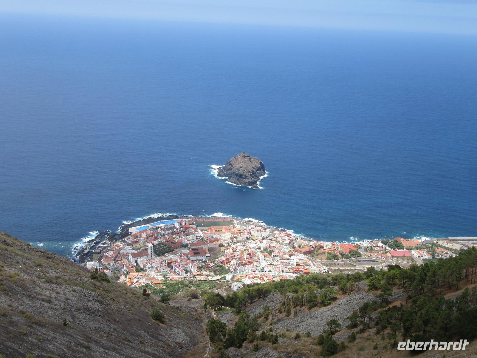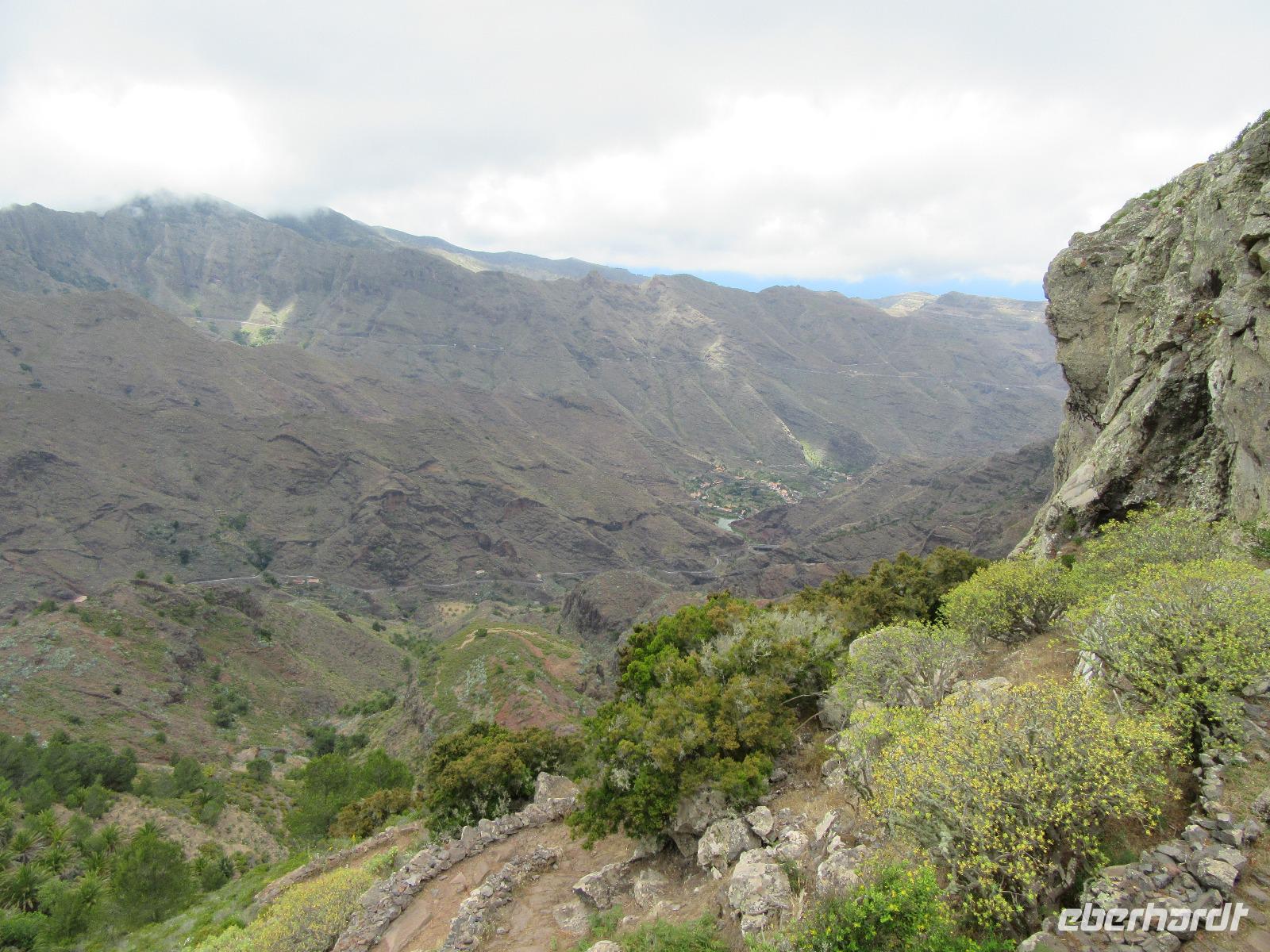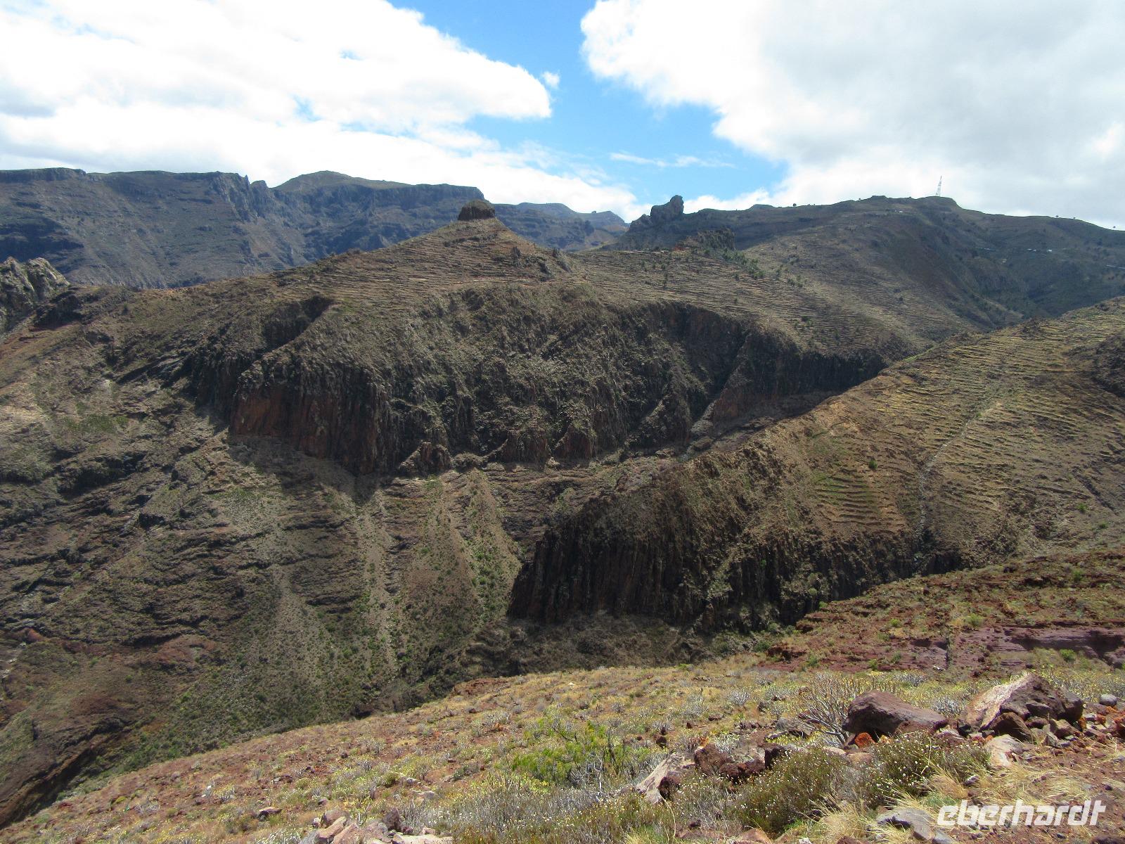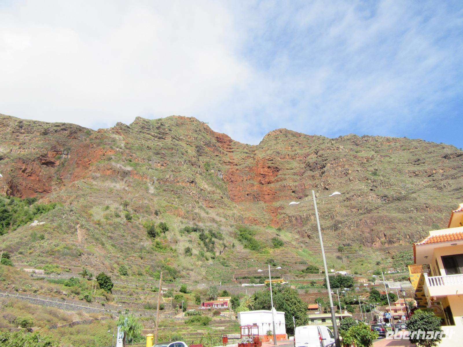 Wir fuhren bergauf und sahen die verschiedenen Schluchten (auf Spanisch Barrancos). Unser erster Stopp war an dem Aussichtspunkt Igualero, wo die San Francisco Kapelle sich befindet und das Denkmal zum Silbo Canario, der Pfeifsprache, welche zum Weltkulturerbe bei der UNESCO erklärt wurde. Von diesem Punkt bekamen wir schöne Ausblicke auf das Meer und konnten den Tafelberg sowie die Inseln El Hierro ganz klar sehen.