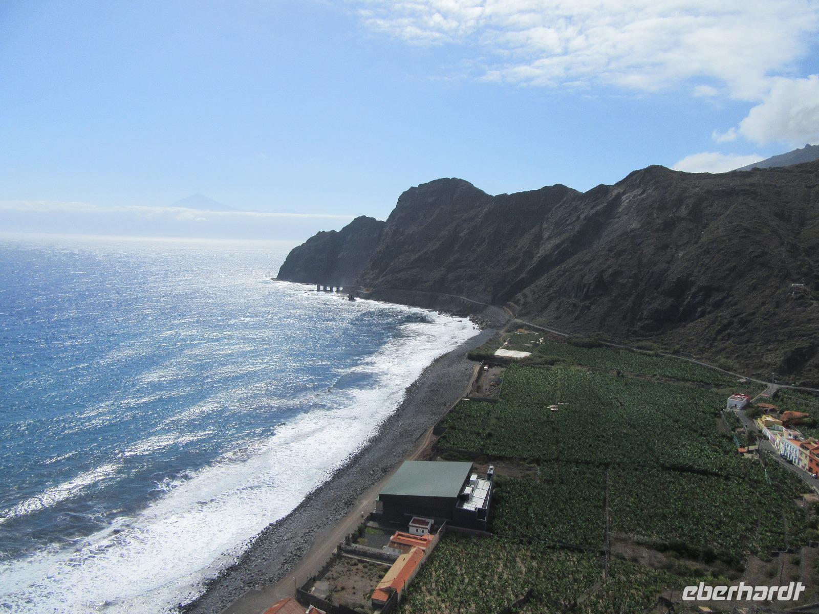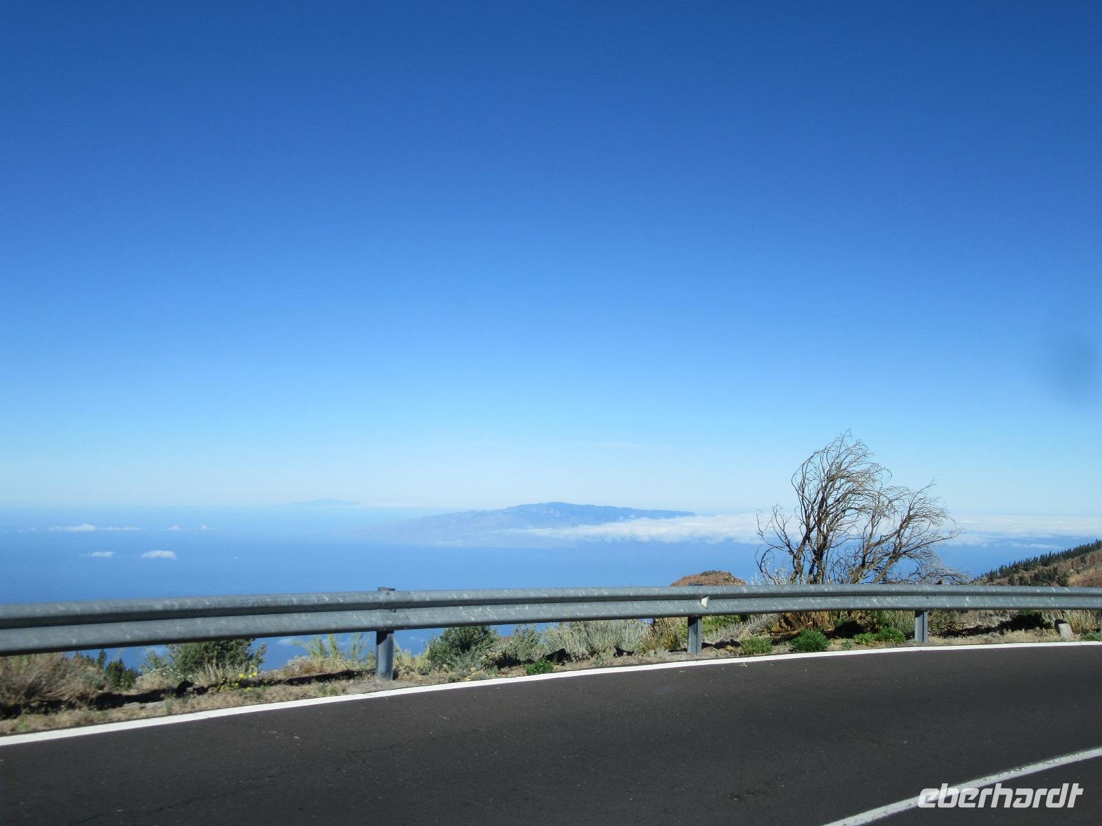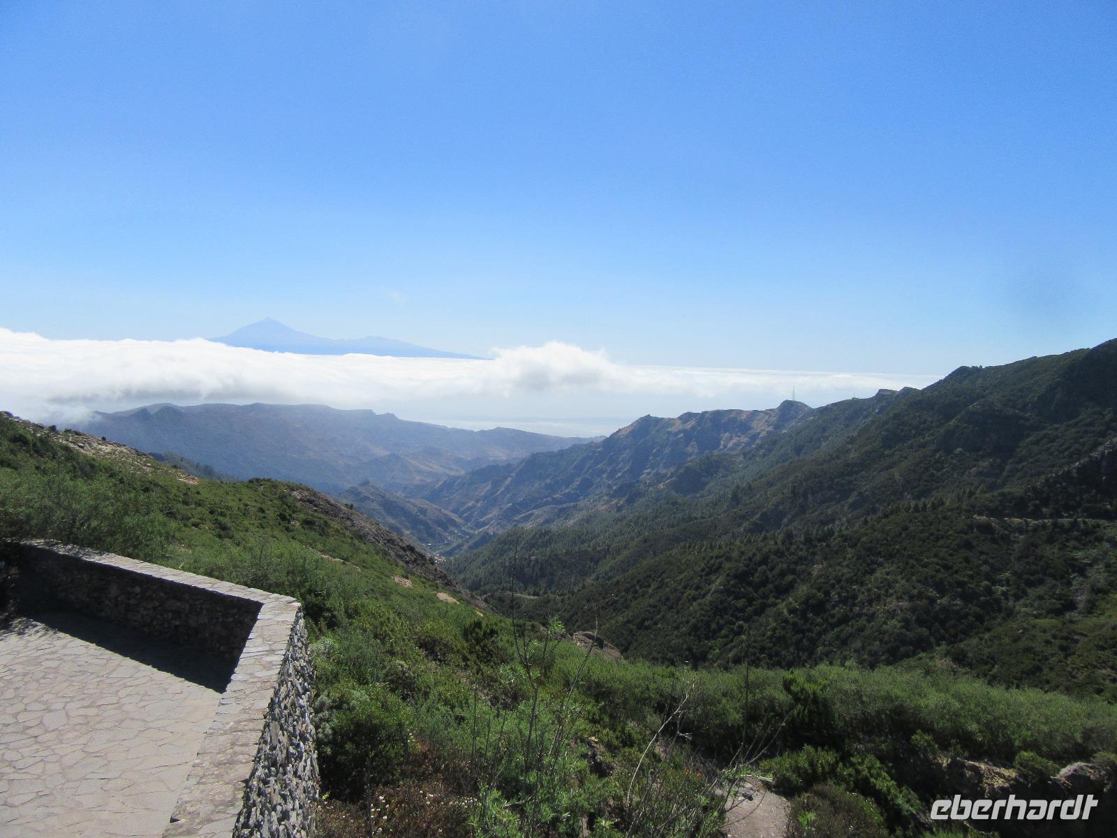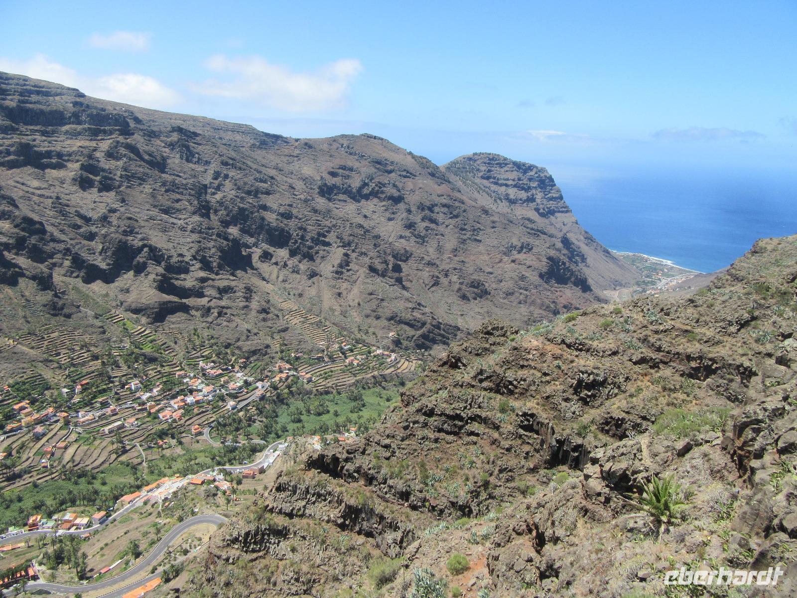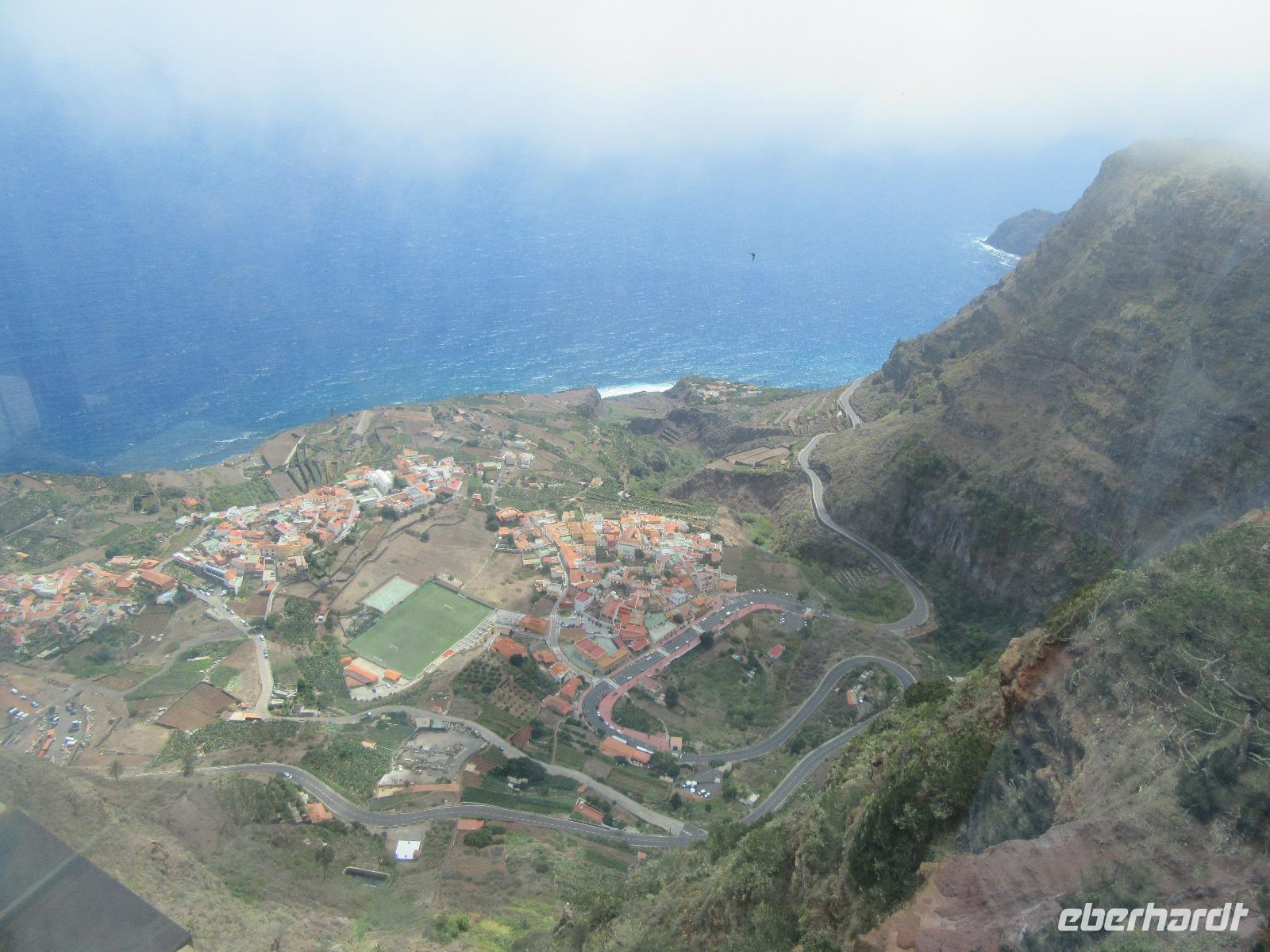 Wir fuhren bergauf und sahen die verschiedenen Schluchten (auf Spanisch Barrancos). Unser erster Stopp war an dem Aussichtspunkt Igualero, wo die San Francisco Kapelle sich befindet und das Denkmal zum Silbo Canario, der Pfeifsprache, welche zum Weltkulturerbe bei der UNESCO erklärt wurde. Von diesem Punkt bekamen wir schöne Ausblicke auf das Meer und konnten den Tafelberg sowie die Inseln El Hierro ganz klar sehen.