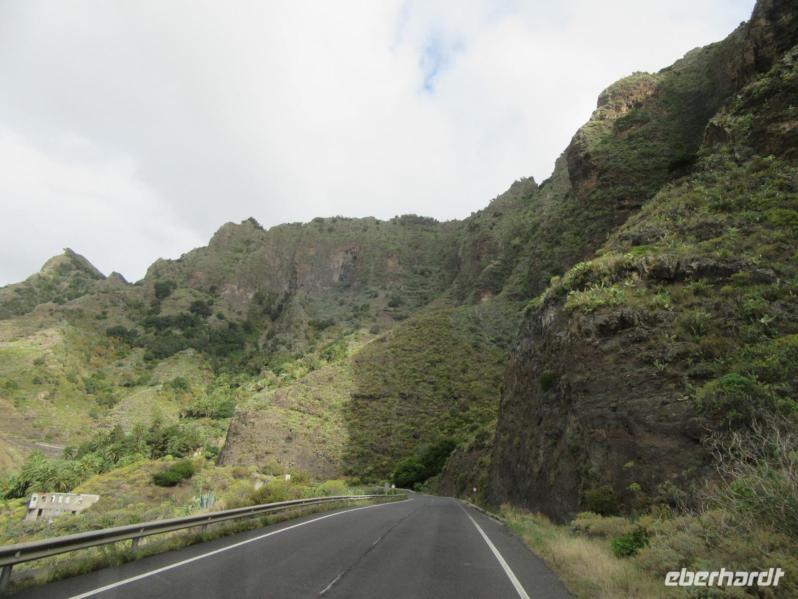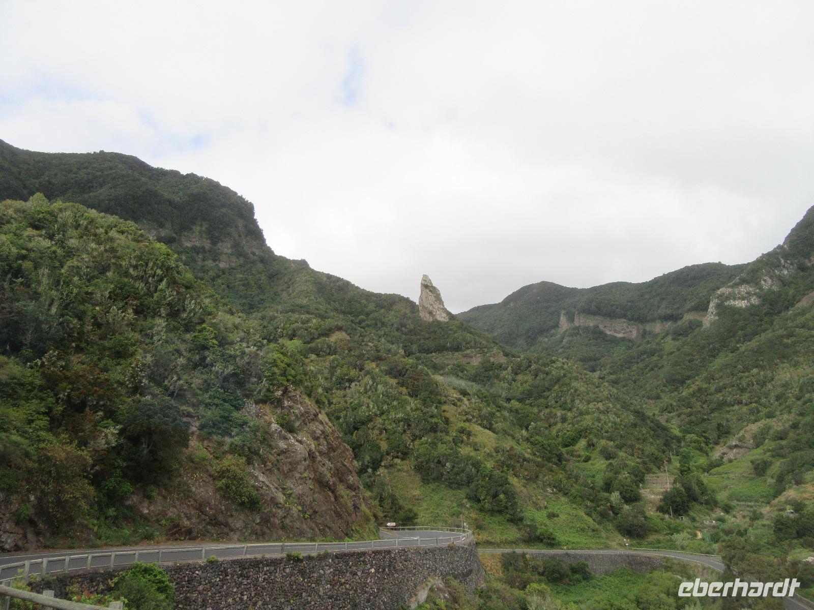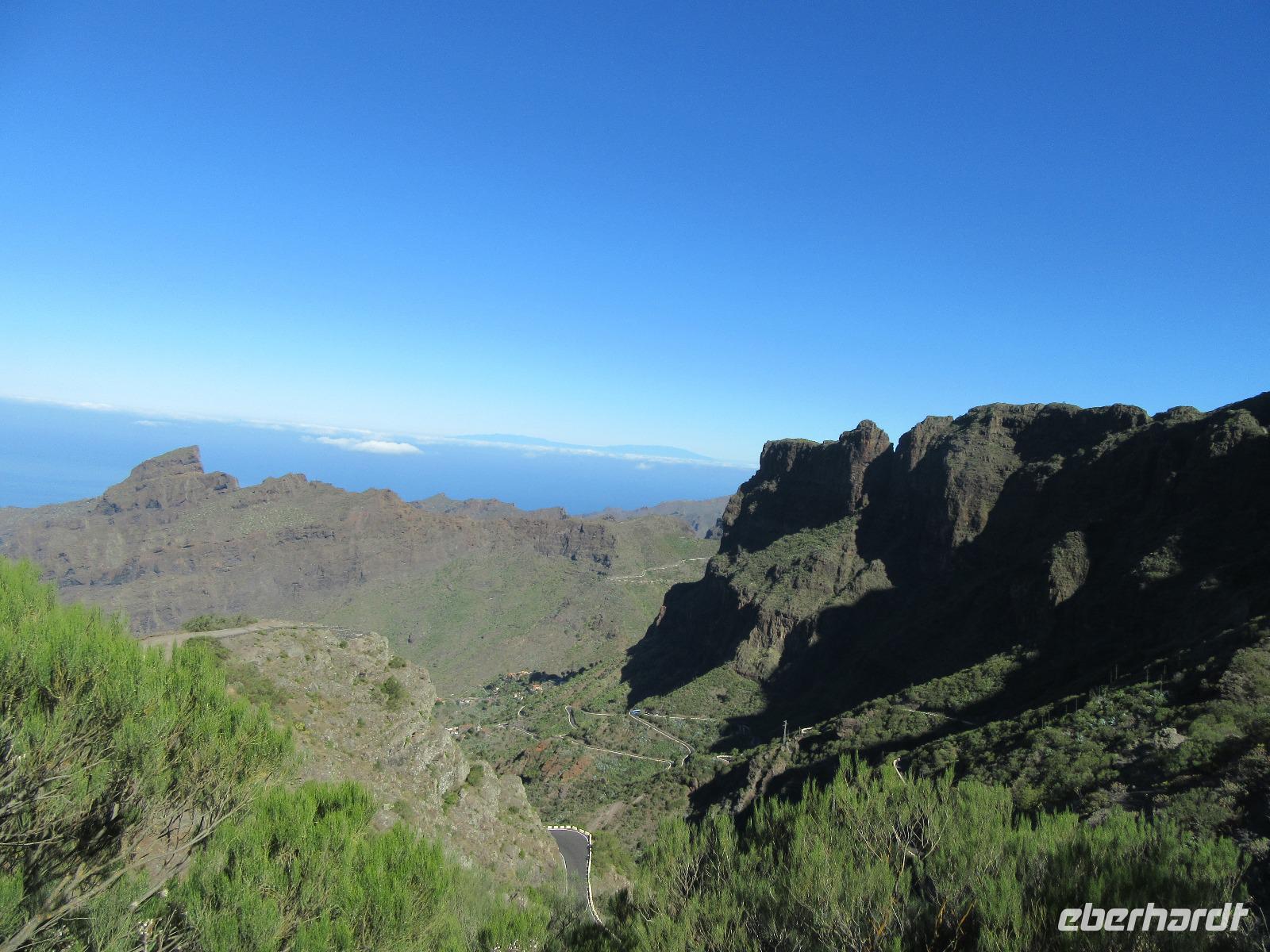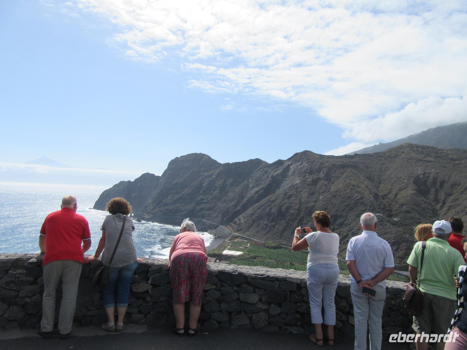 Dann began unser Abenteuer über die Serpetinien-Straße nach Masca. Erst nach oben bis zum Aussichtspunkt Cherfe, welcher den gleichen Namen des König-Guanche aus dieser Region bekam. Auf diesem Punkt genossen wir wunderschönen Blick auf Masca und die Hinterseite des Gigantes-Felsen. Natürlich, fuhren wir nicht zurück, sondern weiter die Serpentinen -Straße runter durch die berühmten lustigen oder komplizierten Kurven...Unser Busfahrer Fernando hatte keinen Führerschein, aber nach diesem Tag wird er eine Lizenz bekommen.