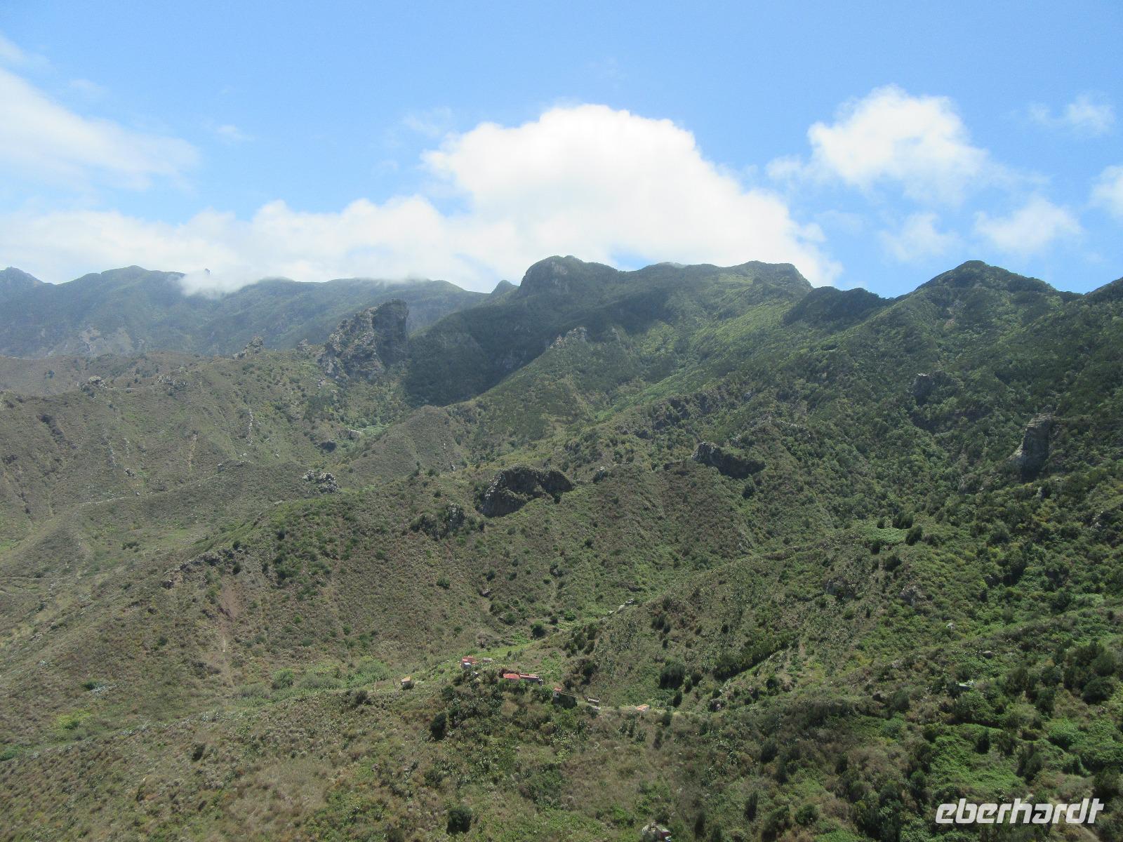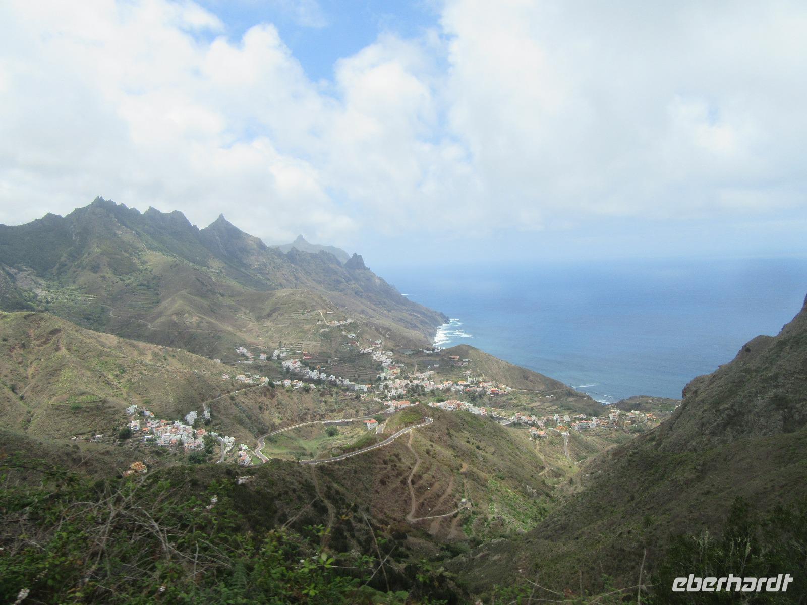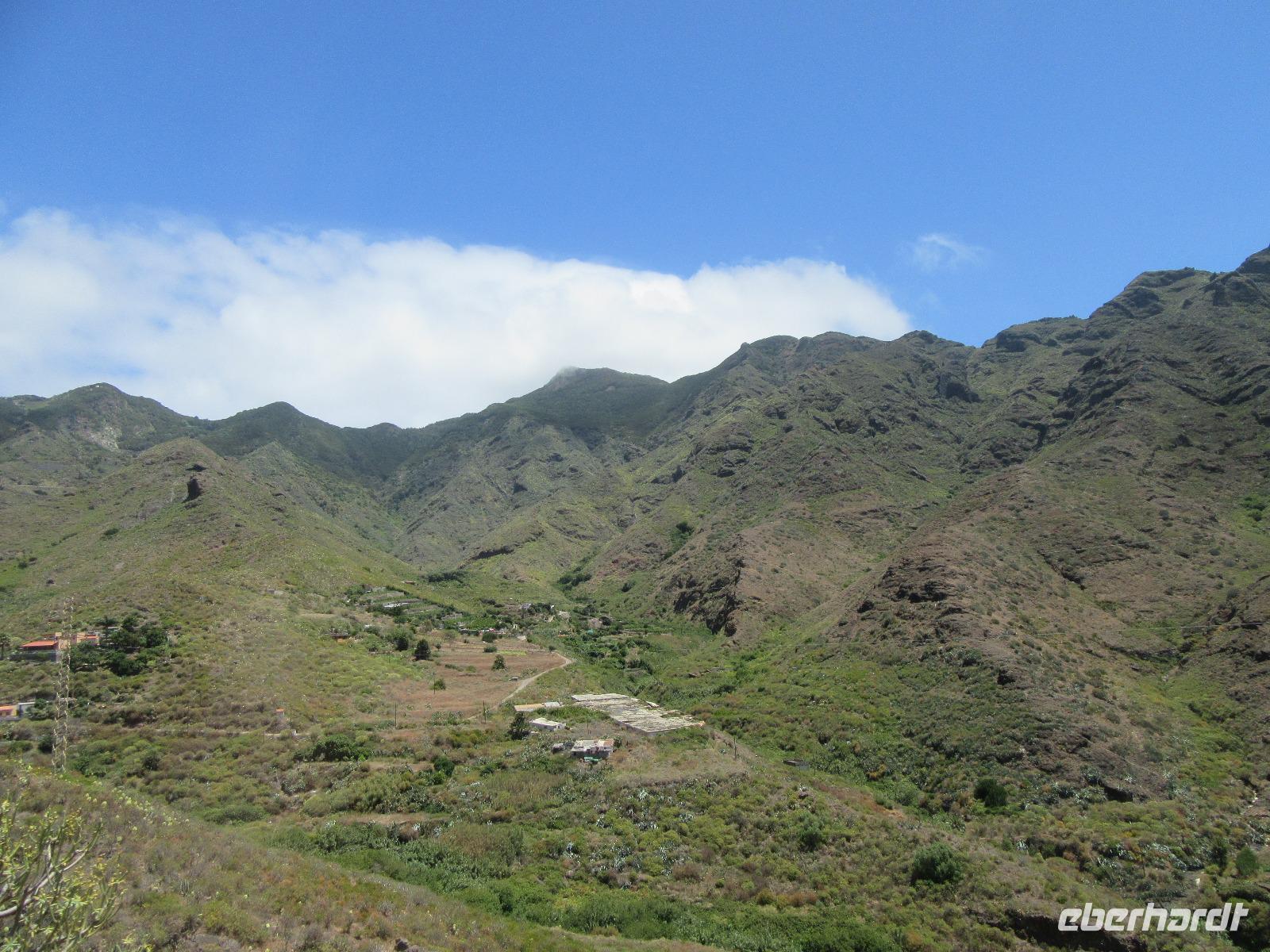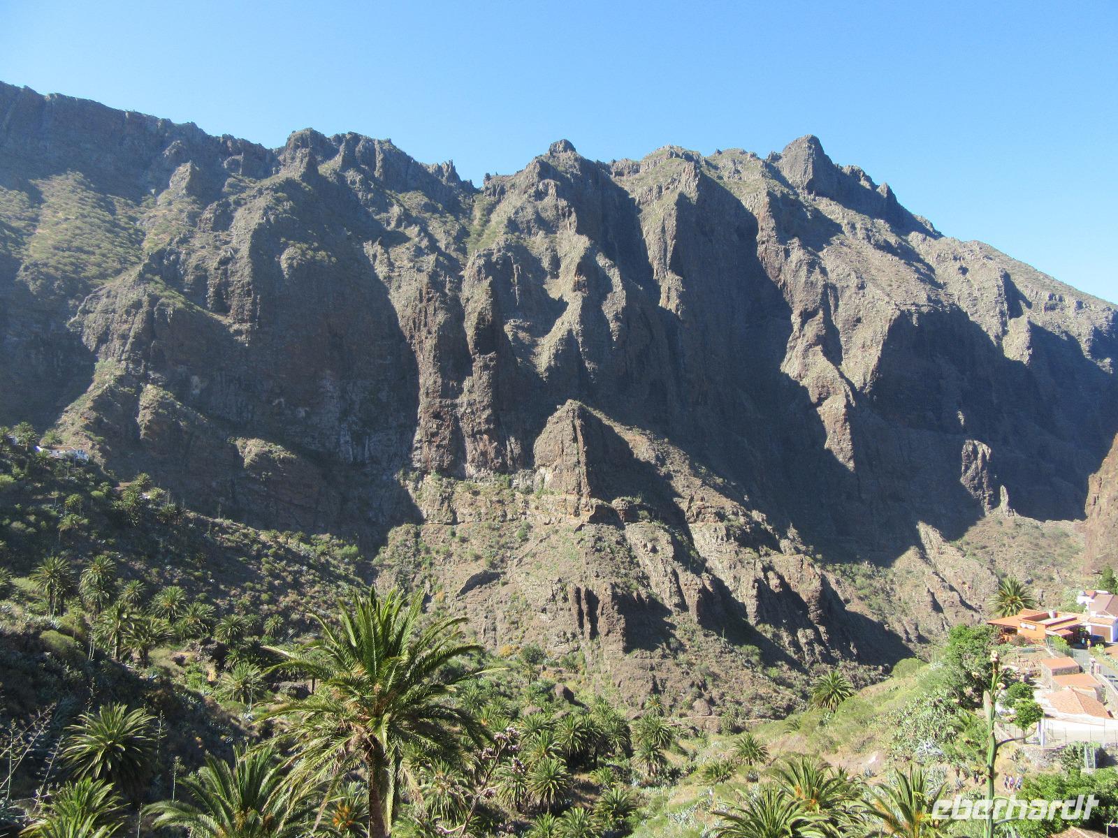 Dann began unser Abenteuer über die Serpetinien-Straße nach Masca. Erst nach oben bis zum Aussichtspunkt Cherfe, welcher den gleichen Namen des König-Guanche aus dieser Region bekam. Auf diesem Punkt genossen wir wunderschönen Blick auf Masca und die Hinterseite des Gigantes-Felsen. Natürlich, fuhren wir nicht zurück, sondern weiter die Serpentinen -Straße runter durch die berühmten lustigen oder komplizierten Kurven...Unser Busfahrer Fernando hatte keinen Führerschein, aber nach diesem Tag wird er eine Lizenz bekommen.