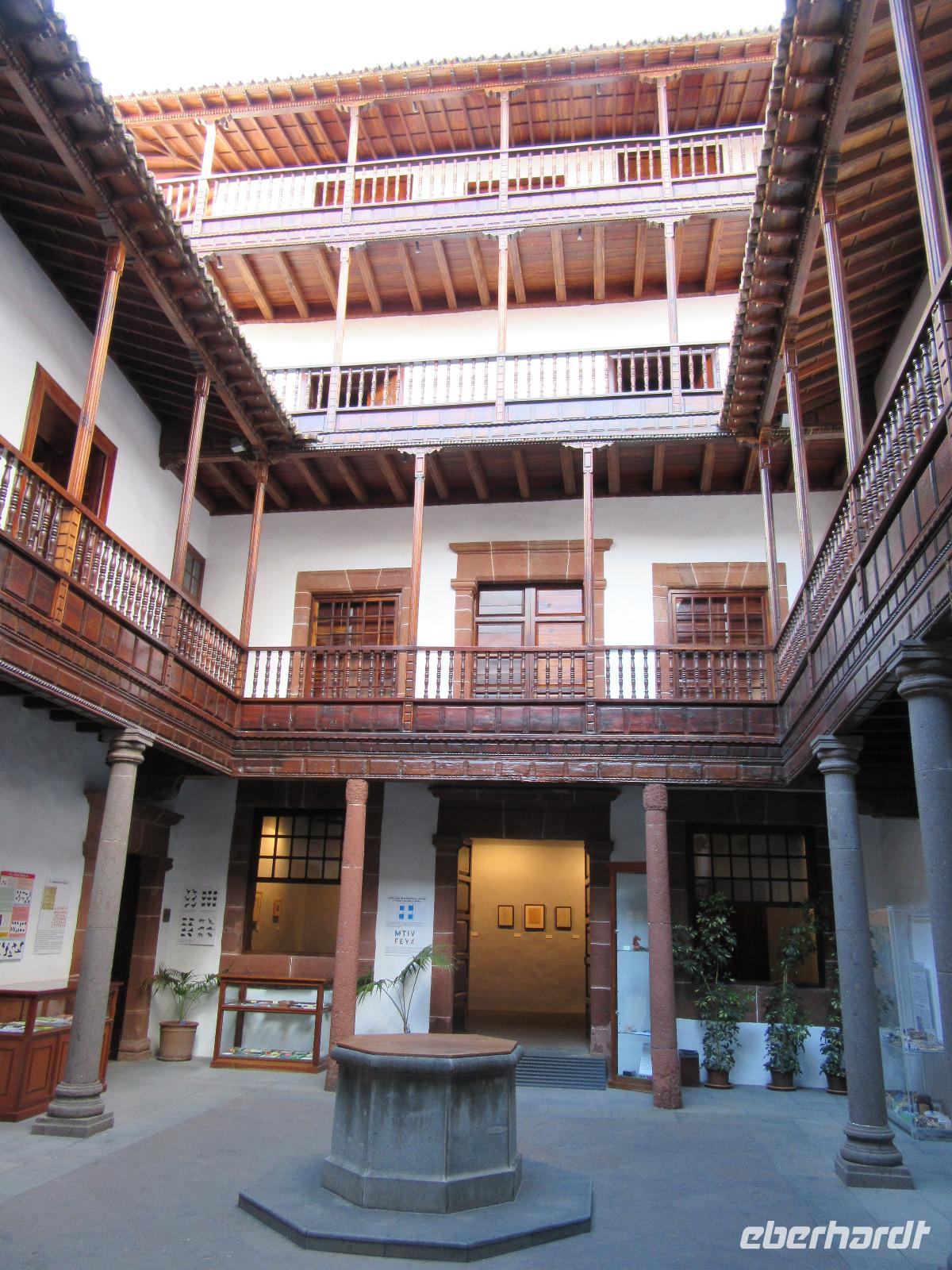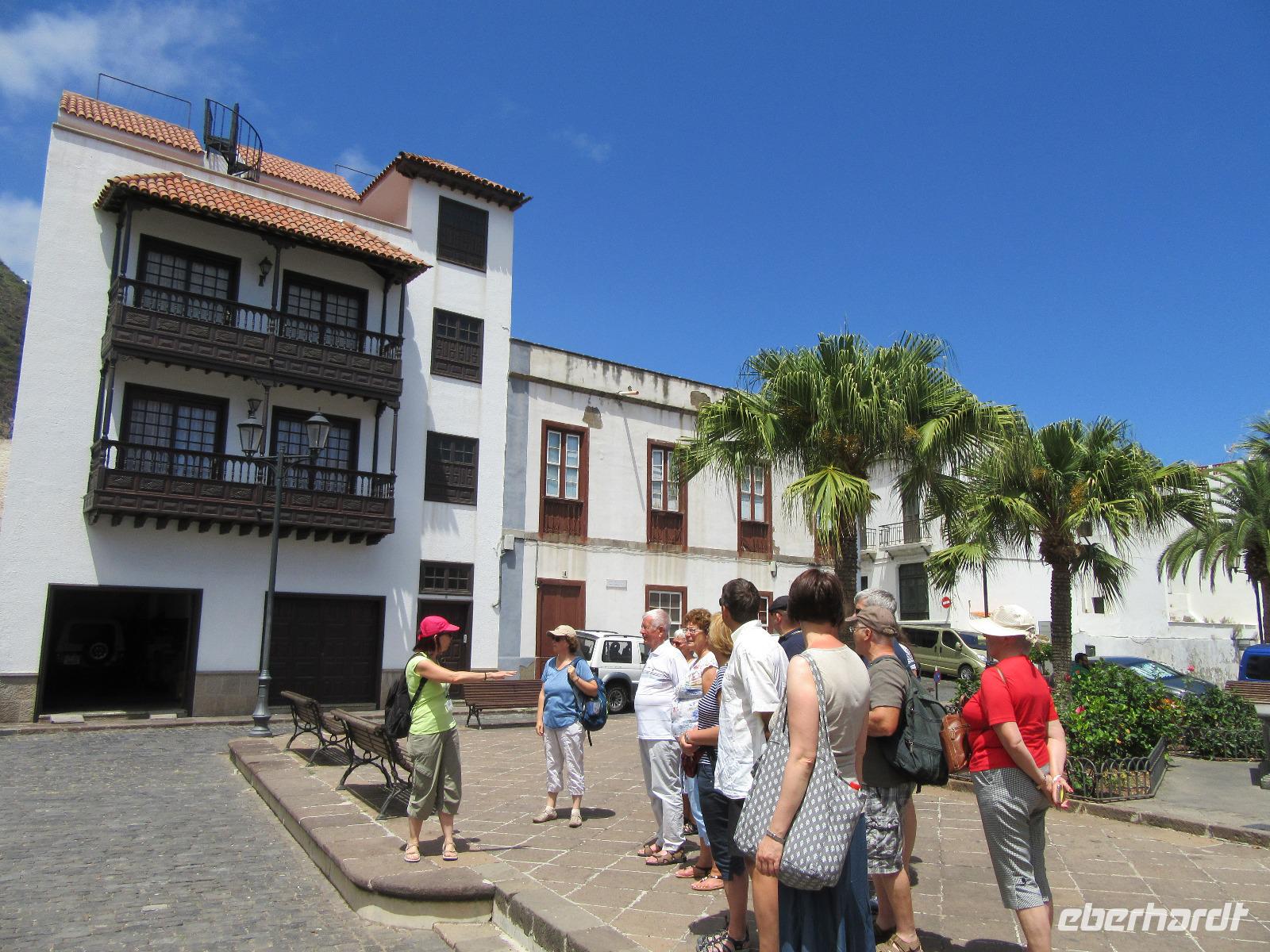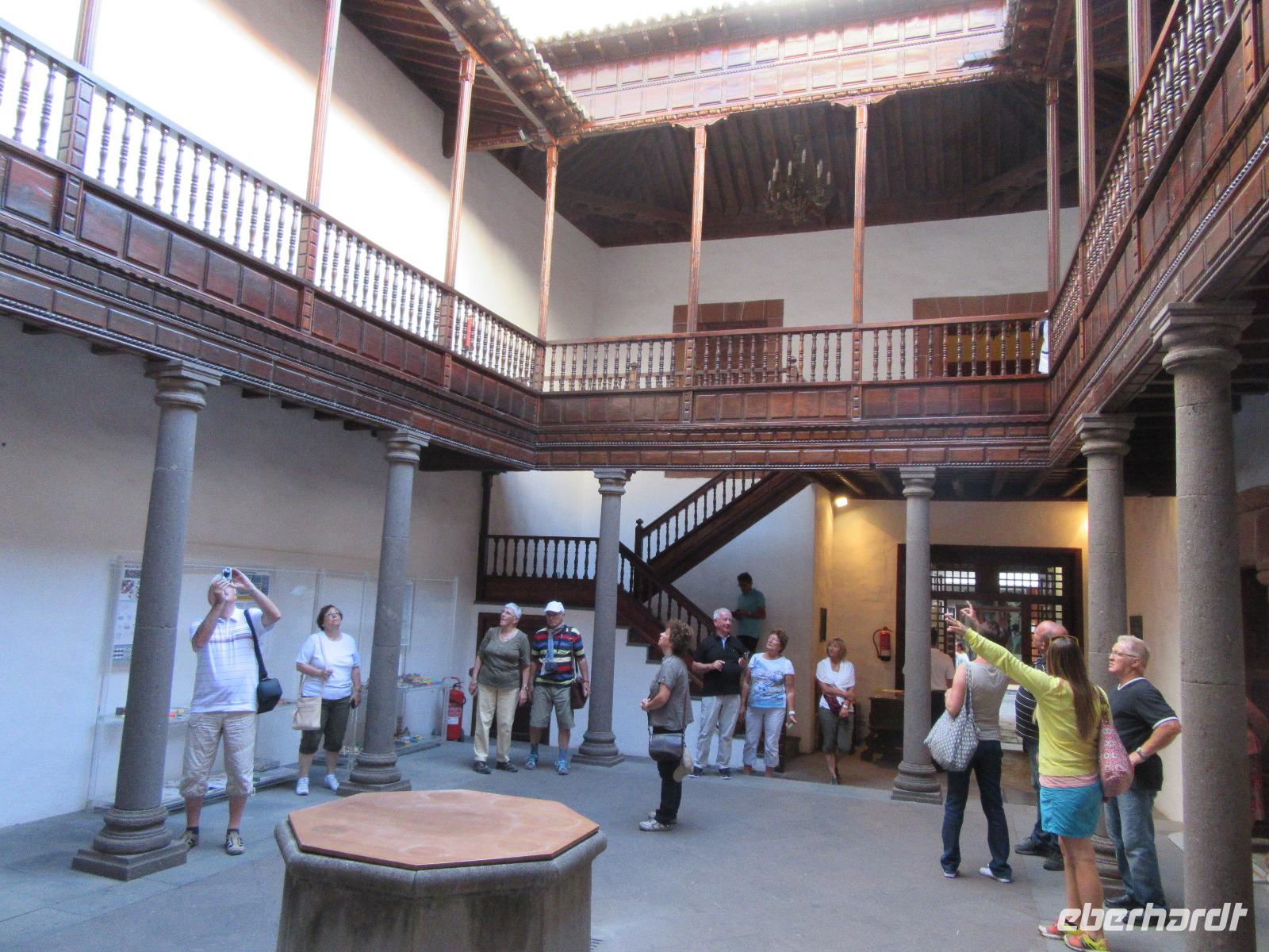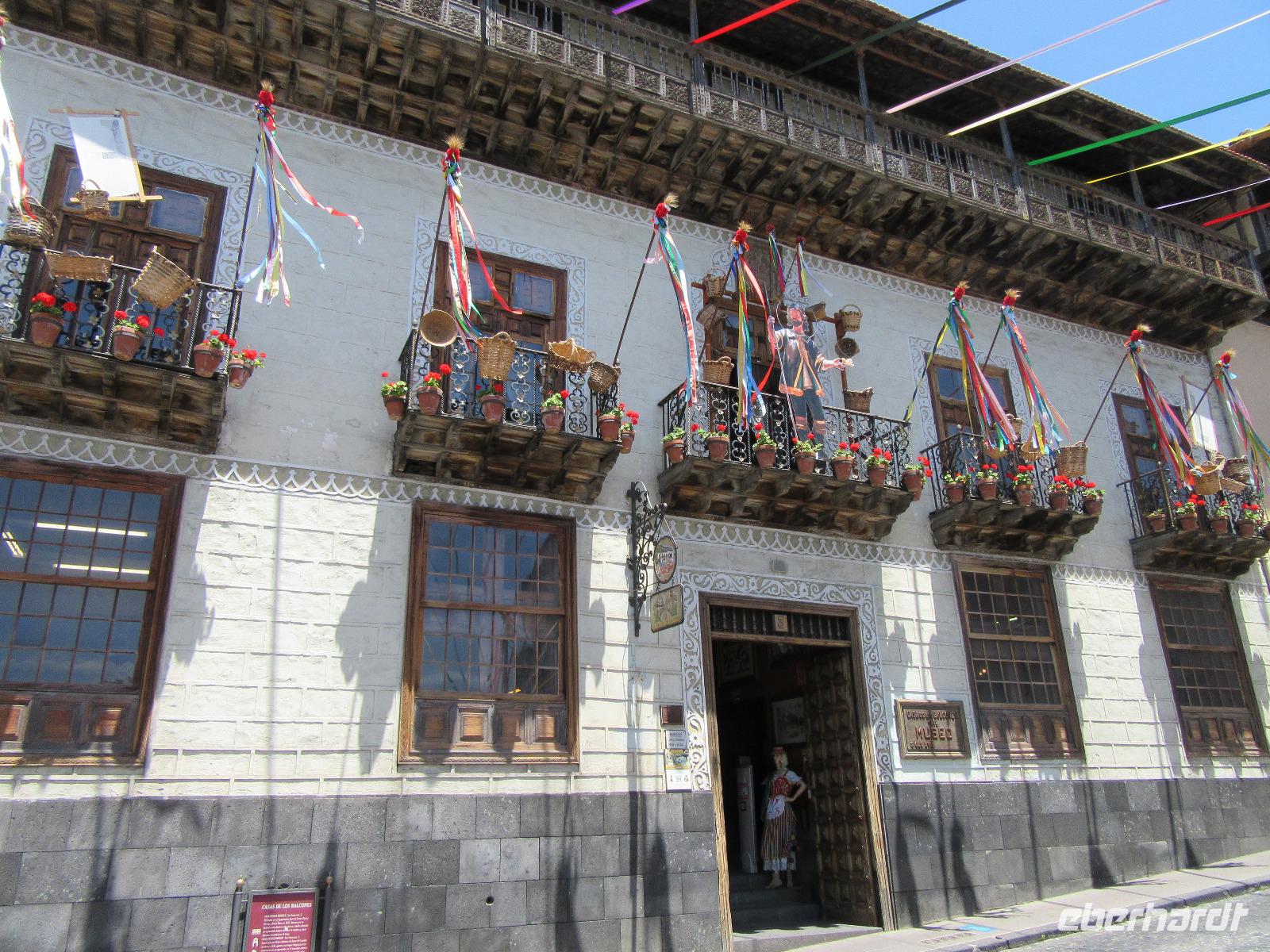 Unser heutiger Tagesausflug begann in der Hauptstadt Santa Cruz de La Palma. Bei einem Spaziergang sind wir über die Hauptstraße gelaufen, und sahen auf unserem Weg ein traditionellen Innenhof mit Holzbalkons und Holzdecken. Diese traditionelle Holzarbeit haben wir auch im Rathaus gesehen, gegenüber der Hauptkirche. Da endet die berühmte Prozession Bajada de la Virgen. Es ging weiter zur Markthalle, wo wir einen typischen Zuckerrohrsaft probierten. Wir liefen auch durch die verschiedenen Straßen, um die typischen Holz-Balkone mit den wunderschönen Blumen zu sehen. Leider sahen wir nicht den Balkonen-Mann "Chico de los Balcones". Unsere Führung hat in den Galeon Santa María neben der La Palma-Berger geendet.