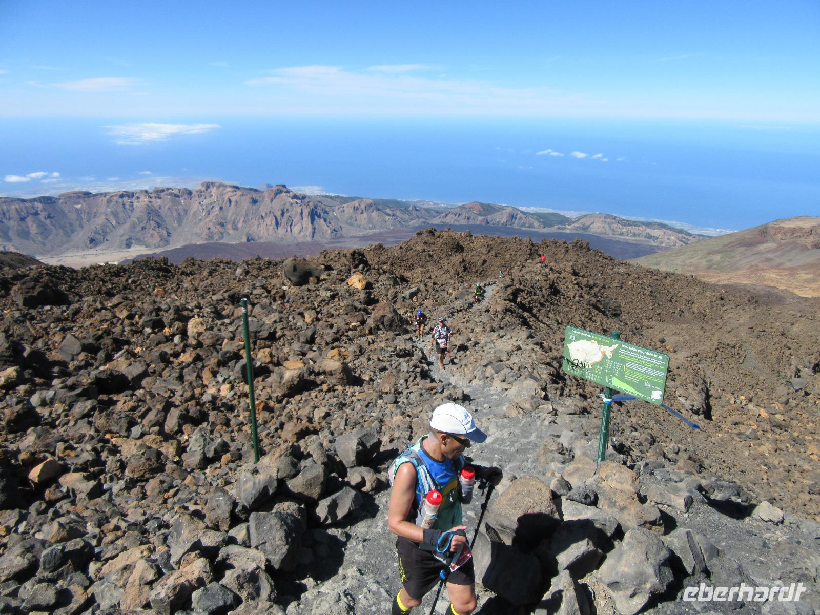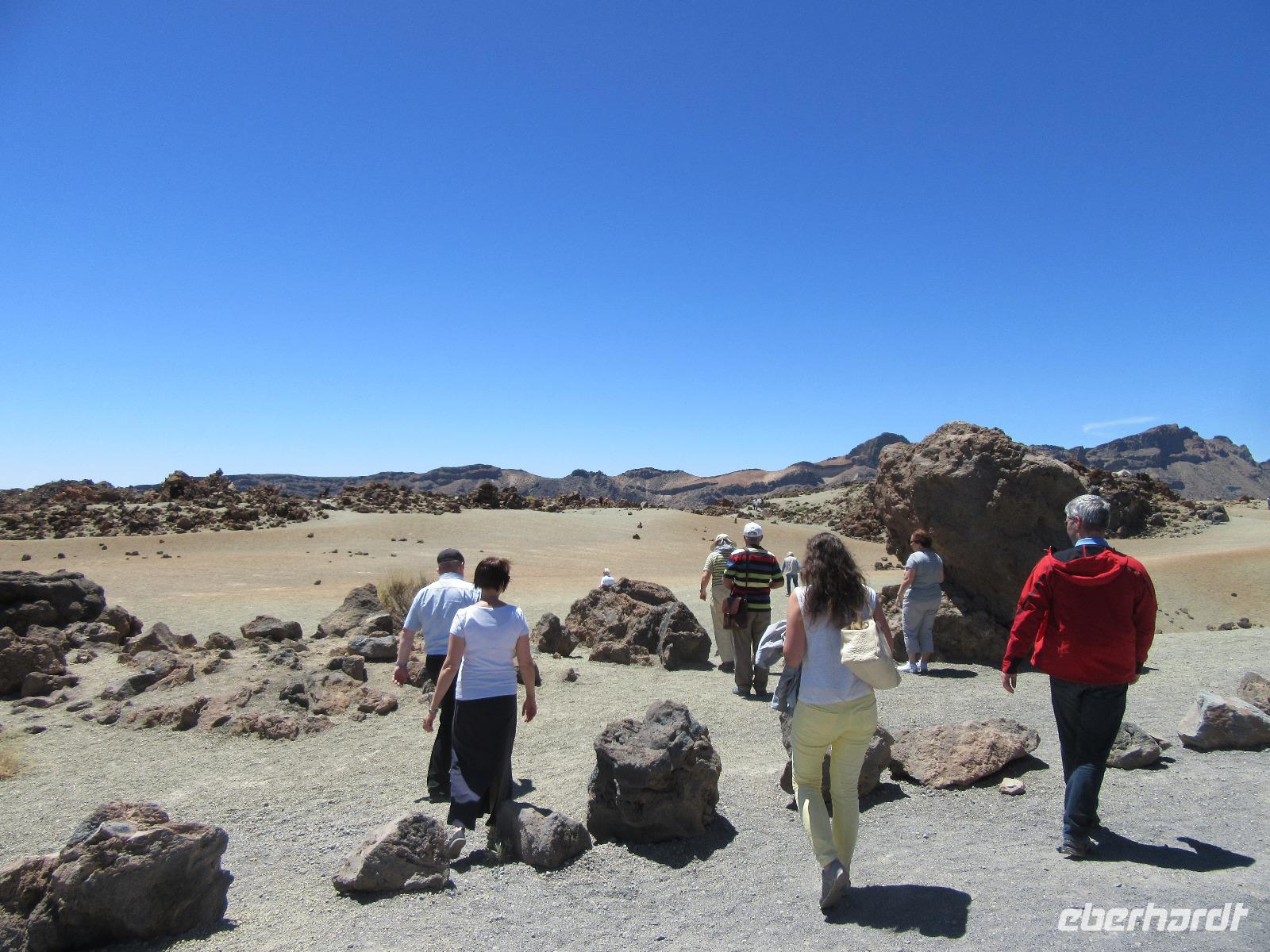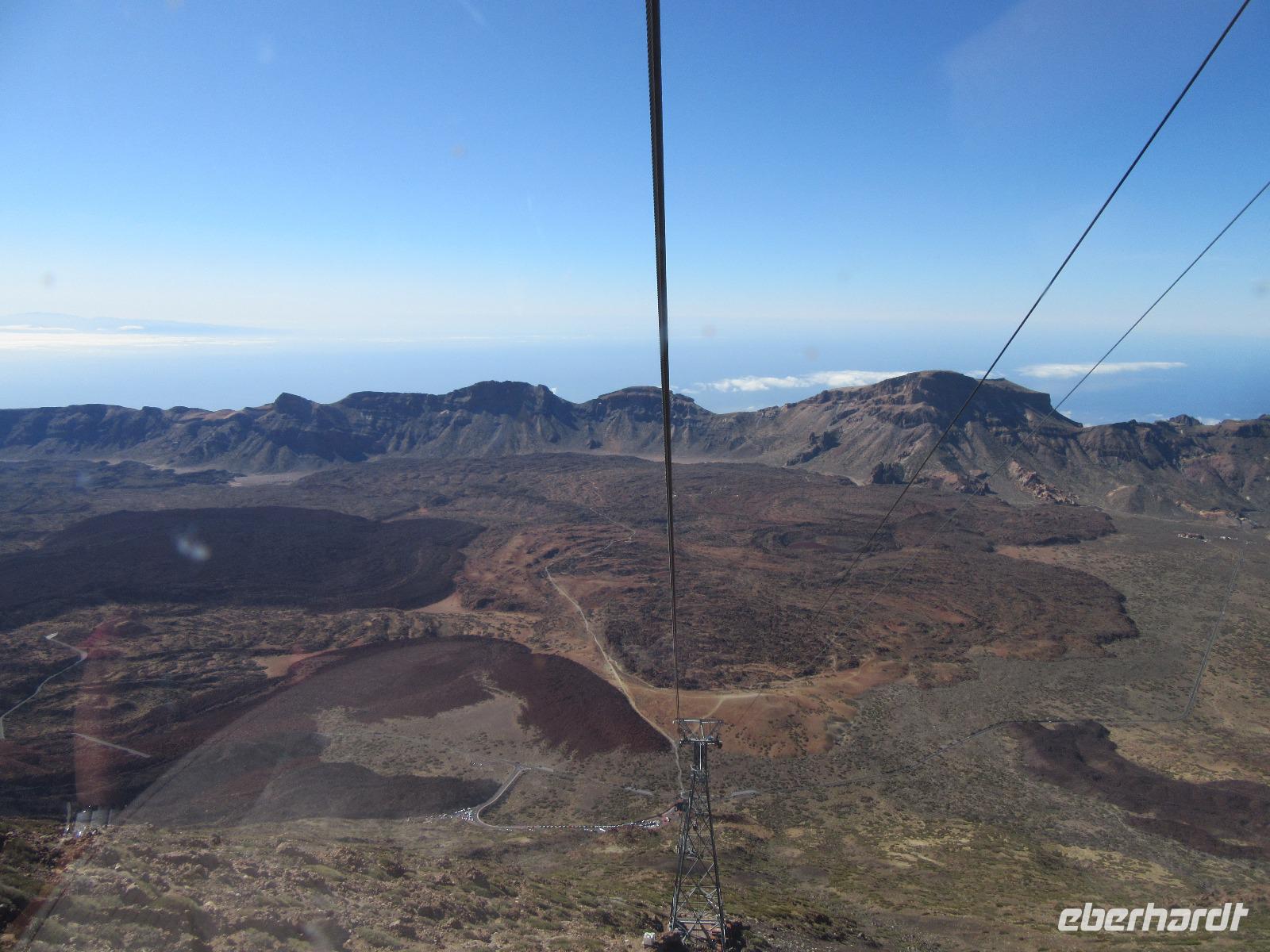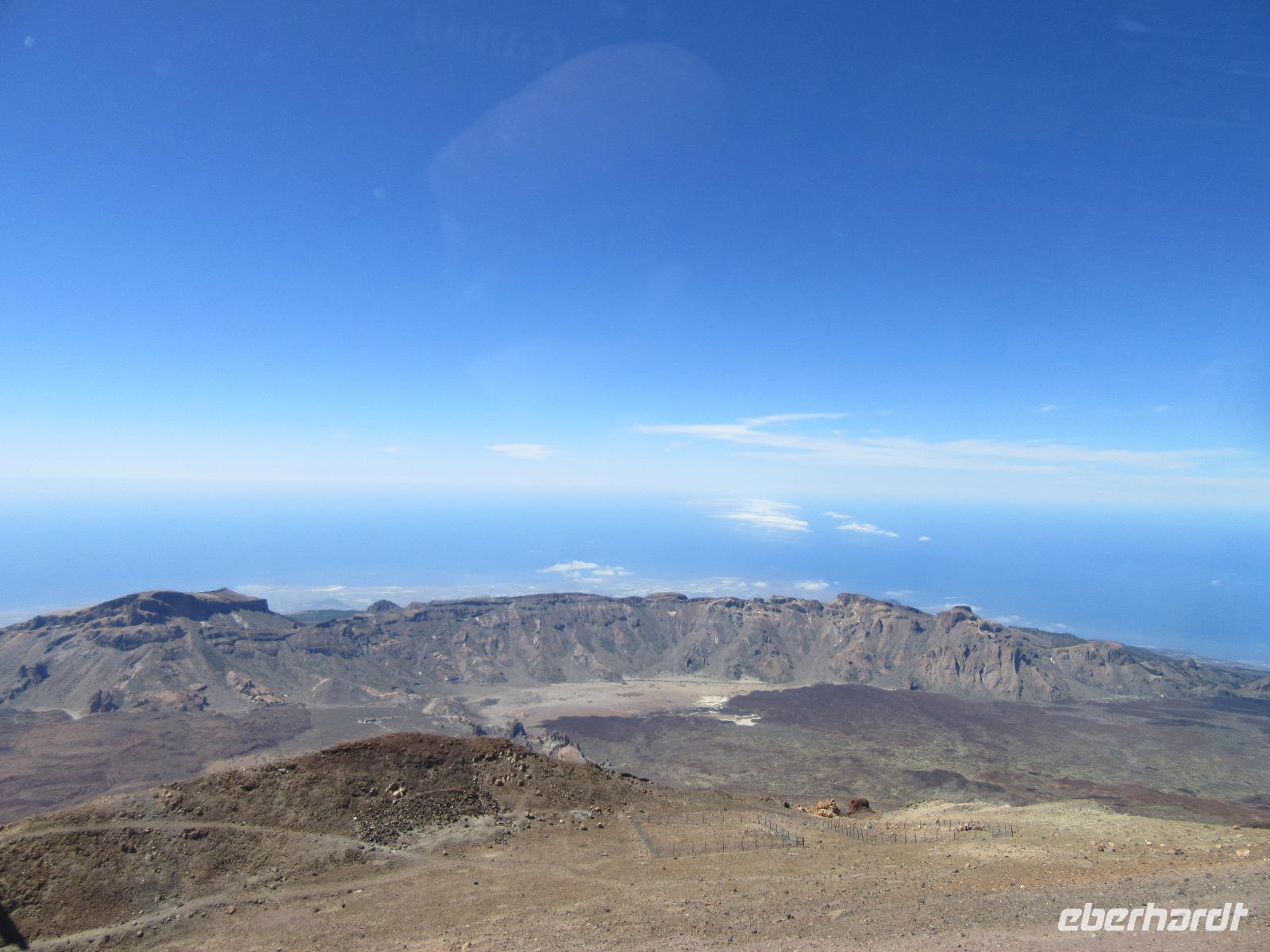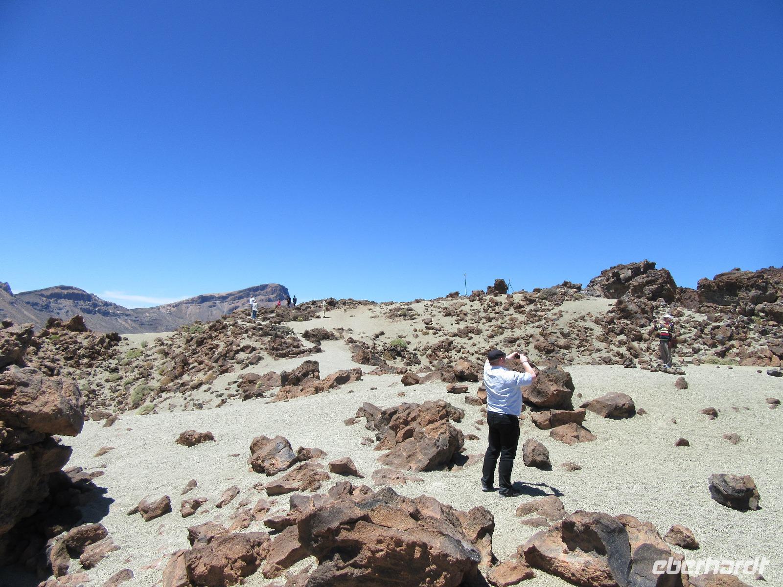 Auf diesem Weg sahen wir den berühmten Königin-Schuh aus Stein und die Roques de García gegenüber dem Parador und erreichten wenig später die Seilbahn. In nur 8 Minuten ging es von einer Höhe von 2300 Meter auf 3545 Meter Höhe. Oben hatten die Möglichkeit die verschiedenen Krater zu sehen und sahen die Strecke des Blue Trail, auf dem jedes Jahr eine Vielzahl von Läufern die ganze Insel von Los Cristianos über El Teide nach Puerto de la Cruz kreuzen.