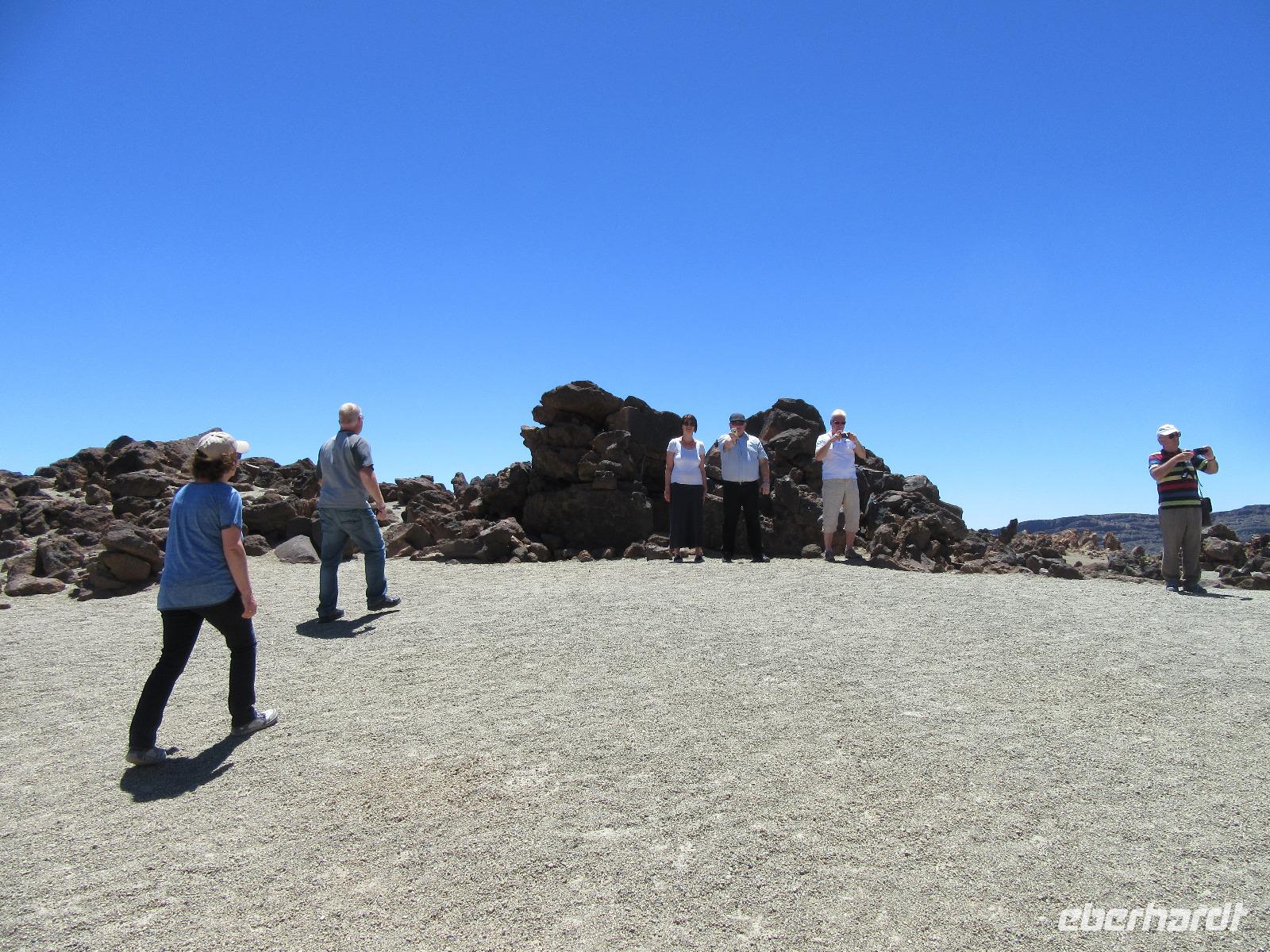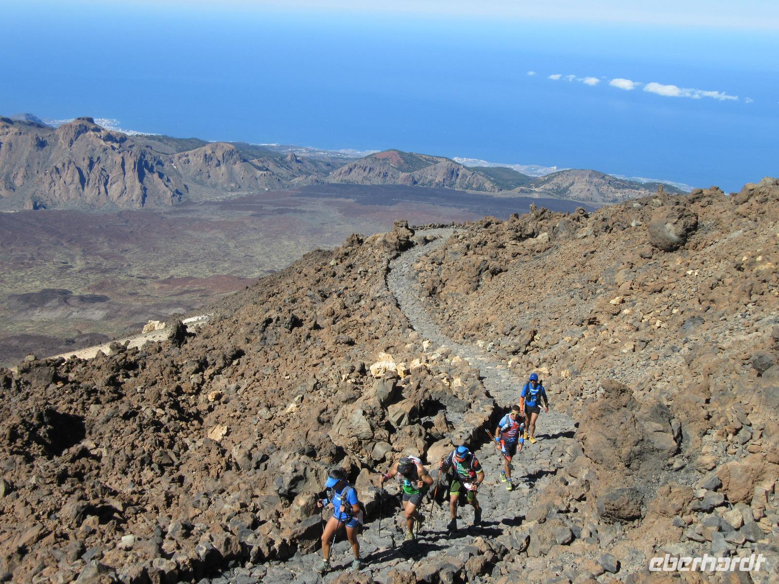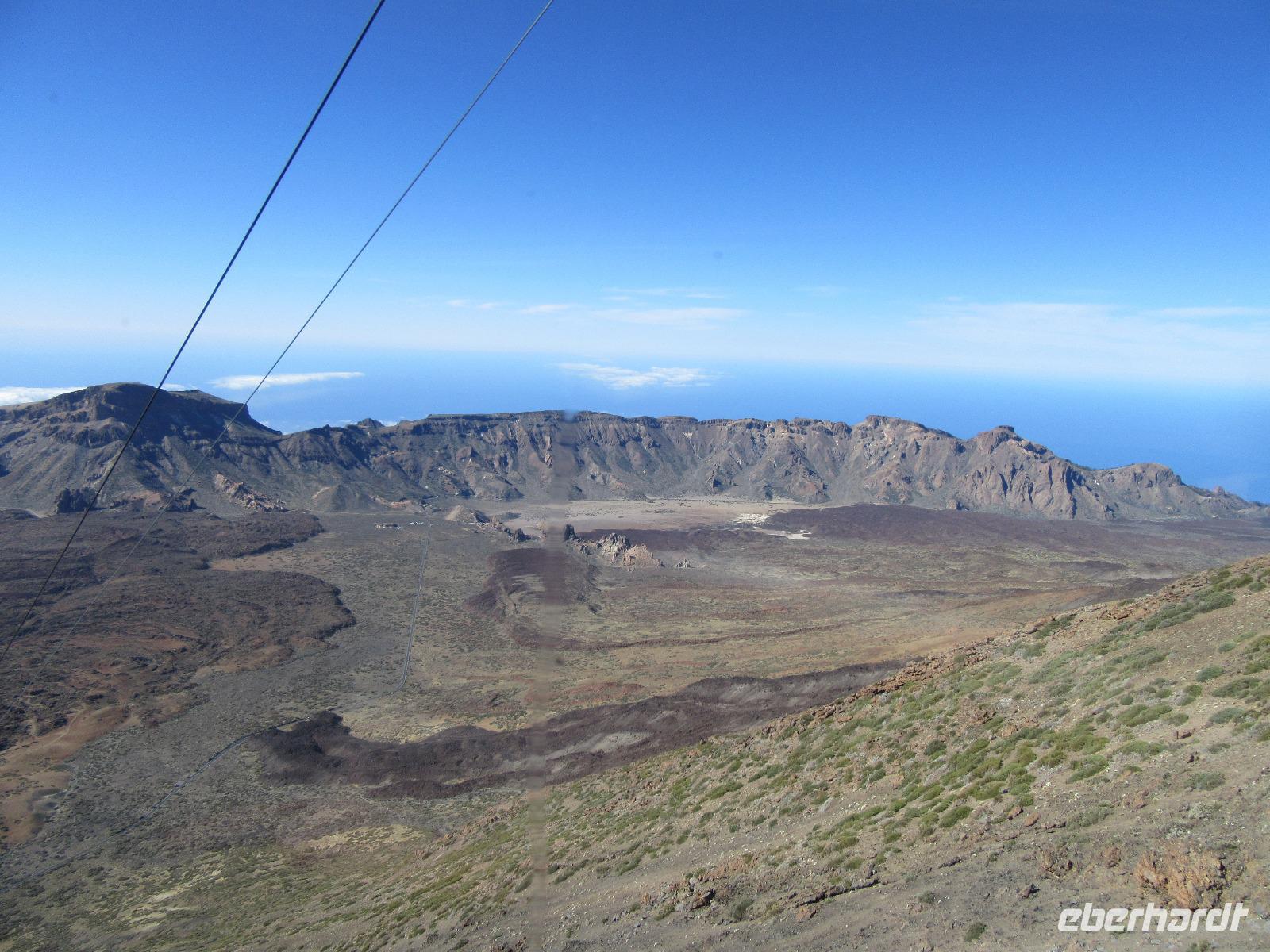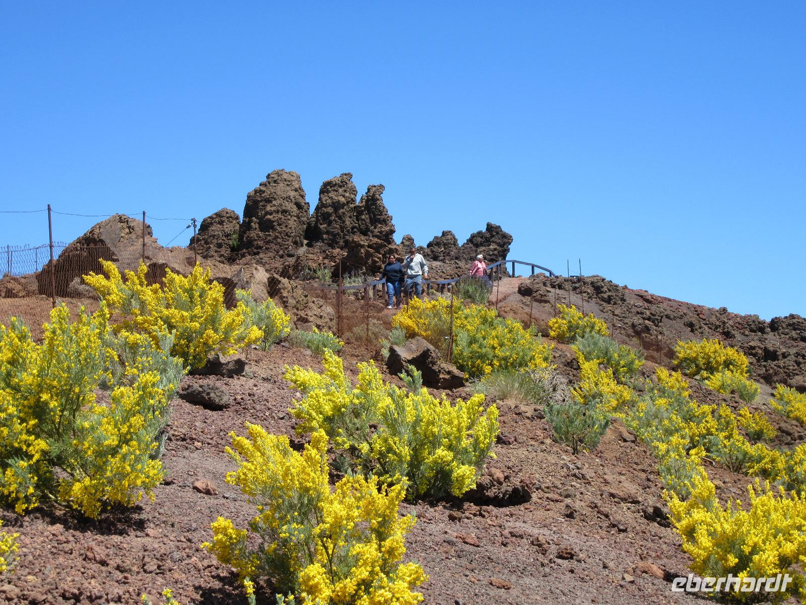Auf diesem Weg sahen wir den berühmten Königin-Schuh aus Stein und die Roques de García gegenüber dem Parador und erreichten wenig später die Seilbahn. In nur 8 Minuten ging es von einer Höhe von 2300 Meter auf 3545 Meter Höhe. Oben hatten die Möglichkeit die verschiedenen Krater zu sehen und sahen die Strecke des Blue Trail, auf dem jedes Jahr eine Vielzahl von Läufern die ganze Insel von Los Cristianos über El Teide nach Puerto de la Cruz kreuzen.