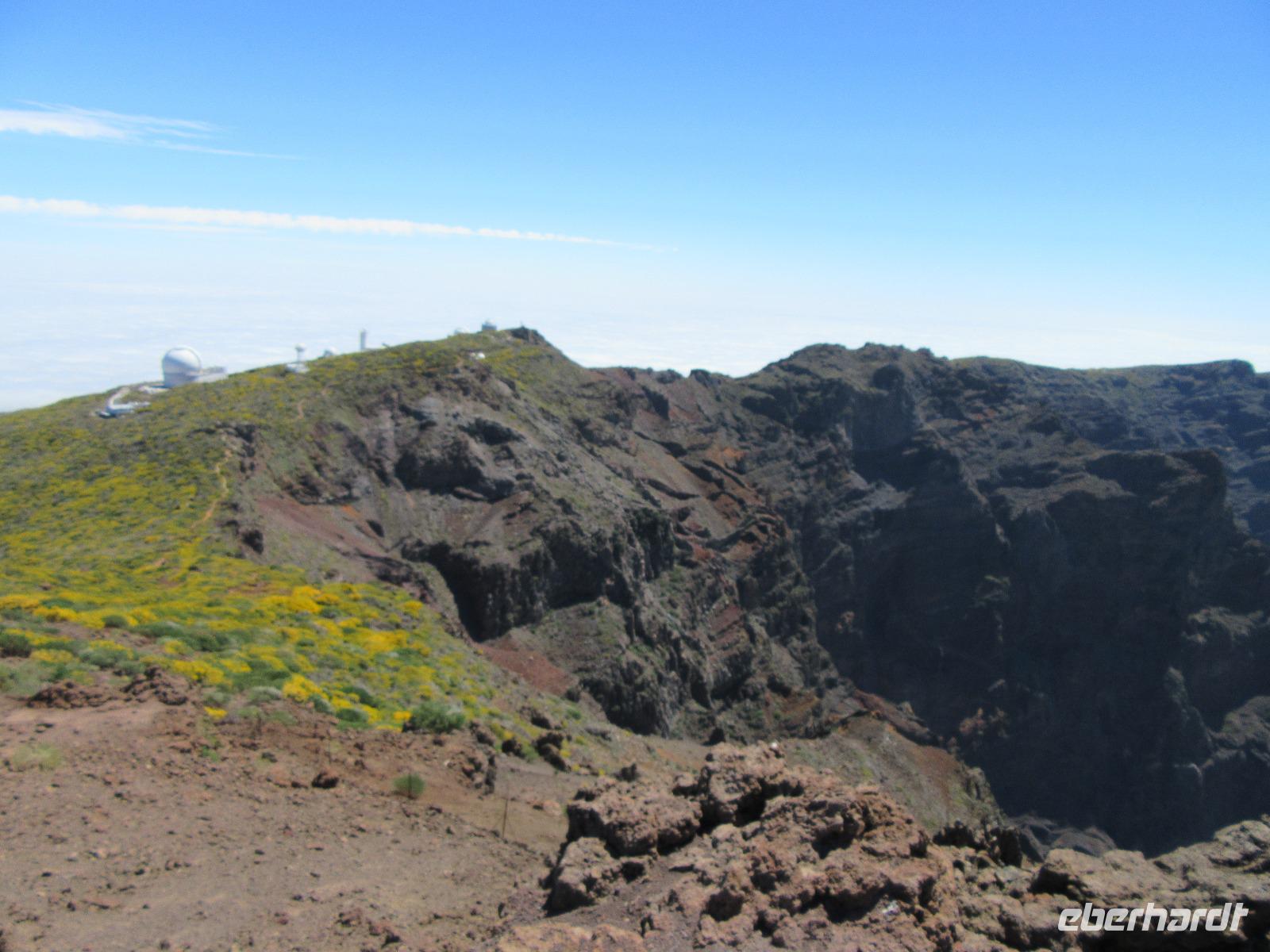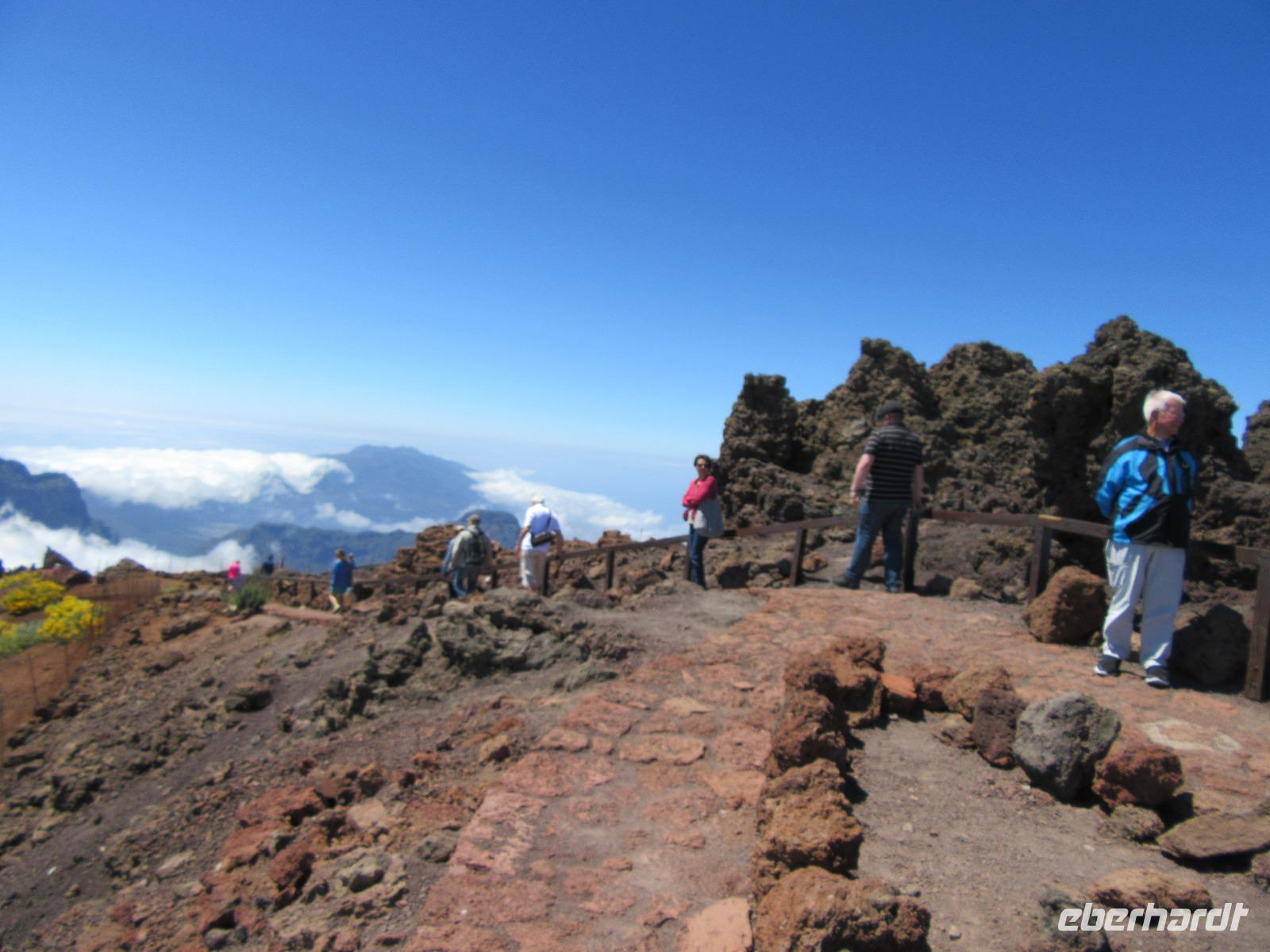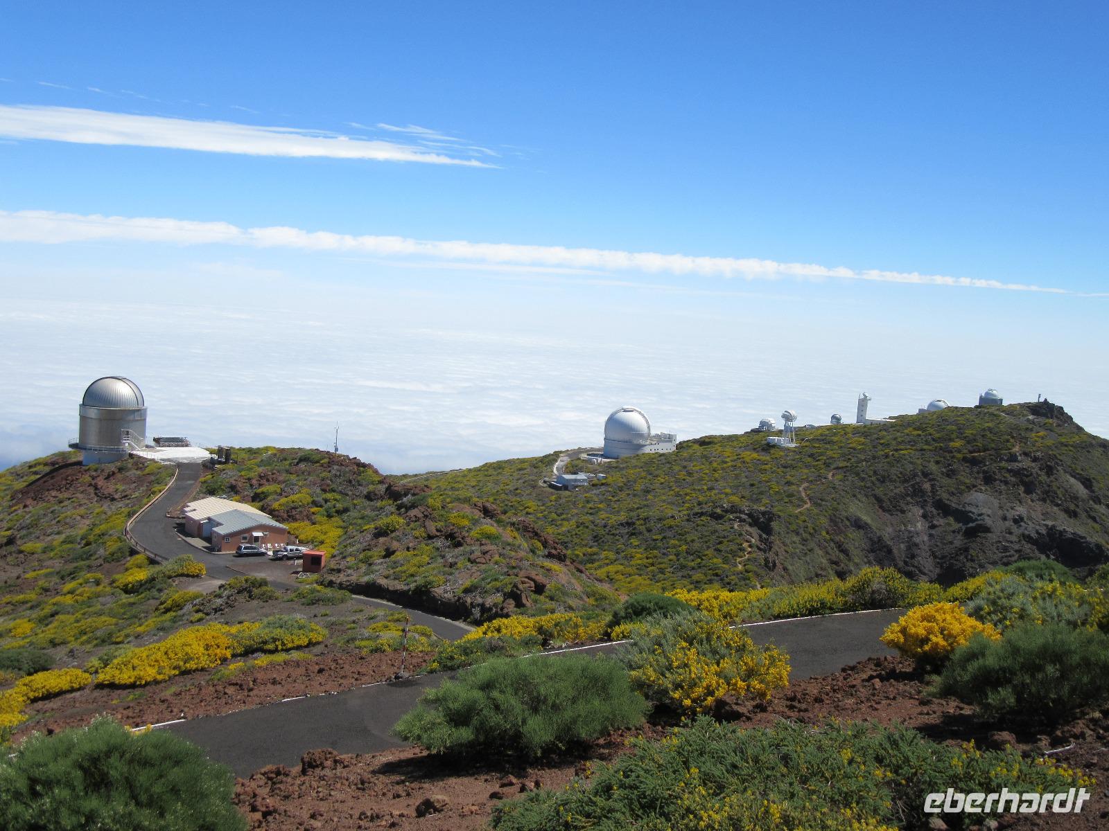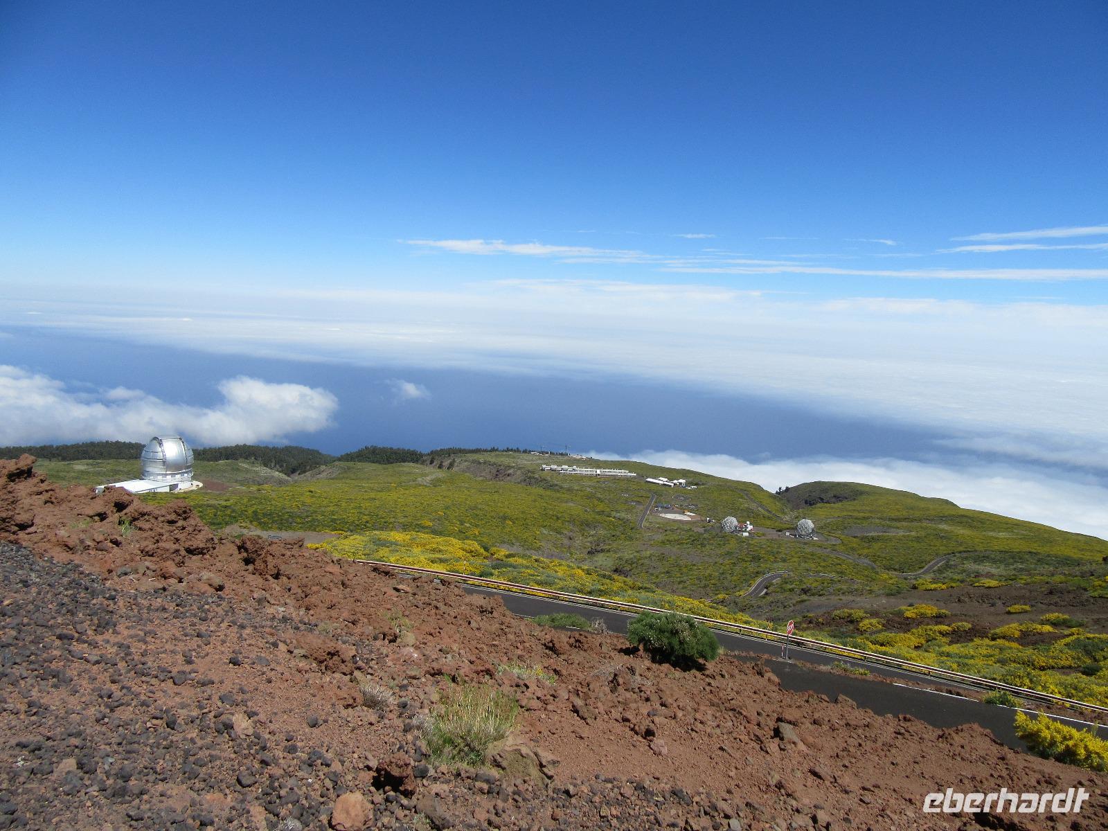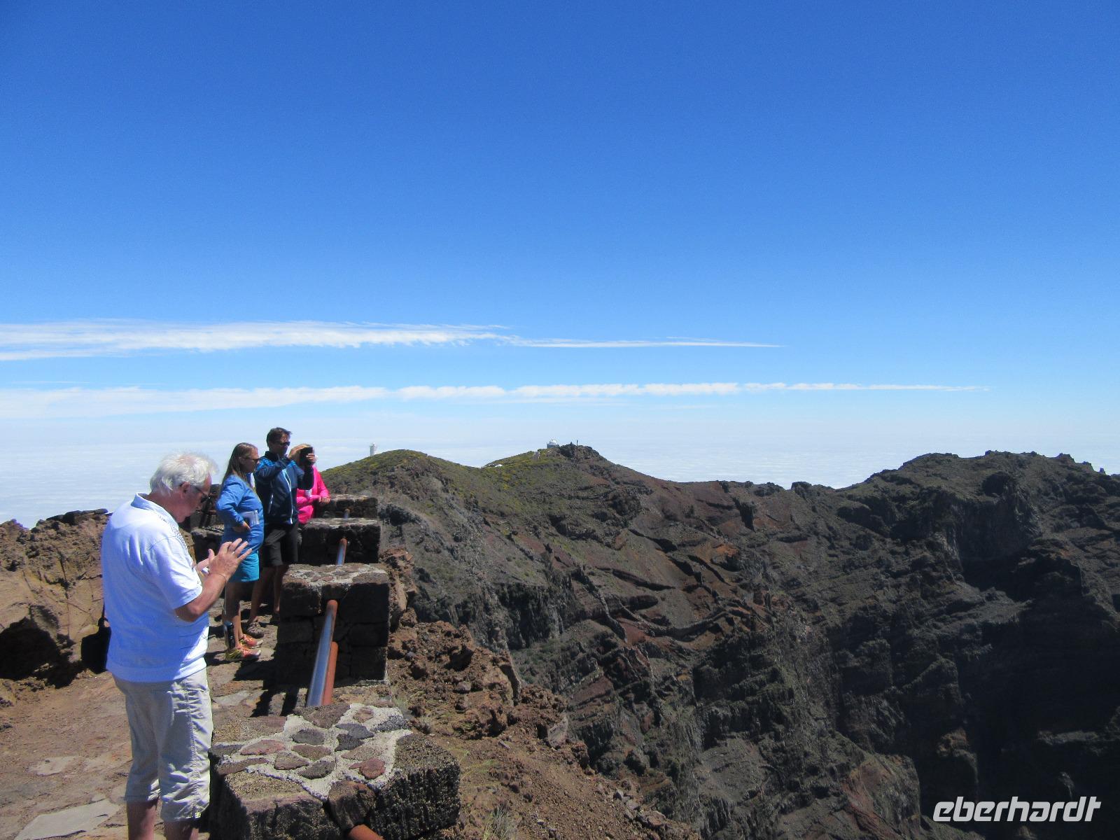 Dann fuhren wir zum höchsten Punkt der Insel: Roque de los Muchachos. Bevor wir da ankamen machten wir noch einen Stopp an dem Aussichtpunkt "Mirador de los Andenes", wo wir schöne Fotos über den Wolken machen und die einheimische Vegetation sehen konnten. Ein Stück weiter sahen wir das Sterne-Observatorium und erreichten die Roque Los Muchachos, wo wir ausgestiegen und bis zur Spitze gingen, um die besten Fotos über die Caldera de Taburiente zu bekommen. Bei diesem wunderschönen Ausblicken spatzierten wir entlang der Spitze dieses Kraters.
