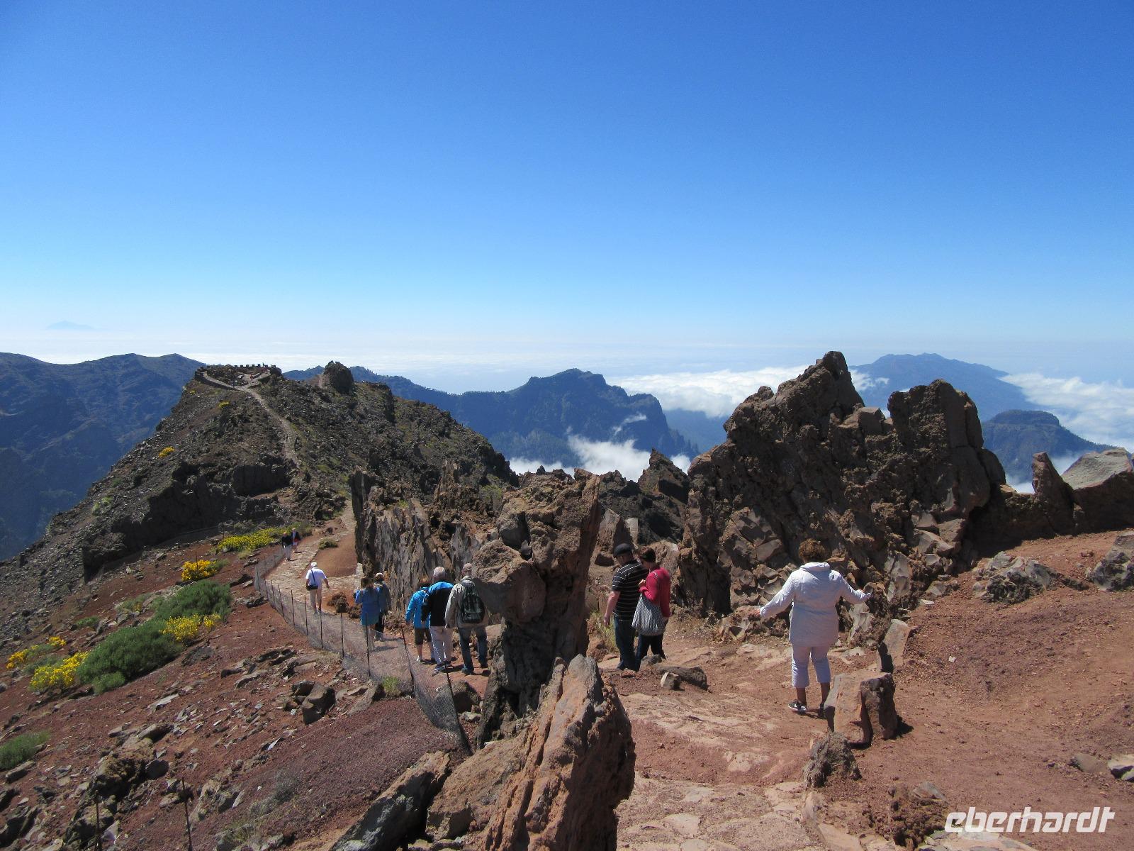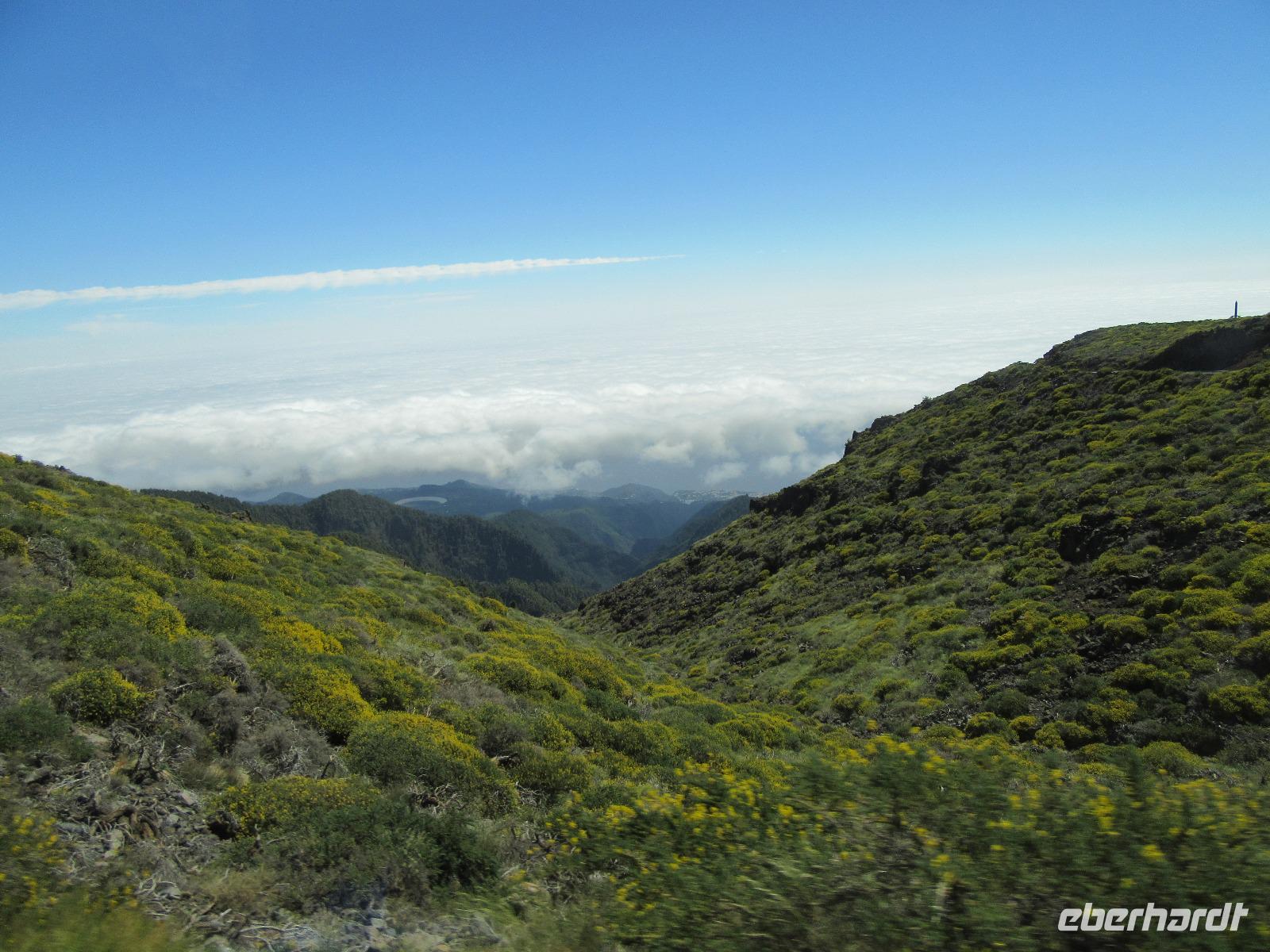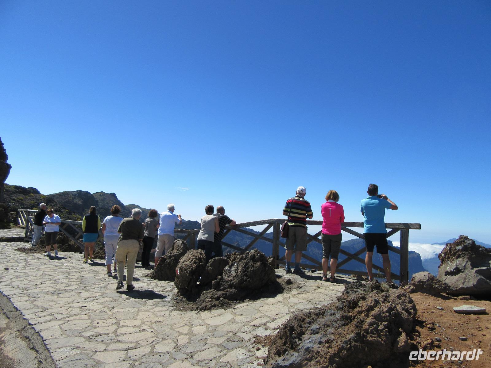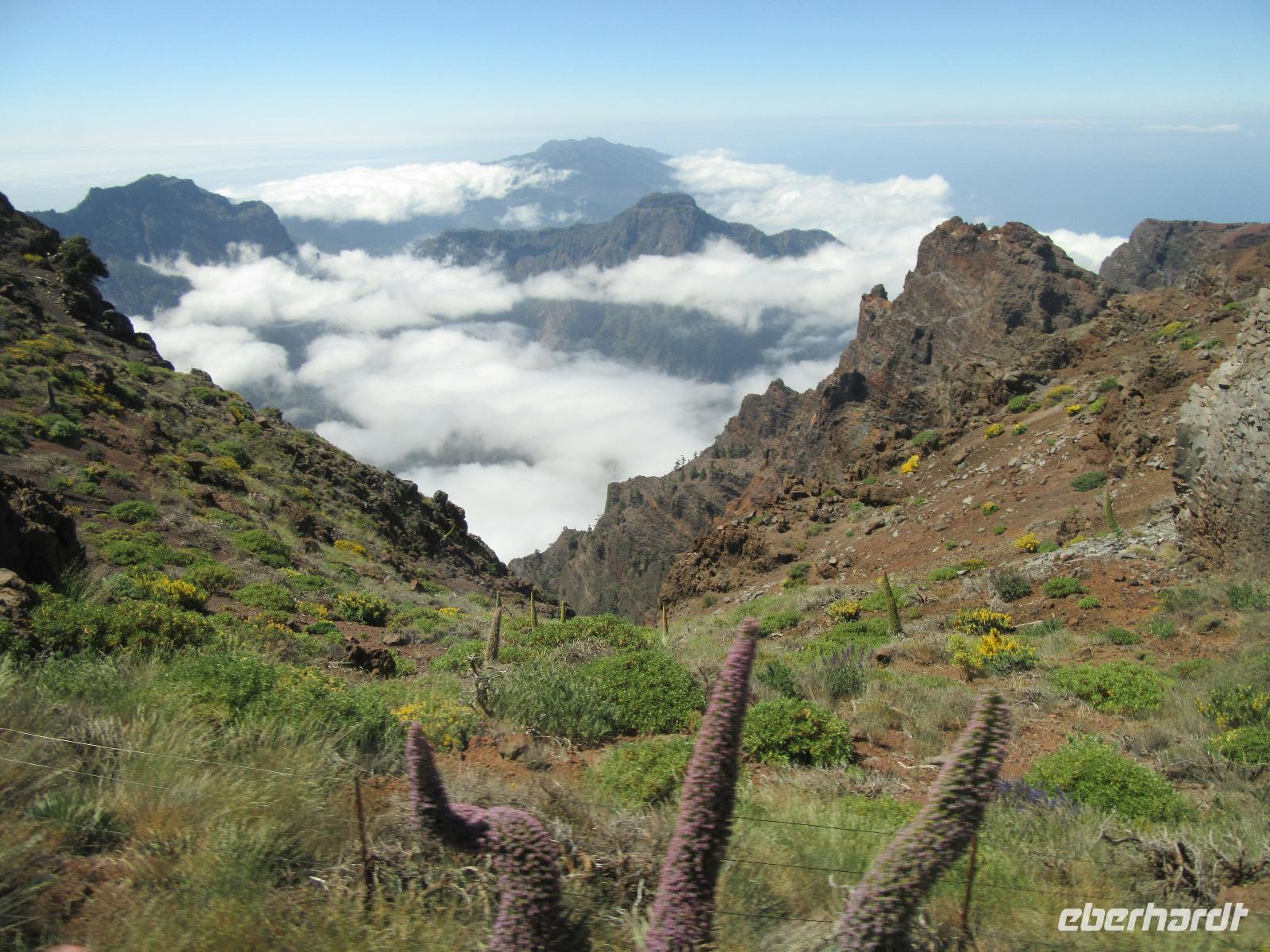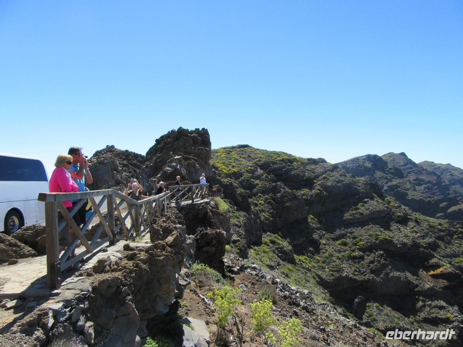 Dann fuhren wir zum höchsten Punkt der Insel: Roque de los Muchachos. Bevor wir da ankamen machten wir noch einen Stopp an dem Aussichtpunkt "Mirador de los Andenes", wo wir schöne Fotos über den Wolken machen und die einheimische Vegetation sehen konnten. Ein Stück weiter sahen wir das Sterne-Observatorium und erreichten die Roque Los Muchachos, wo wir ausgestiegen und bis zur Spitze gingen, um die besten Fotos über die Caldera de Taburiente zu bekommen. Bei diesem wunderschönen Ausblicken spatzierten wir entlang der Spitze dieses Kraters.