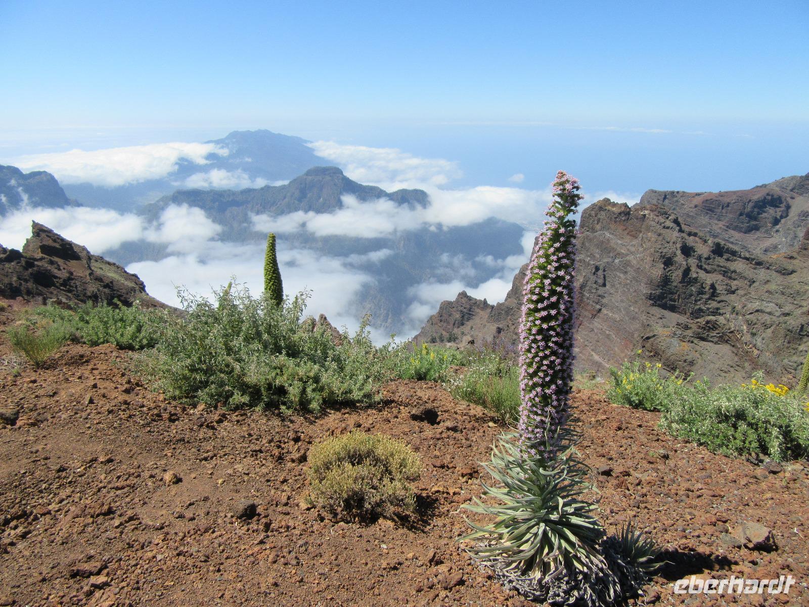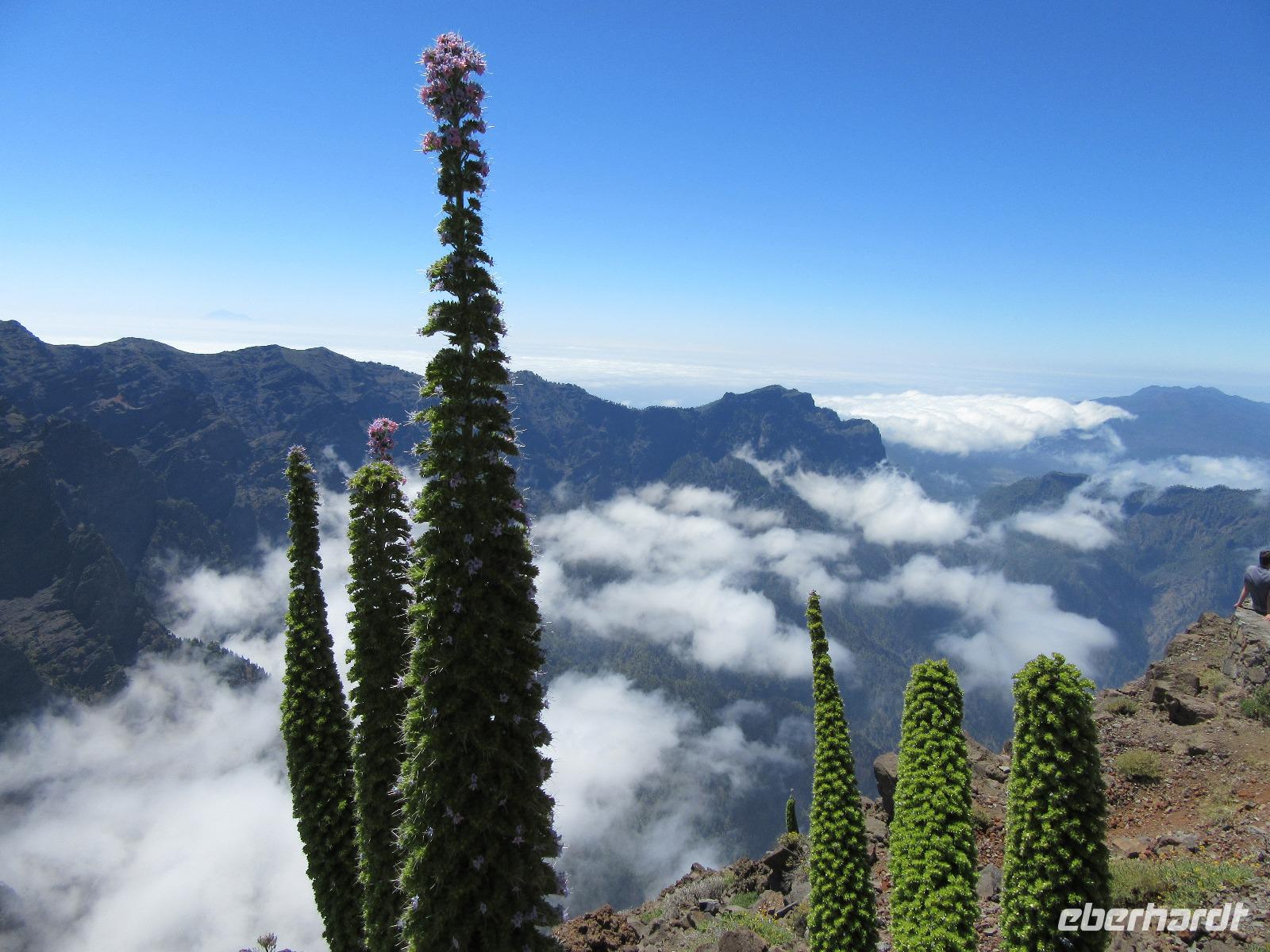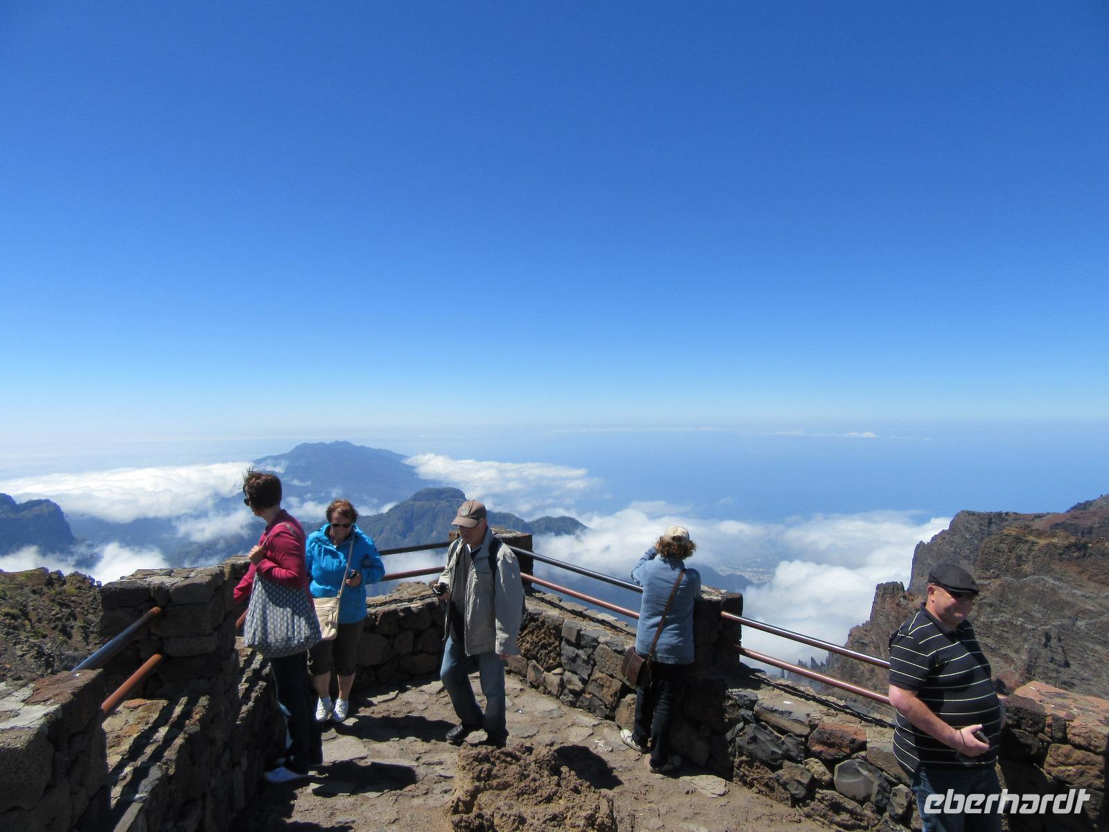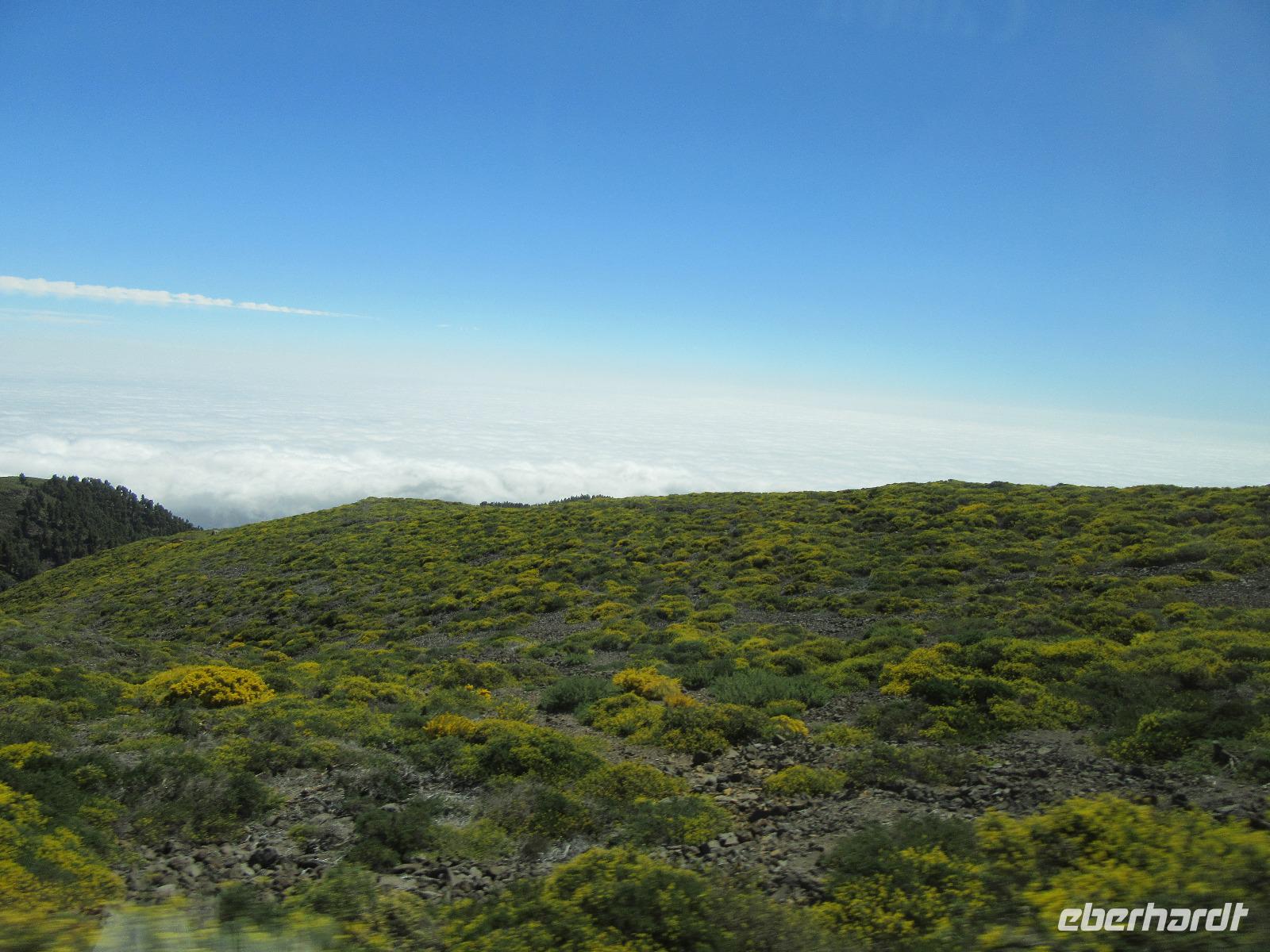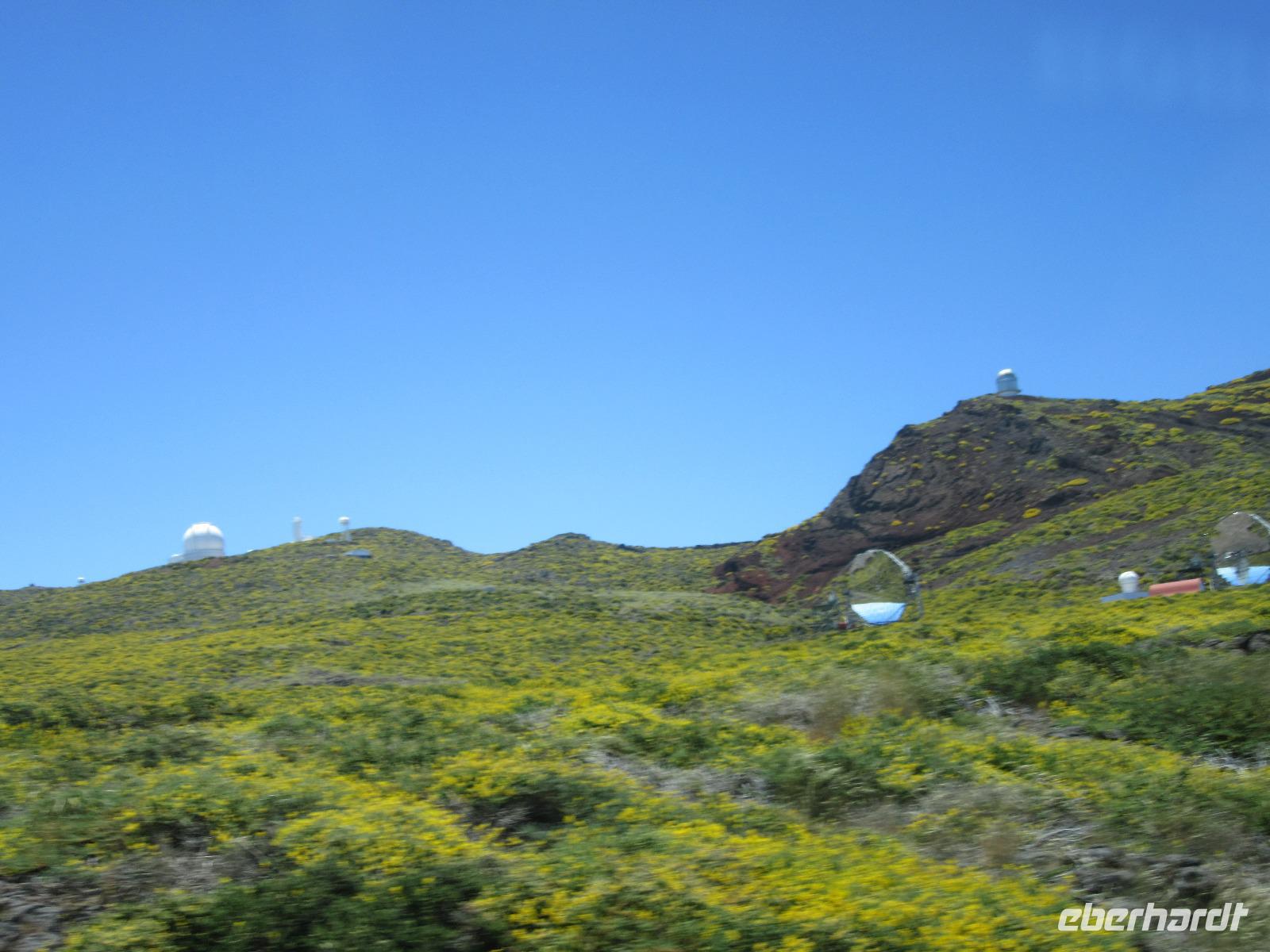 Dann fuhren wir zum höchsten Punkt der Insel: Roque de los Muchachos. Bevor wir da ankamen machten wir noch einen Stopp an dem Aussichtpunkt "Mirador de los Andenes", wo wir schöne Fotos über den Wolken machen und die einheimische Vegetation sehen konnten. Ein Stück weiter sahen wir das Sterne-Observatorium und erreichten die Roque Los Muchachos, wo wir ausgestiegen und bis zur Spitze gingen, um die besten Fotos über die Caldera de Taburiente zu bekommen. Bei diesem wunderschönen Ausblicken spatzierten wir entlang der Spitze dieses Kraters.