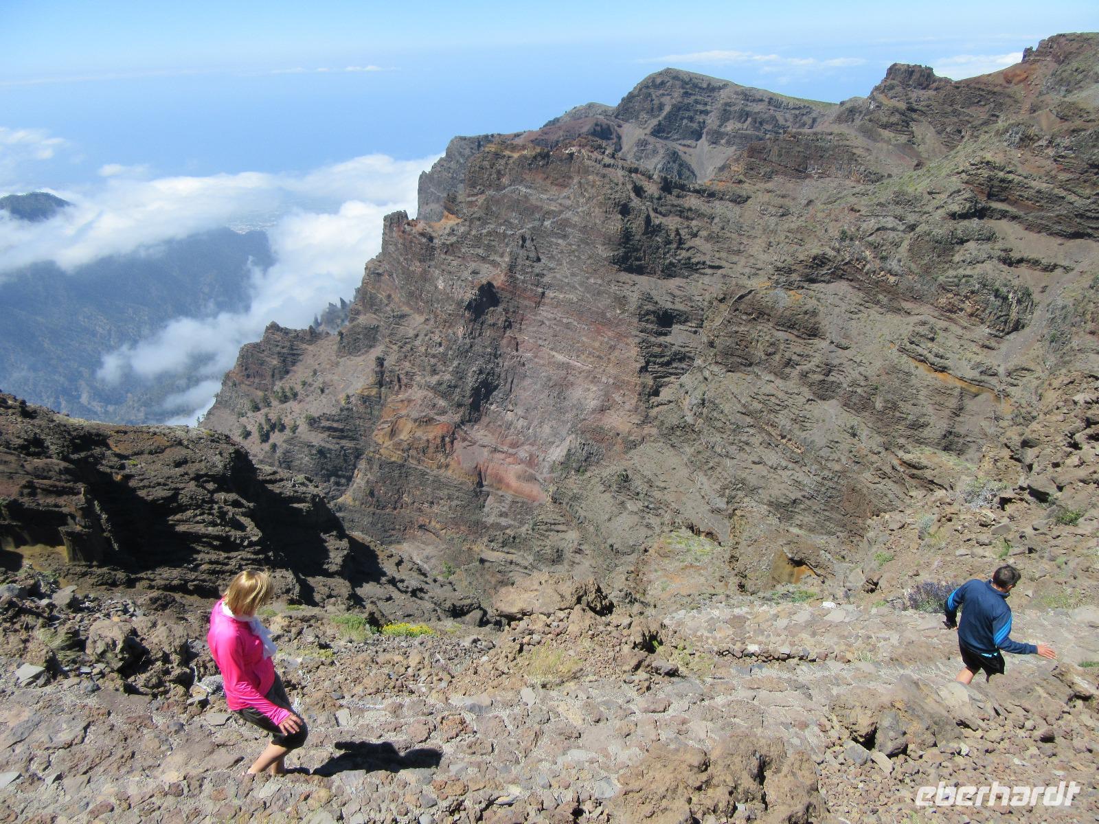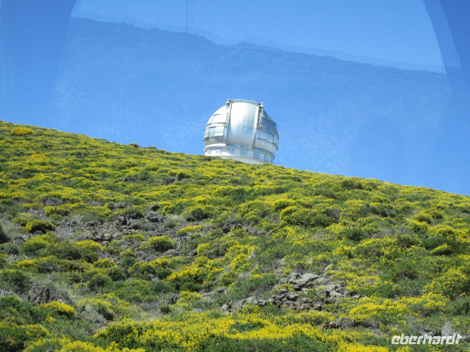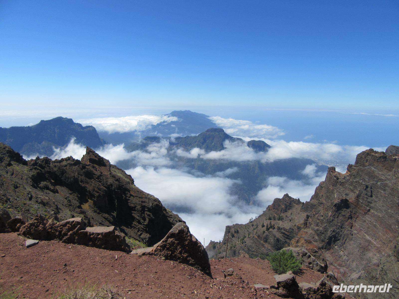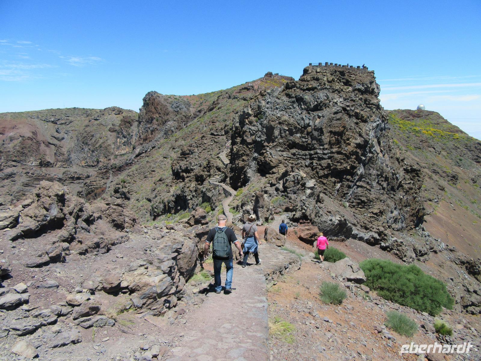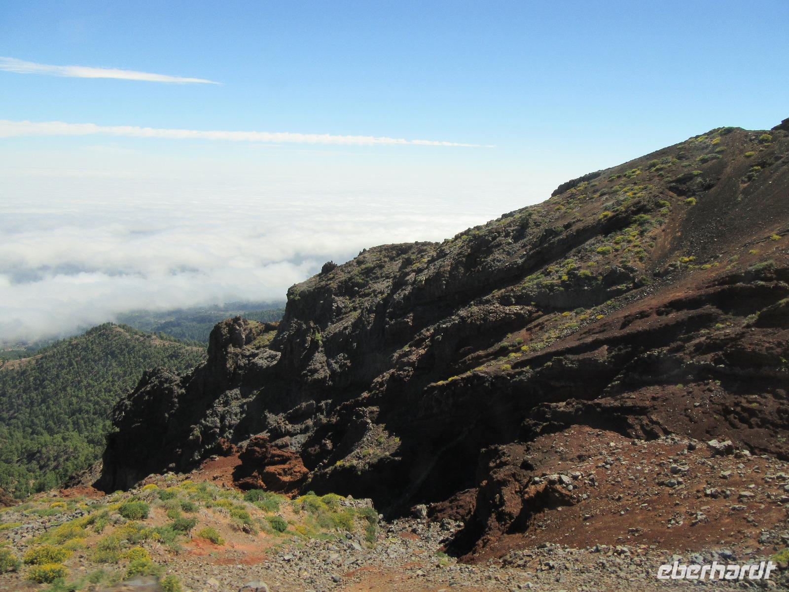 Dann fuhren wir zum höchsten Punkt der Insel: Roque de los Muchachos. Bevor wir da ankamen machten wir noch einen Stopp an dem Aussichtpunkt "Mirador de los Andenes", wo wir schöne Fotos über den Wolken machen und die einheimische Vegetation sehen konnten. Ein Stück weiter sahen wir das Sterne-Observatorium und erreichten die Roque Los Muchachos, wo wir ausgestiegen und bis zur Spitze gingen, um die besten Fotos über die Caldera de Taburiente zu bekommen. Bei diesem wunderschönen Ausblicken spatzierten wir entlang der Spitze dieses Kraters.