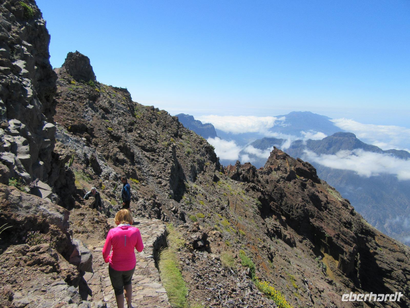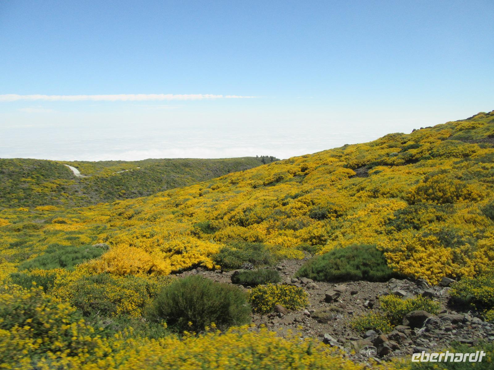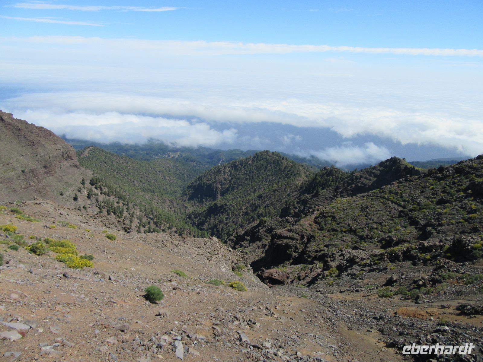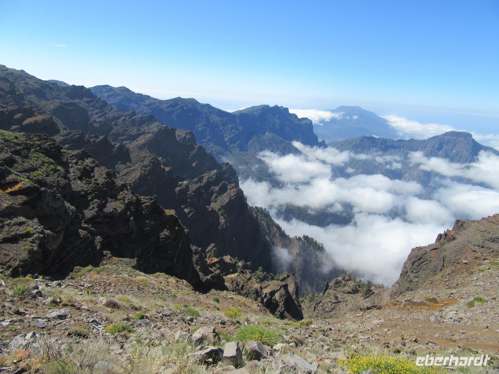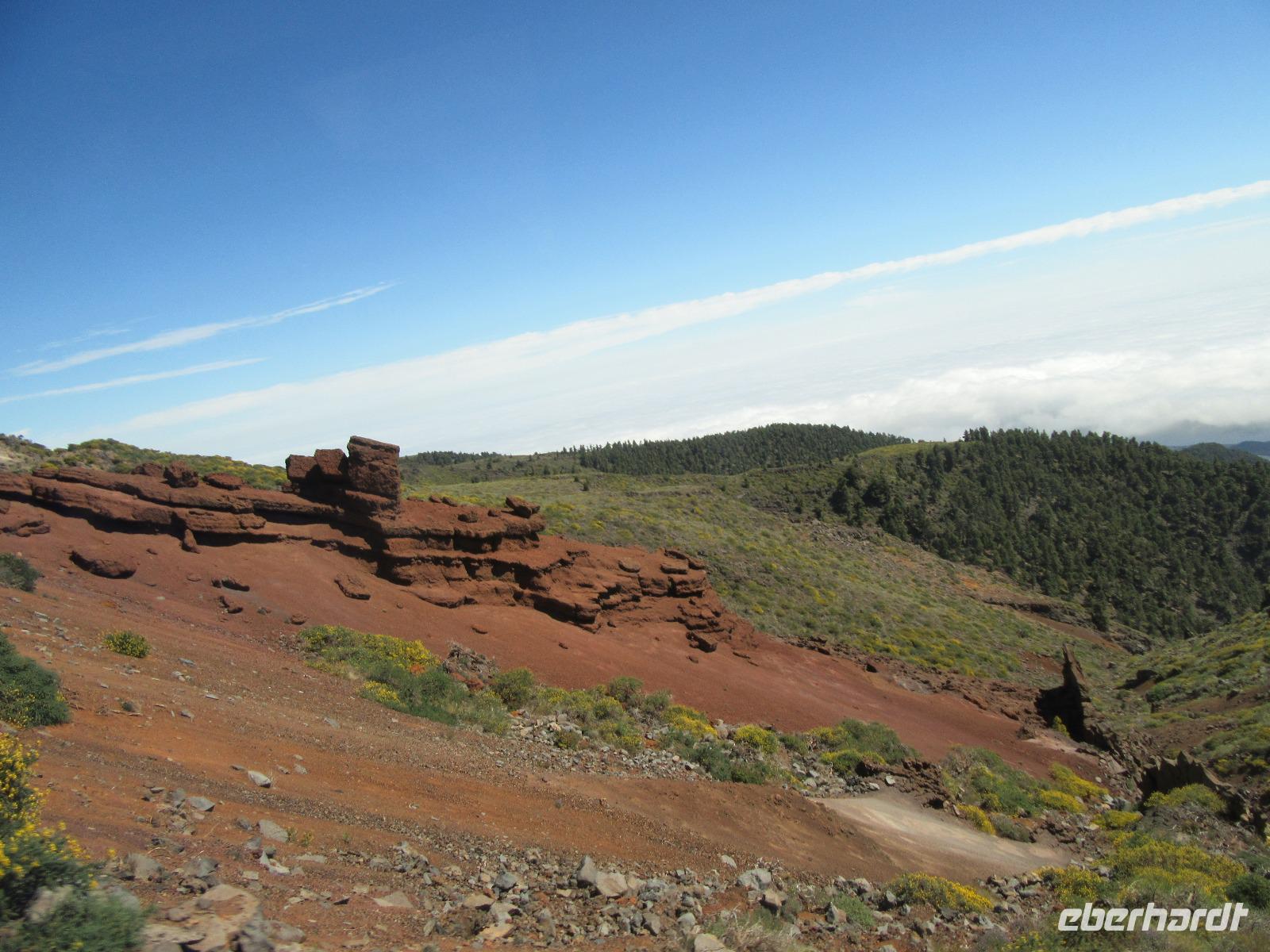 Dann fuhren wir zum höchsten Punkt der Insel: Roque de los Muchachos. Bevor wir da ankamen machten wir noch einen Stopp an dem Aussichtpunkt "Mirador de los Andenes", wo wir schöne Fotos über den Wolken machen und die einheimische Vegetation sehen konnten. Ein Stück weiter sahen wir das Sterne-Observatorium und erreichten die Roque Los Muchachos, wo wir ausgestiegen und bis zur Spitze gingen, um die besten Fotos über die Caldera de Taburiente zu bekommen. Bei diesem wunderschönen Ausblicken spatzierten wir entlang der Spitze dieses Kraters.