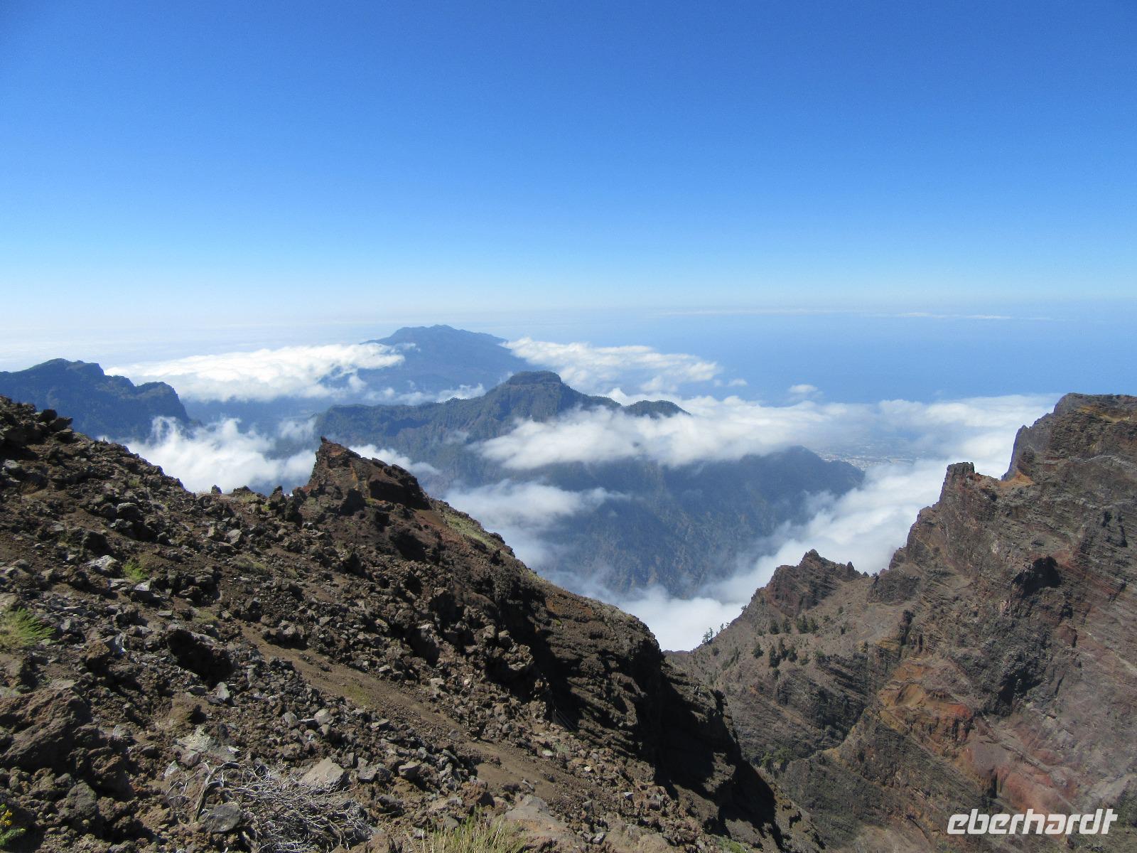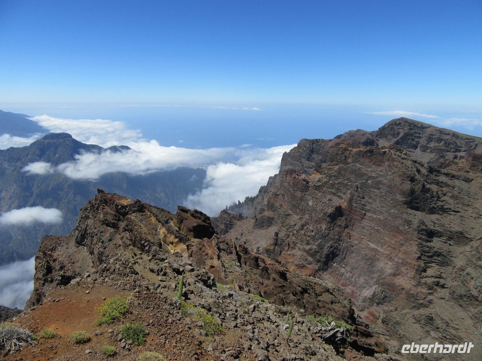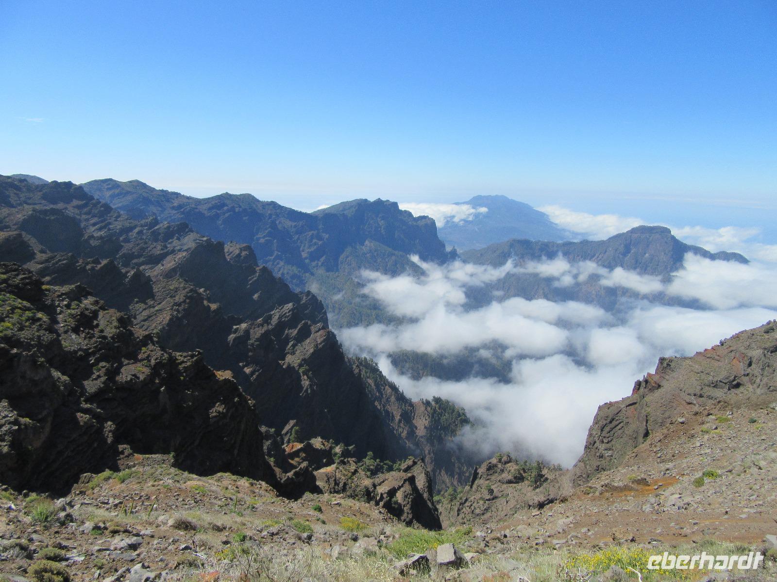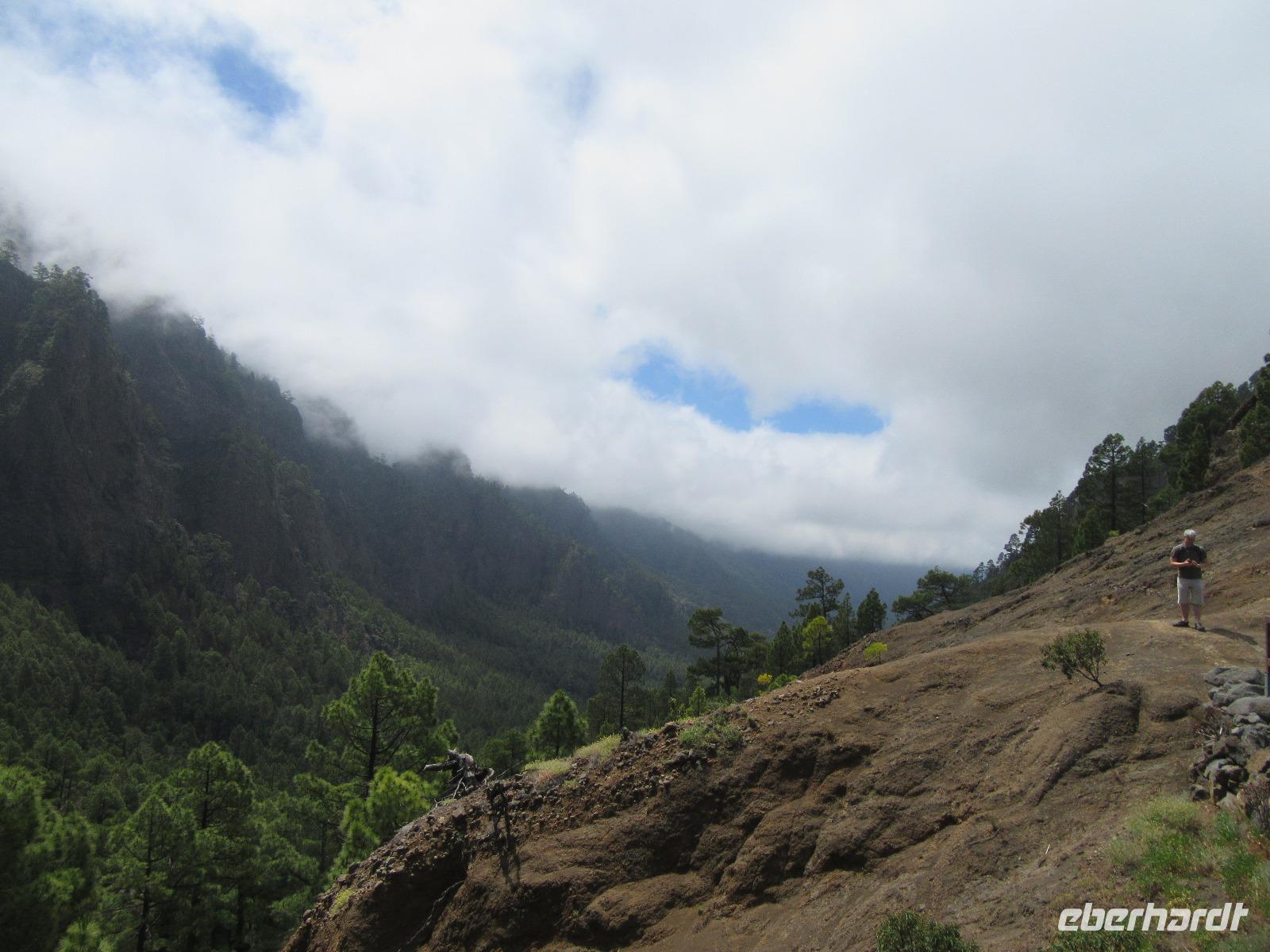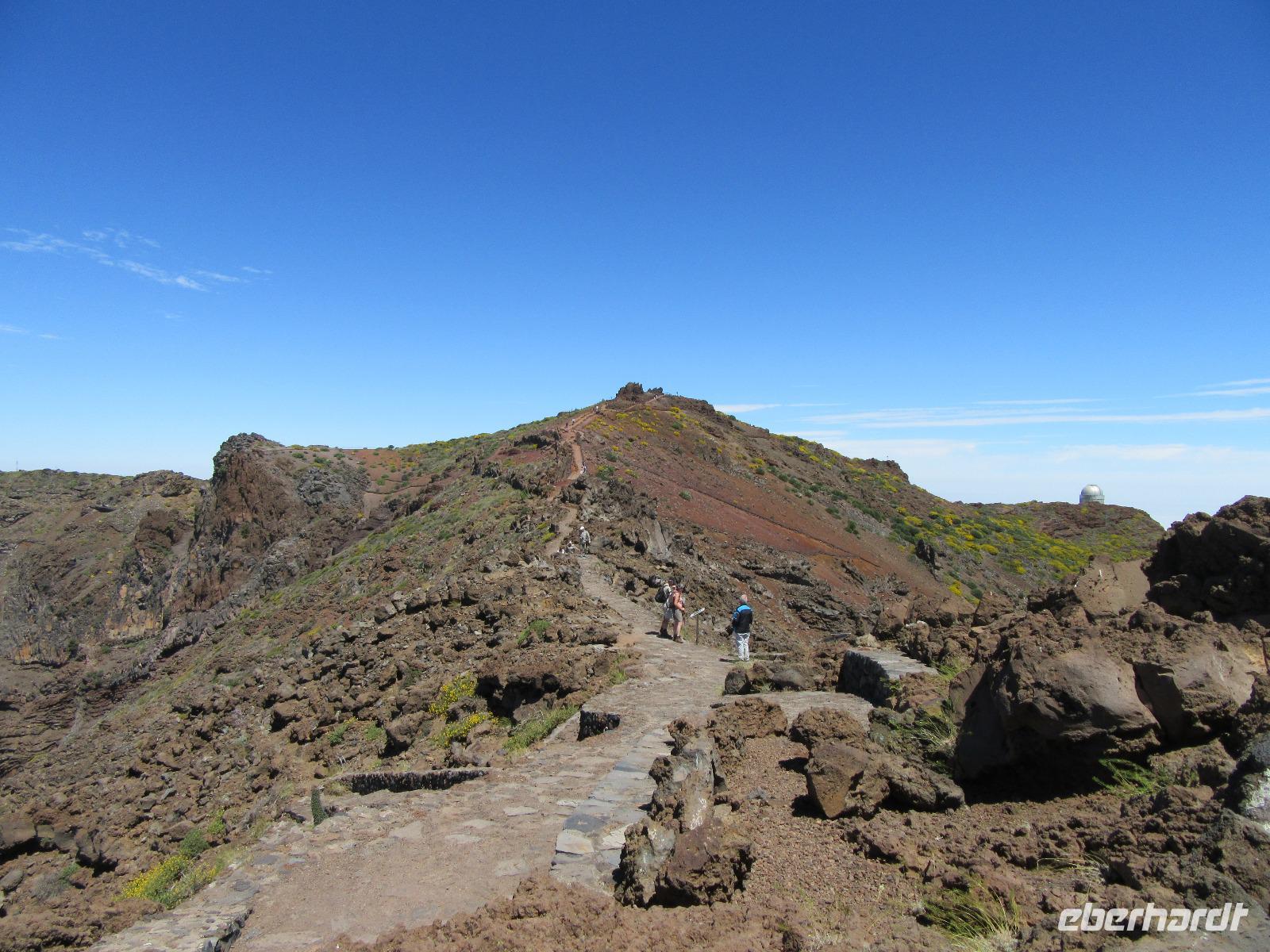 Dann fuhren wir zum höchsten Punkt der Insel: Roque de los Muchachos. Bevor wir da ankamen machten wir noch einen Stopp an dem Aussichtpunkt "Mirador de los Andenes", wo wir schöne Fotos über den Wolken machen und die einheimische Vegetation sehen konnten. Ein Stück weiter sahen wir das Sterne-Observatorium und erreichten die Roque Los Muchachos, wo wir ausgestiegen und bis zur Spitze gingen, um die besten Fotos über die Caldera de Taburiente zu bekommen. Bei diesem wunderschönen Ausblicken spatzierten wir entlang der Spitze dieses Kraters.