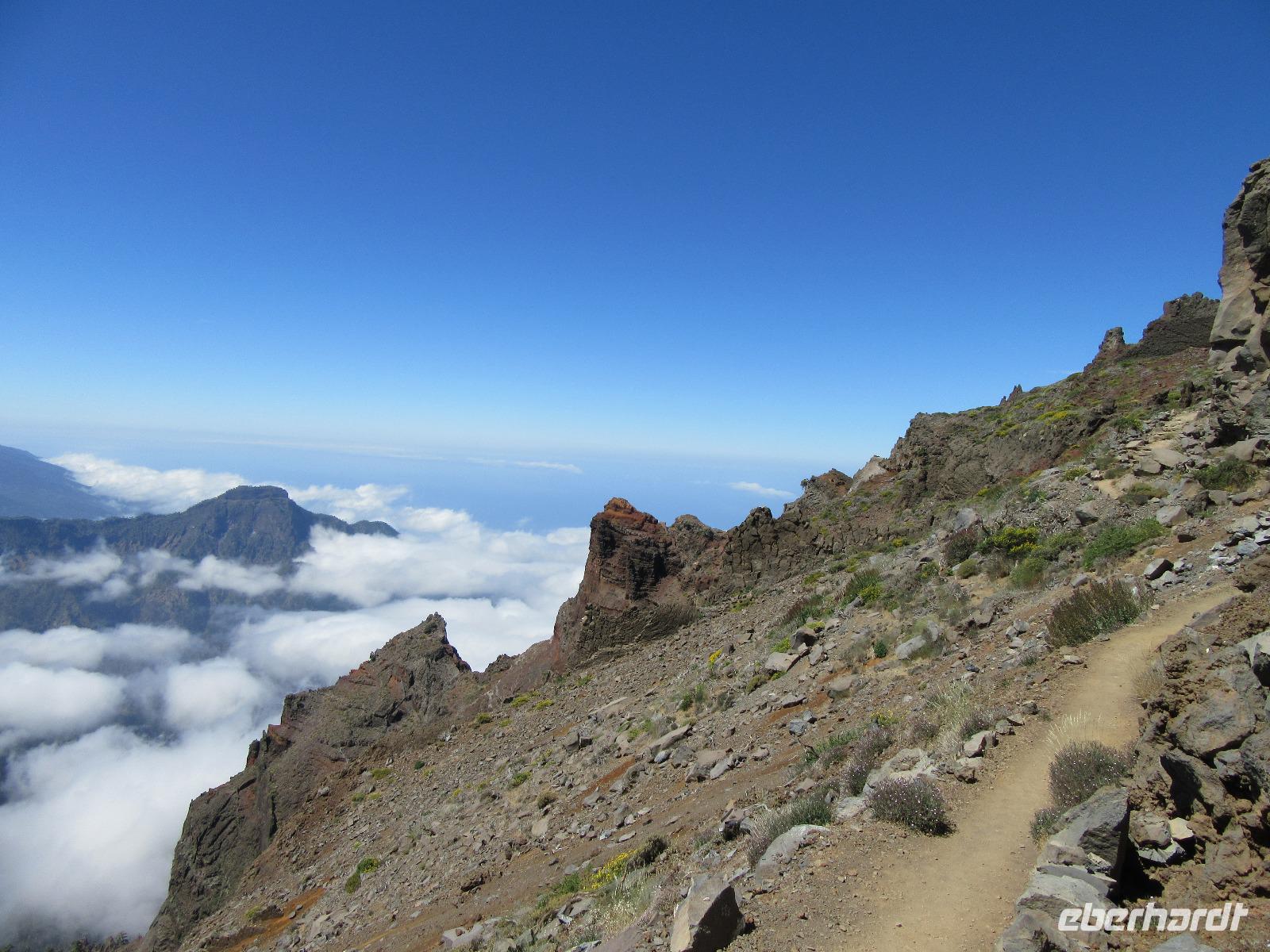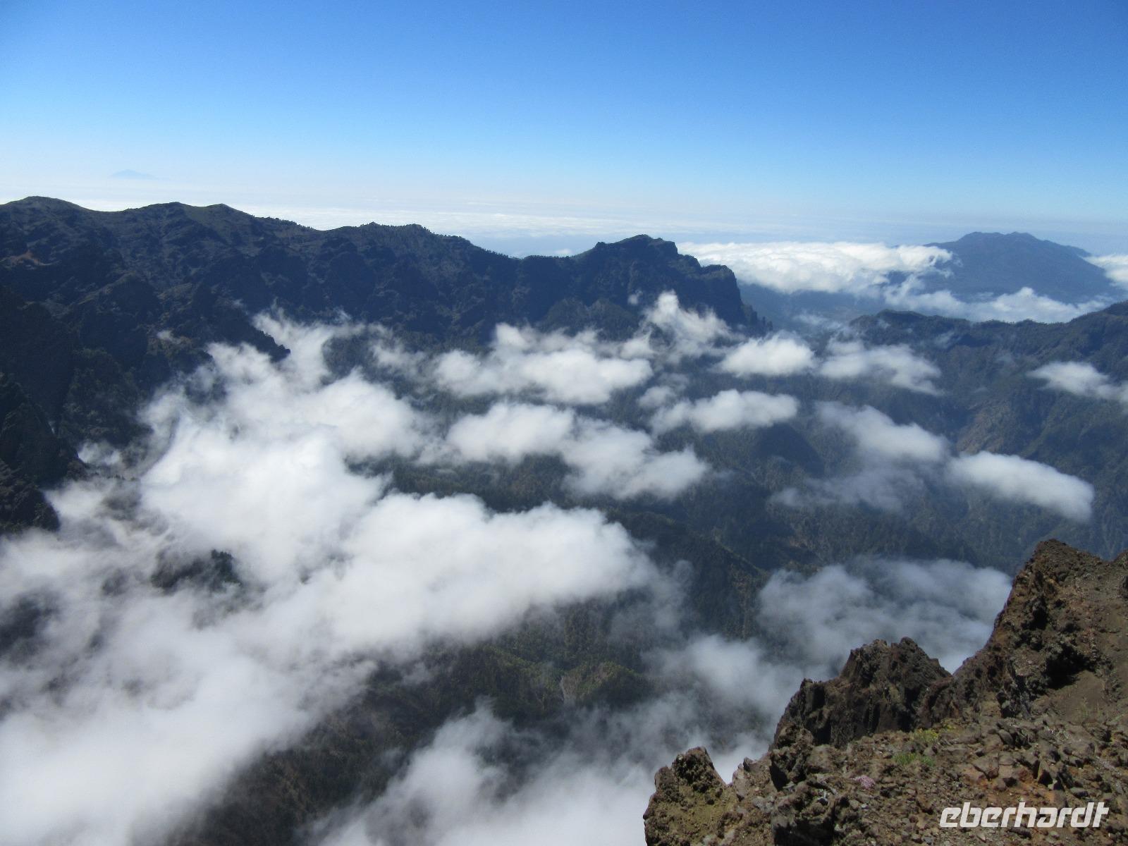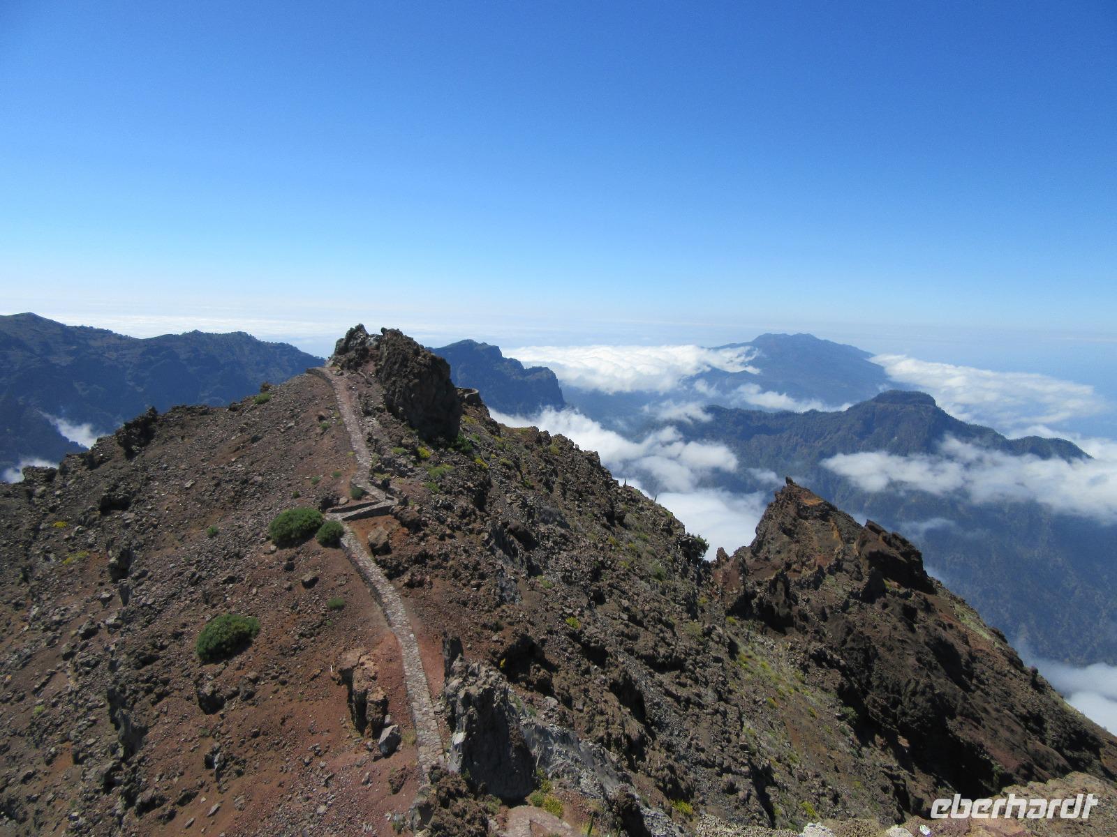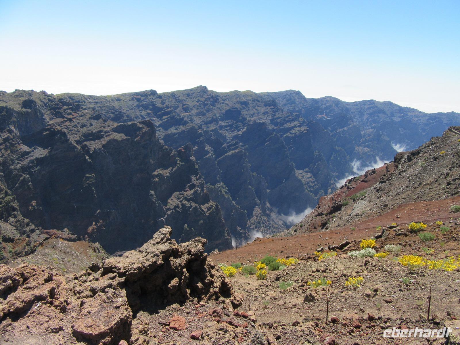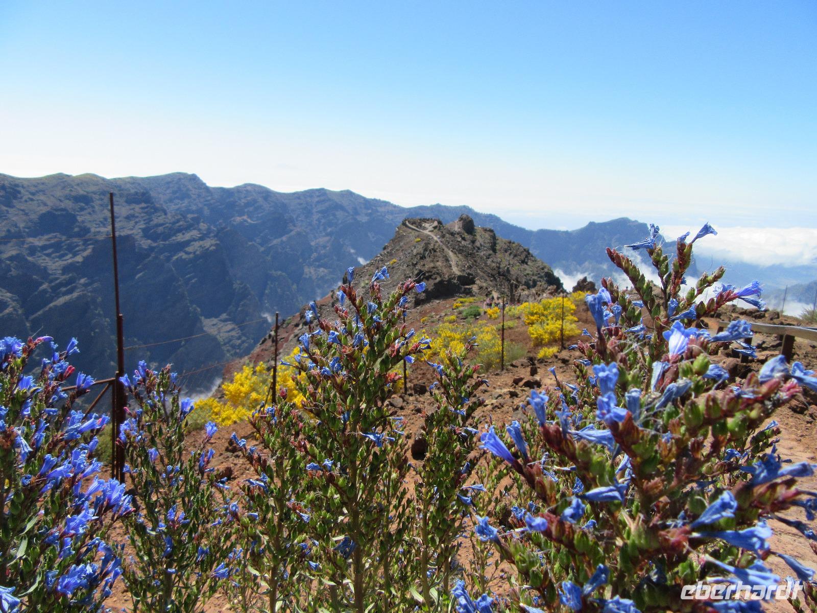 Dann fuhren wir zum höchsten Punkt der Insel: Roque de los Muchachos. Bevor wir da ankamen machten wir noch einen Stopp an dem Aussichtpunkt "Mirador de los Andenes", wo wir schöne Fotos über den Wolken machen und die einheimische Vegetation sehen konnten. Ein Stück weiter sahen wir das Sterne-Observatorium und erreichten die Roque Los Muchachos, wo wir ausgestiegen und bis zur Spitze gingen, um die besten Fotos über die Caldera de Taburiente zu bekommen. Bei diesem wunderschönen Ausblicken spatzierten wir entlang der Spitze dieses Kraters.