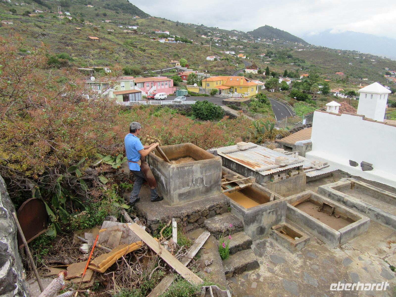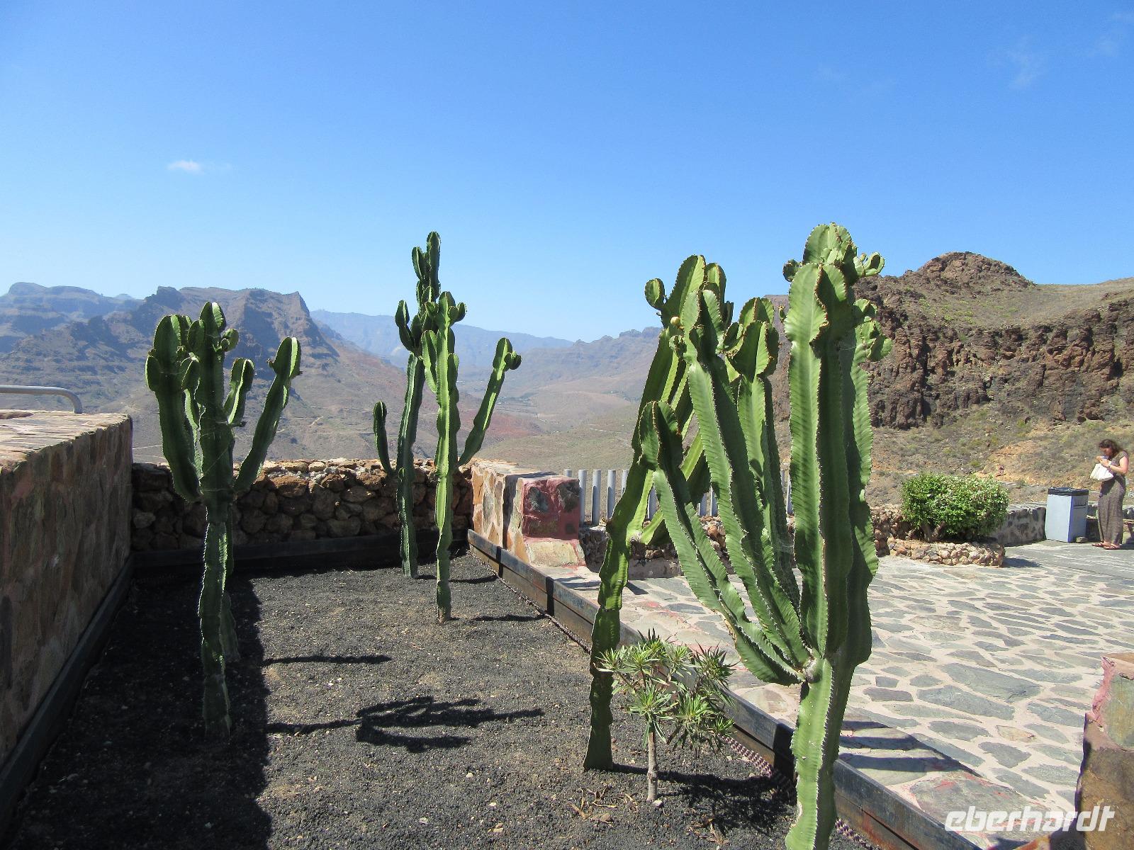 Wenig später waren wir in dem Dorf El Cercado, wo drei traditionelle Töpfereien sind. Natürlich haben wir die drei besucht und konnten direkt die verschiedenen Mitarbeiter bei der Ausübung ihres Berufs sehen. Da hatten wir auch die Möglichkeit den typischen Schnaps mit Palmen-Honig Gomerón zu probieren. Dann fuhren wir weiter nach El Palmental von César Manrique mit einem kleinen Kakteen-Garten vor der Tür und mit einer fantastischen Terrasse, wo man das ganze Palmental Valle Gran Rey mit all den schönen Palmen sehen konnte. Hier erklärte unsere liebe Anahi uns auch, wie der Palmen-Honig gewonnen wird.