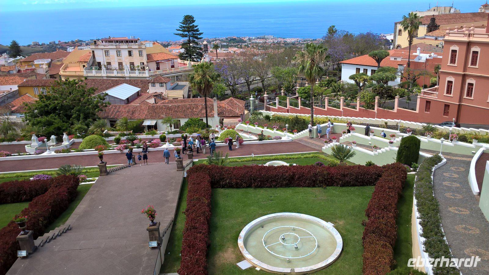 Nach der Rückkehr ins „Tal" treffen wir zunächst die beiden zurückgebliebenen Gäste an den Roques de García und verbringen dort auch noch ein paar Minuten bei einem kleinen Spaziergang um die Felsen. Im Anschluss genießen wir auf dem Weg zur Caldera auf der Terrasse eines niedlichen Lokals unser Mittagessen mitten im Nationalpark, um anschließend weiter durch das Orotava Tal zu fahren. Dort, in Orotava selbst, folgt die Gruppe Anne bei reichlich Erläuterungen und Erklärungen zu Geschichte und Architektur. Die architektonischen Denkmäler und typischen kanarischen Innenhöfe und Balkone bereichern weiterhin unsere Fotosammlung.