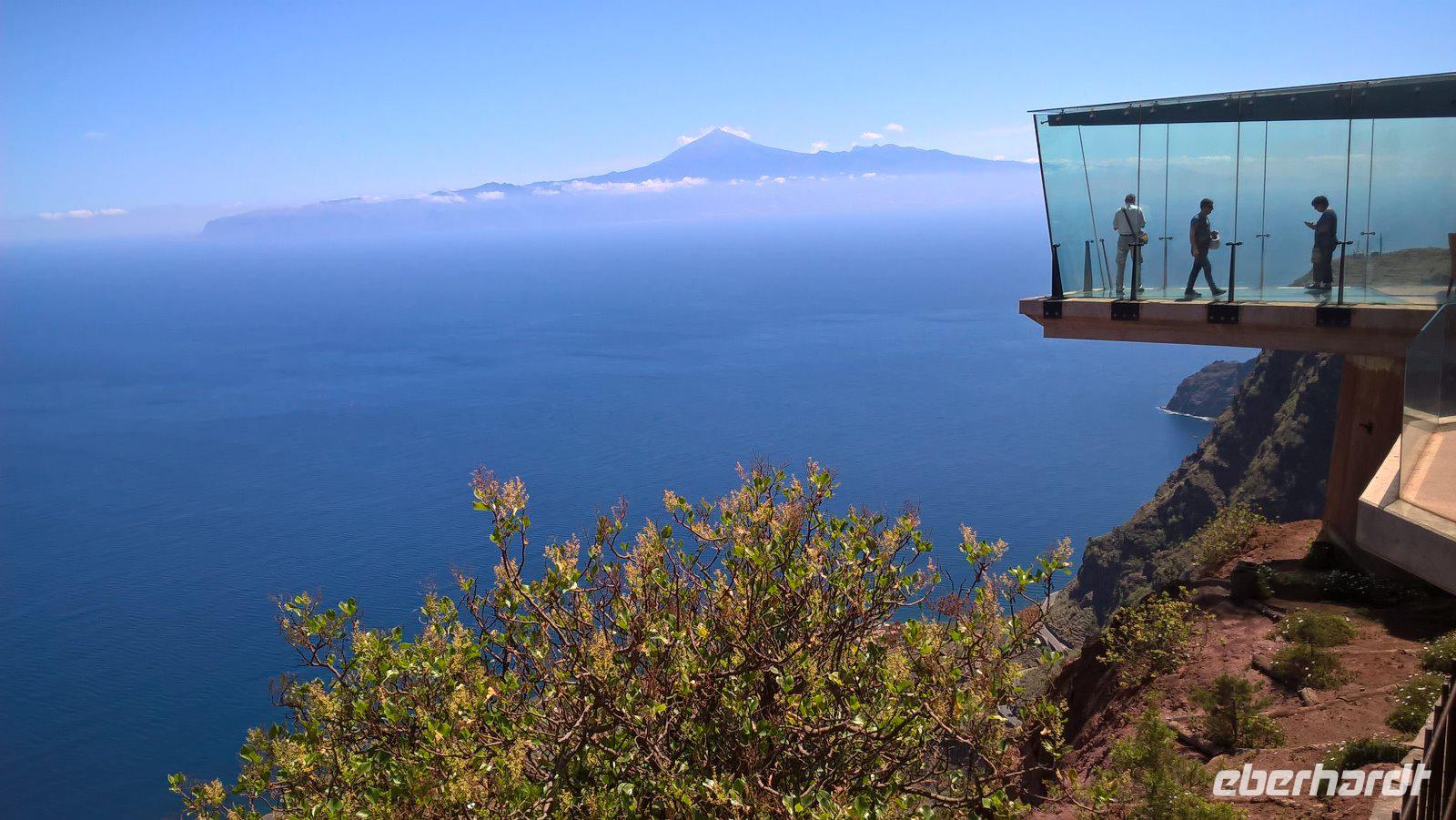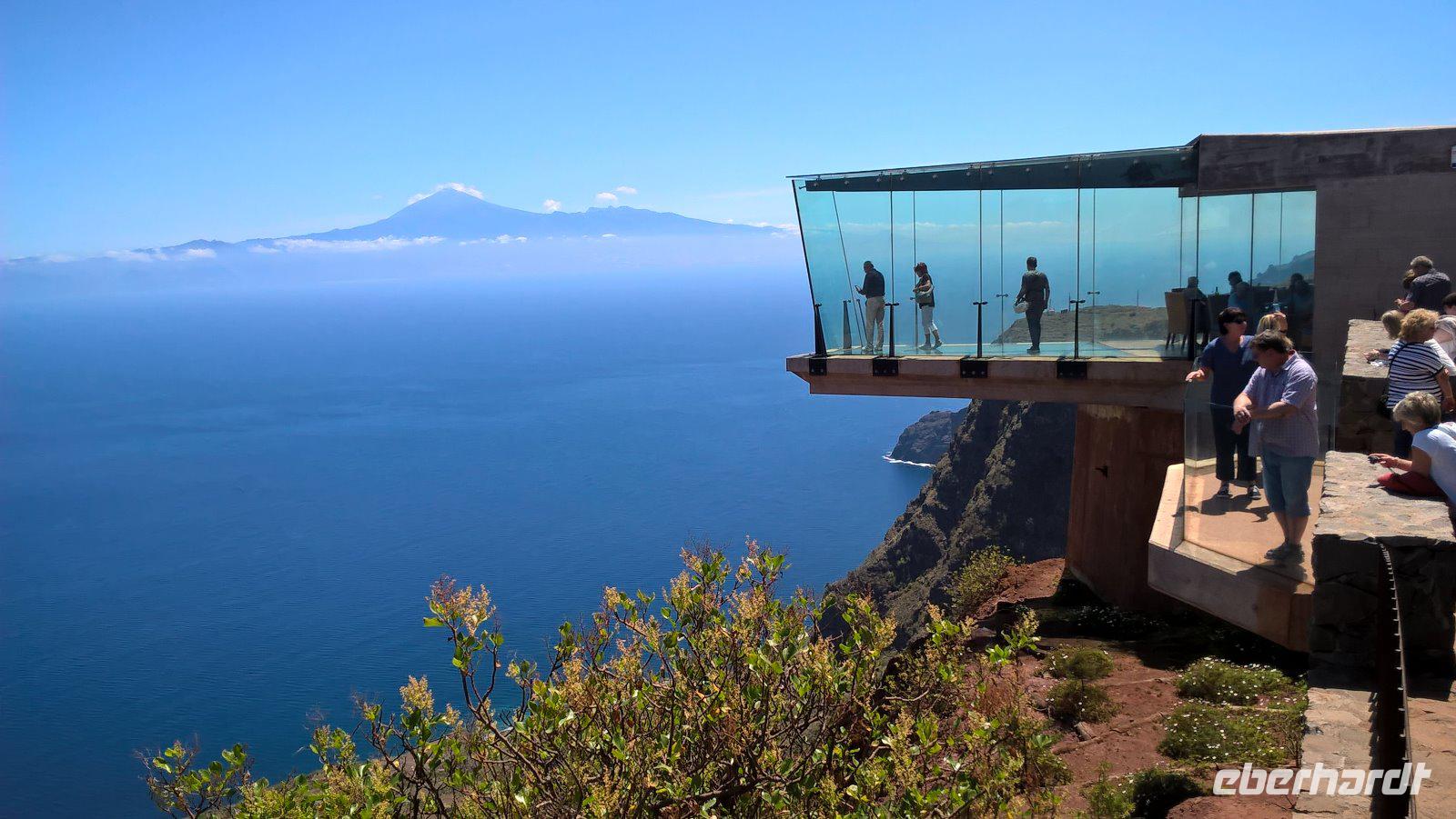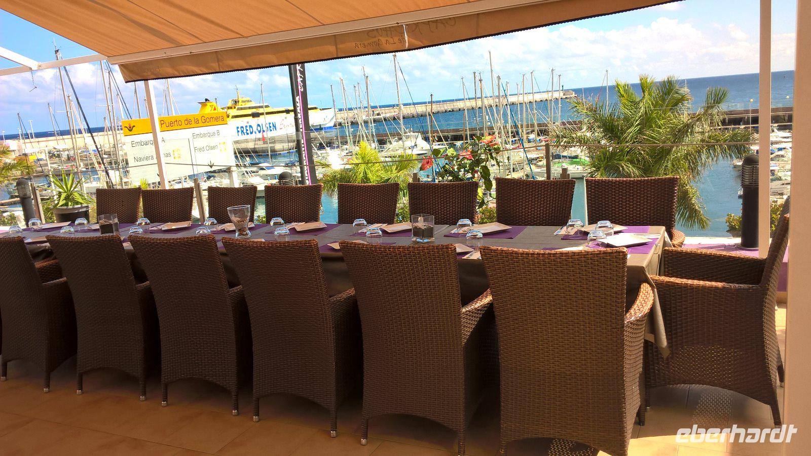 Höhepunkt des heutigen Tages ist das Lokal La Terrazza von Fred Oson. Wir können uns überhaupt nicht sattsehen auf der Plattform, neben der Plattform, unter der Plattform, von allen Seiten wird fotografiert. Und zum Essen bekommen wir die allerbesten Plätze vorn. Auch die Pfeif-Vorführung der ursprünglichen Sprache der Gomeras „El Silbo" fasziniert uns alle. Anschließend fahren wir zurück nach San Sebastian. Melanie macht hier noch eine Stadtrundführung mit den Gästen, während ich als Reiseleiterin mit dem Busfahrer die Koffer hole und schon zum Fährhafen bringe.