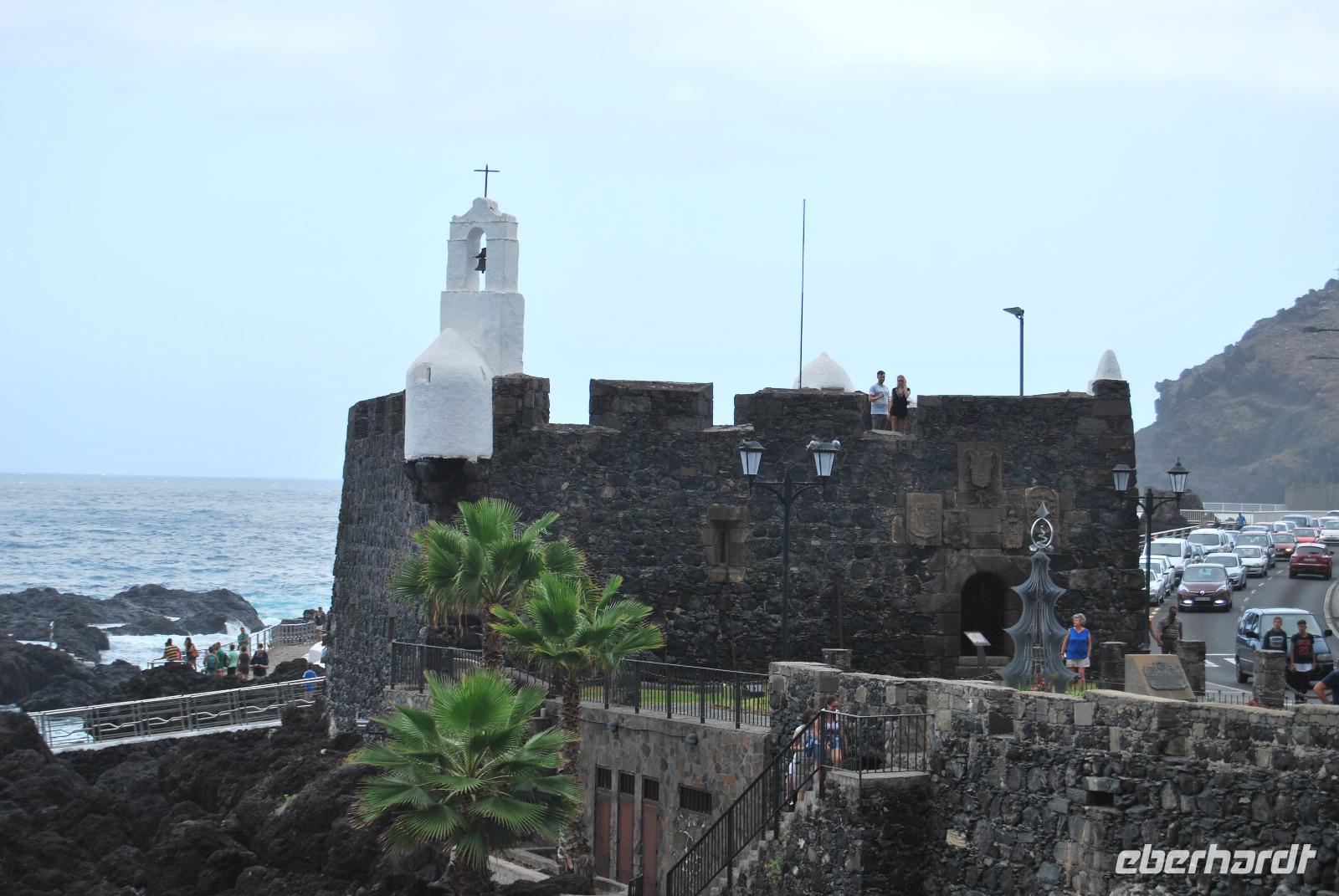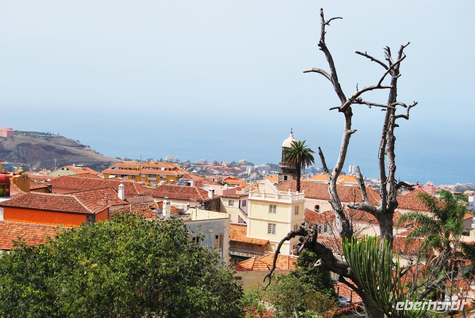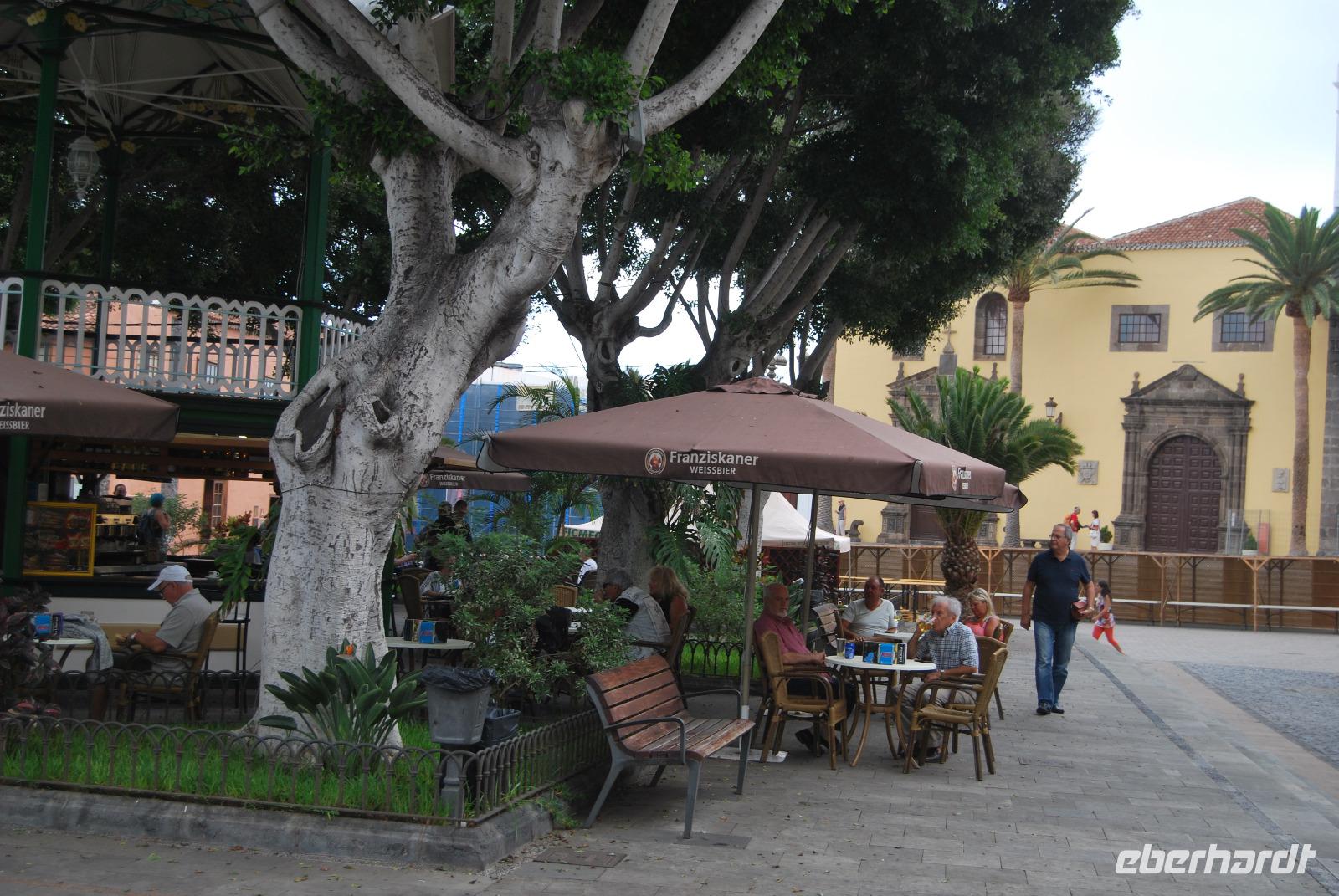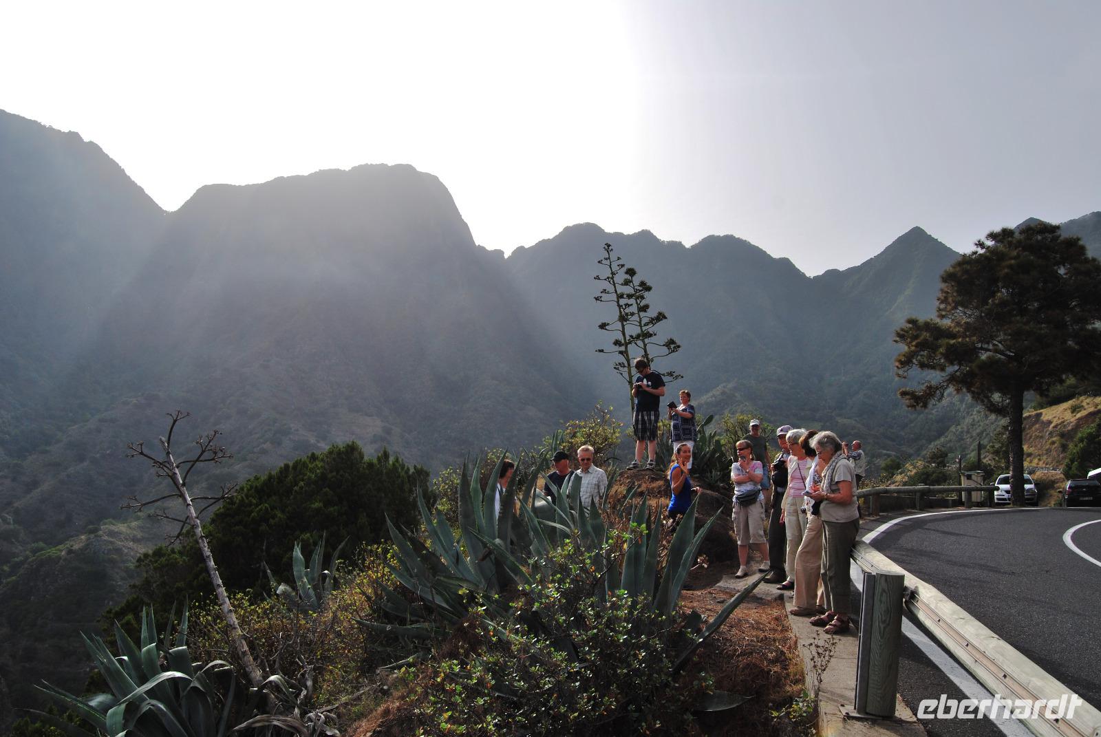 Nach dem ausgiebigen Frühstück machten sich zwei Drittel der Reisegruppe auf zur Busstation. Gemeinsam mit einigen anderen Urlaubern wollten wir den Norden von Teneriffa entdecken. Unser örtlicher Guide Christophe für diesen Tag meisterte die Tour in drei Sprachen - Englisch, Spanisch und Deutsch. Mit dem Bus ging es an die nördliche Spitze nach La Laguna. Im Stadtteil San Christóbal, an der Plaza de Adelantado, stiegen wir aus. Es war vieles abgesperrt und ein paar Menschen liefen zusammen. Vor dem Rathaus standen ein paar hoch ausgezeichnete Soldaten und Staatsmänner, beziehungsweise -frauen. Ein großer Festakt ereignete sich. Mit Militärkapelle und etlichen Kanonenschüssen begann der Marsch auf der Calle Obispo Rey Redondo bis zur Kathedrale von La Laguna. Es wurde der Día del Christo gefeiert - eine Zeremonie einer Christus-Reliquie aus dem 15. Jahrhundert. Mit einer großen katholischen Zeremonie unter Anwesenheit der Bischöfe wurde der 14. September gefeiert und später das Kruzifix an seinen Standort, dem Franziskanerkloster von San Miguel in La Laguna, zurückgebracht. Nach ein wenig Aufenthalt in der Stadt ging es weiter zum Mirador de Jardin, von wo wir einen schönen Ausblick auf die Stadt hatten. In weiter Ferne war auch der gigantische Teide zu sehen. Unsere Fahrt führt uns weiter durch das Anaga Gebirge in den Mercedes-Wald, das ehemalige Reich des Guanchen Königs Beneharo. Gelegentlich schießen uns Rennradfahrer entgegen, für die es hier bei den glatten und kurvenreichen Straßen ein Paradies sein muss. Unsere Tour führte weiter nach Tagana, bis zur Bucht des Roque de las Bodegas, wo sich schon im 17. Jahrhundert ein wichtiger Ankerpunkt für den Weinhandel befand. Dort aßen wir zu Mittag, im Casa Africa. Ein kleiner Spaziergang am schwarzen Sandstrand durfte natürlich nicht fehlen. Zum Abschluss der heutigen Tour ging es nach San Andrés, an den Playa de las Teresitas.