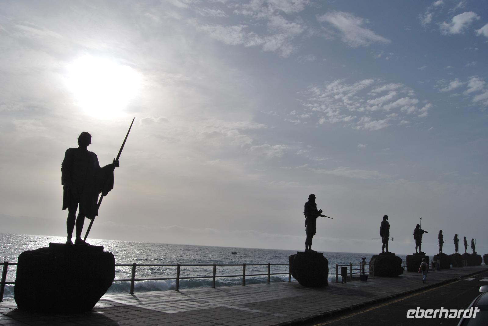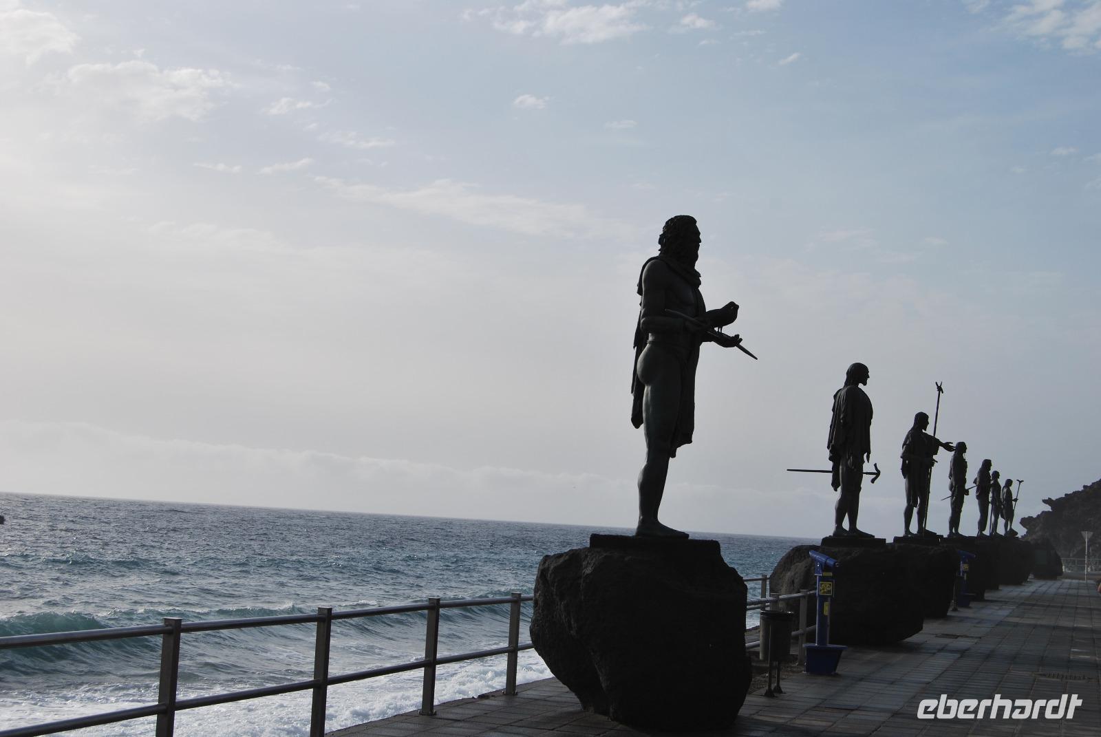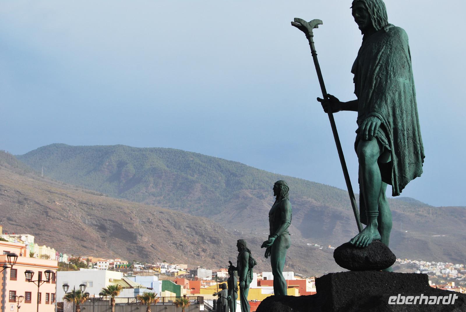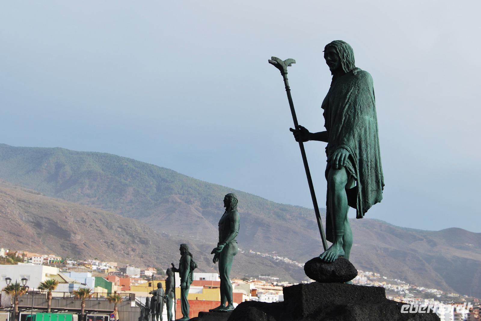 Nach kurzer Lagebesprechung mit unserem Guide Oliver mussten wir unser Programm leider kurzfristig ändern. Eigentlich wollten wir auf den Teide, dem höchsten Berg Spaniens, mit der Seilbahn fahren. Aber leider ließen die schlechten Wetterbedingungen dies nicht zu. Deshalb haben wir uns entschlossen an diesem Freitag unsere Inselrundfahrt zu machen. So fuhren wir mit unserem Panorama-Van an der Ostküste entlang in Richtung Norden nach Candelaria. Dort besichtigten wir die Basilika de la Virgen de Candelaria, ein junges Bauwerk aus dem 20. Jahrhundert. Direkt an der Kirche, bei der Brandung stehend, sind die neun Guanchen-Könige von Teneriffa verewigt. Eindrucksvoll Thronen Sie an der Küste und erinnern an vergangene Zeiten vor der Eroberung der Spanier. Ein paar Meter weiterhinten, ein wenig versteckt, findet man eine kleine Kapelle. Dort wird eine schwarze Madonna vergöttert, die der Legende nach die Ureinwohner schon vergöttert haben, da Sie eines Tages am Strand erschienen ist und ein paar Hirten verwundete und die Flucht trieb. Unser nächster Halt brachte uns nach Santa Cruz zum Auditorium. Die vom spanischen Architekten Santiago Calatrava entworfene Konzerthalle erinnert an eine gigantische Welle und zählt zu den Wahrzeichen der Stadt. Wir reisten weiter in den Nord-Osten zu den Weinbergen. Eine dunkle, graue Wolke hing über uns. Die Sonne kam nicht mehr durch und wir steckten in einem grauen Schleier. Später setzte ein leichter Nieselregen ein. Aber all das konnte uns in keinster Weise abhalten. Wir besichtigten ein Weinmuseum in el Sauzal, wo eine kleine Kostprobe nicht fehlen durfte. Kurze Zeit später waren wir in Puerto de la Cruz, dem Heimatort von Oliver. In einer kleinen Seitengasse, der Calle de Verdad, speisten einige von uns zu Mittag. Anschließend ging es nach Icod de los Vinos wo einst der Guanchen König Pelicar herrschte. Dort angekommen sahen wir den eindrucksvollen Drachenbaum, der wohl größte und älteste der Insel. Man schätzt ihn auf über 1.000 Jahre. Das Angebot der Verkostung von Palmensirup mit Rum, und auch Bananenschnapps in einem nahegelegenen Souvenirshop konnten wir natürlich nicht ausschlagen. Die Fahrt ging dann weiter zu einem Aussichtspunkt von wo wir einen herrlichen Blick auf die Steilküste Los Gigantes hatten. Wir fuhren wieder zurück zum Hotel La Siesta und bereiteten uns allmählich auf das abendliche Buffet vor.