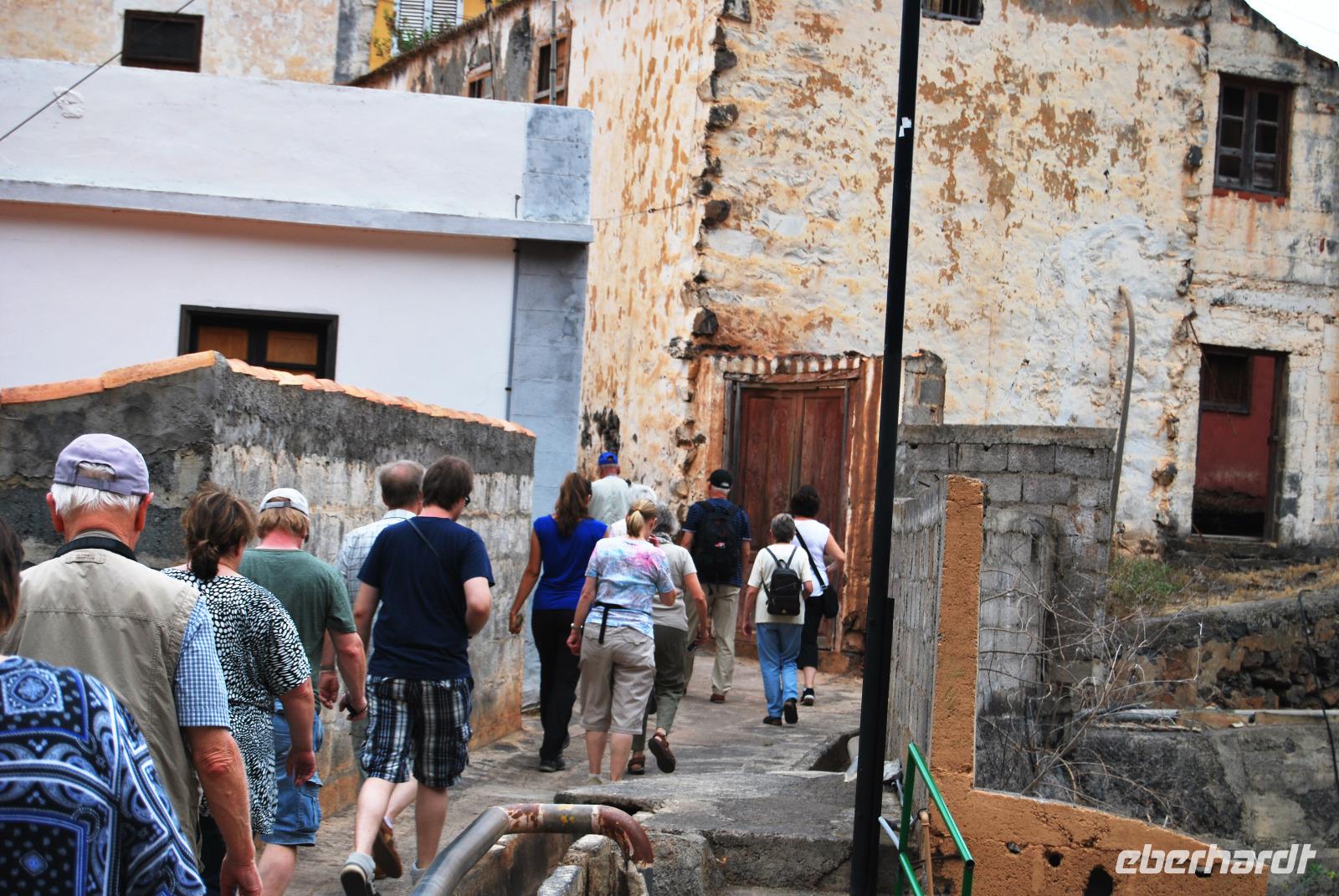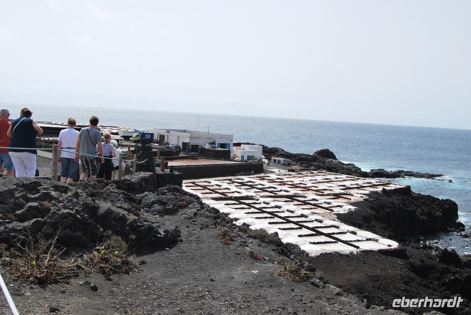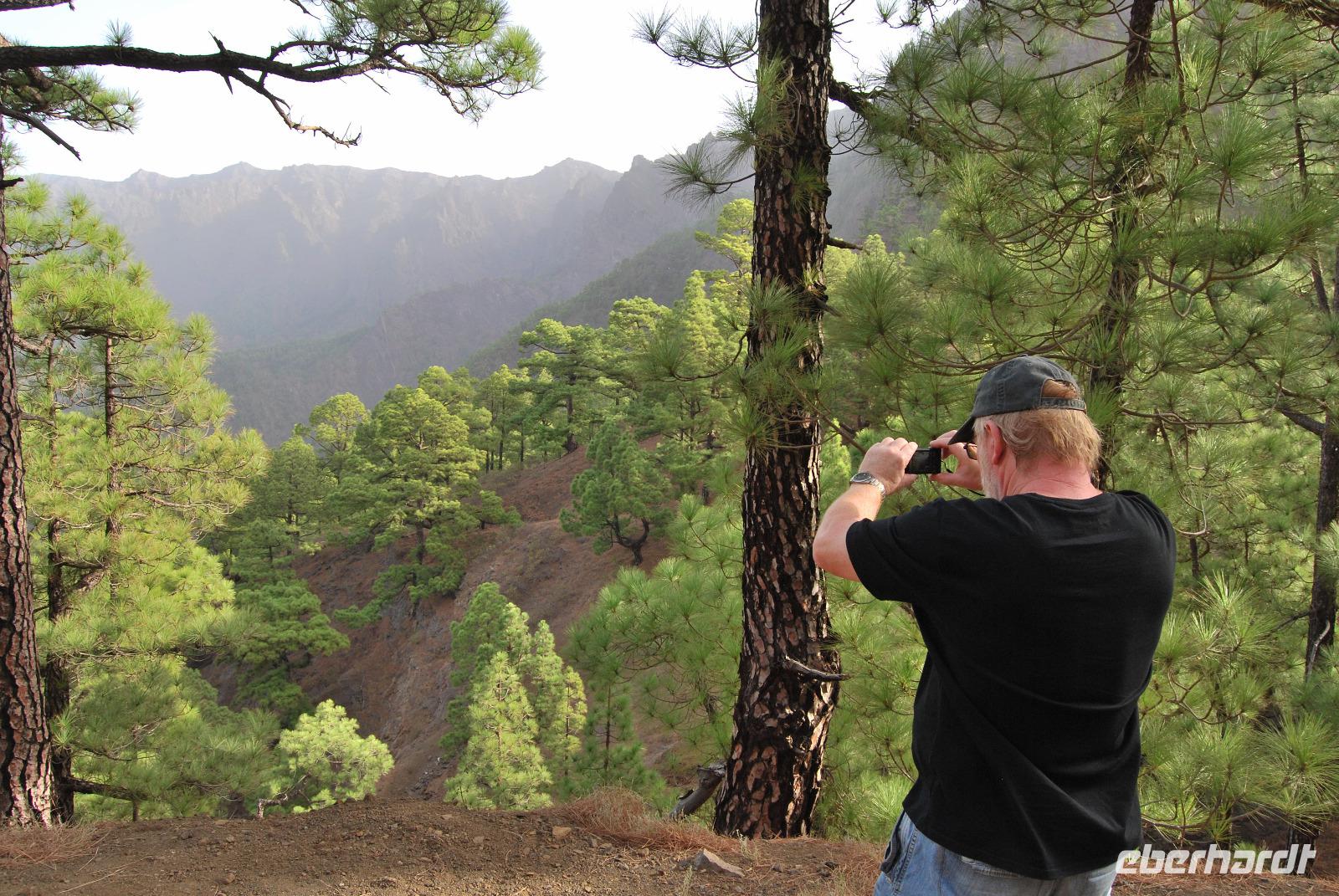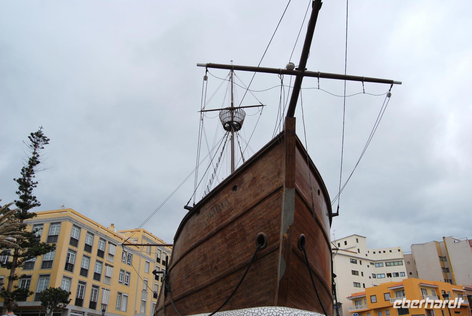 Am heutigen Morgen holte uns Rudi vom Hotel ab. Die heutige Tour führte uns direkt in den Nationalpark Caldera de Taburiente zum Mirador de la Cumbrecita. Von dort konnten wir direkt in den gigantischen Kessel des Vulkans schauen. Das gesamte Gelände ist mit kanarischen Kiefern zugewachsen. Wir spazierten ein wenig den Berg hinunter, bis wir zu einem kleinen Plato gelangten. Dann ging es wieder zurück in den Bus und wir fuhren zum knapp dreißig Kilometer entfernten Volcan San Antonio. Durch das anliegende Besucherzentrum gelangte man auf den Kraterrand des einst aktiven Schlots. Über einen schmalen Schotter und Kiesweg passierten wir die Hälfte des Kraters. Von dort hatten wir einen herausragenden Blick auf Las Indias und Los Quemados. Auch der nun etwas tiefer liegende Vulkan Teneguía mit seinen 439 Metern war nun gut zu erkennen. Man konnte beinahe in den erst 1971 ausgebrochenen Schlot sehen. Als wir diesen Ort besichtigt hatten führte uns Rudi an den Fuß des Teneguía zu zwei Leuchttürmen. Dabei passierten wir riesige Bananenplantagen die auf 1971 durch den Vulkan neugeschaffenen Land errichtet wurden. Gleich hinter den Türmen befindet sich die Salz-Saline von Fuencaliente. An den beeindruckenden Salzbecken machten wir unsere Mittagspause. Nach dem wir uns wieder gestärkt hatten ging es in die Keramikwerkstatt el Molino von Don Ramón. Er zeigt uns seine Arbeitsweise und ließ uns bei ihm und seinen Kollegen über die Schulter schauen. Don Ramón ist einer der wenigen Menschen die es beherrschen die Kunstvollen Keramiken im Stile der Guanchen herzustellen. Jedes Muster wurde analysiert und entsprechende Zeichnungen gefertigt. Nach den Vorgaben der Ureinwohner fertigt der alte Meister die ziervollen Schalen und Krüge. Bevor es nun in die Stadt Santa Cruz de La Palma ging, hielten wir in der Wallfahrtskirche Maria von Schnee - Santuario de Nuestra Señora de las Nieves. Berühmt ist die Kirche auf Grund der Prozession, wo die Jungfrau von Schnee auf einer Sänfte bis nach Santa Cruz getragen wird, die alle fünf Jahre stattfindet. Die Tradition aus dem 17. Jahrhundert soll Dürreperioden und magere Ernten fernhalten. Als wir dann in Santa Cruz hielten, stiegen wir am Denkmal des Kolumbusschiffes Maria, an der Plaza de La Alameda, aus. Gleich daneben, ein Denkmal für den Zwergentanz. Ein lustiger, aber auch sehr kräftezehrender Tanz für den man in außerordentlich guter Verfassung sein muss und den man auch nicht so einfach tanzen darf. Es ist eine große Ehre für die Sportler, die diesen Tanz alle fünf Jahre in Verbindung mit dem Fest der Jungfrau von Schnee tanzen dürfen.