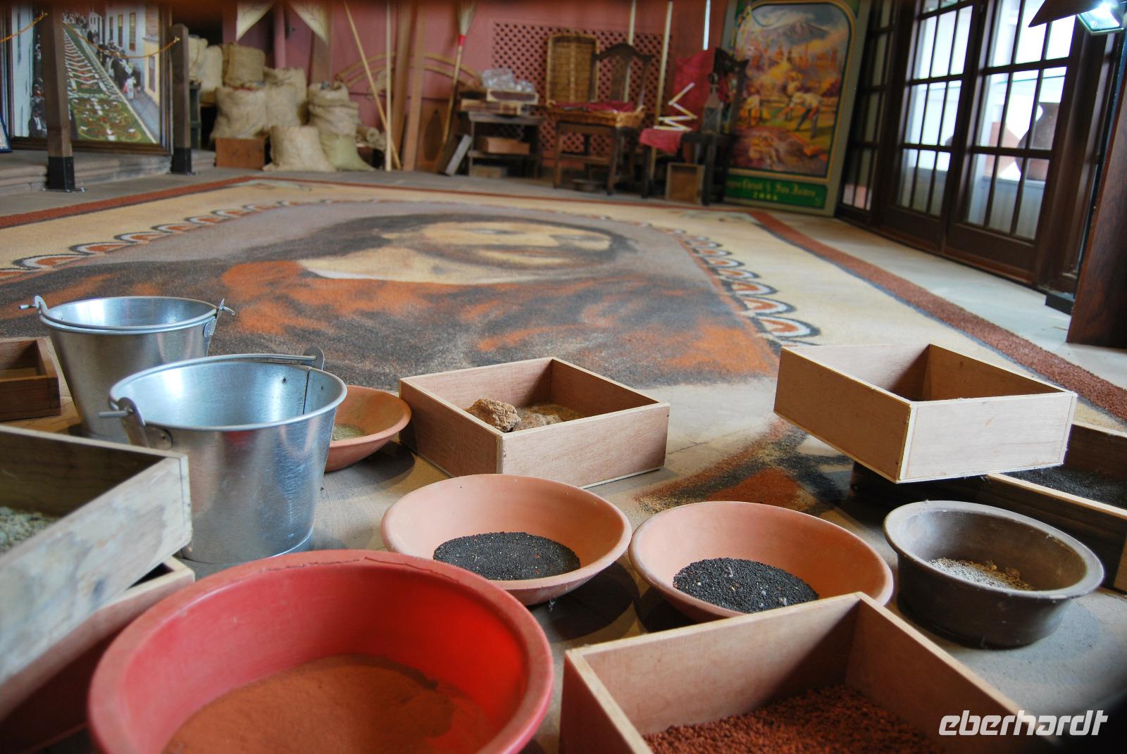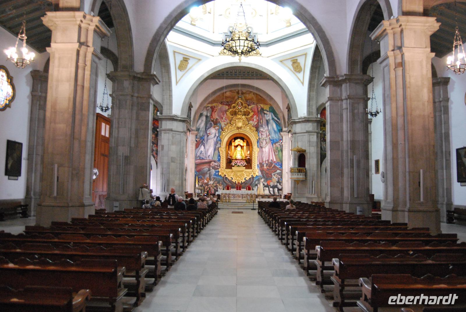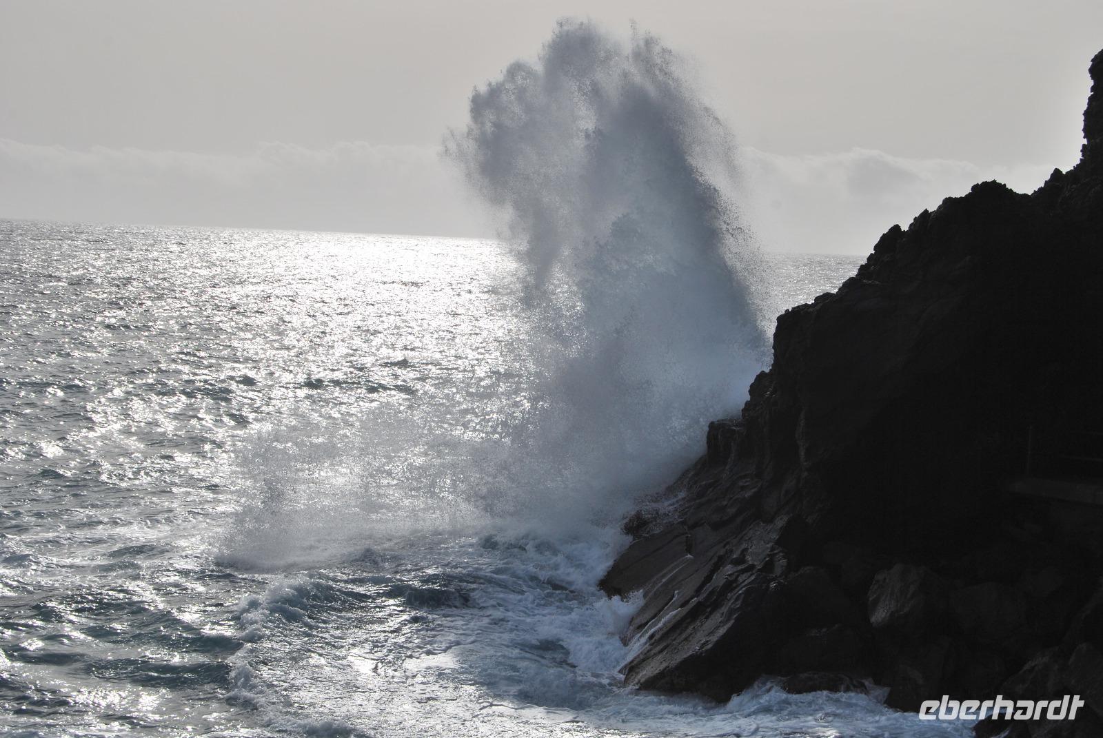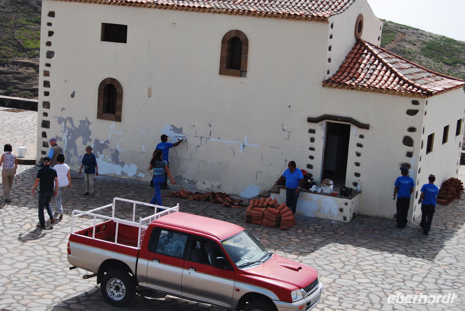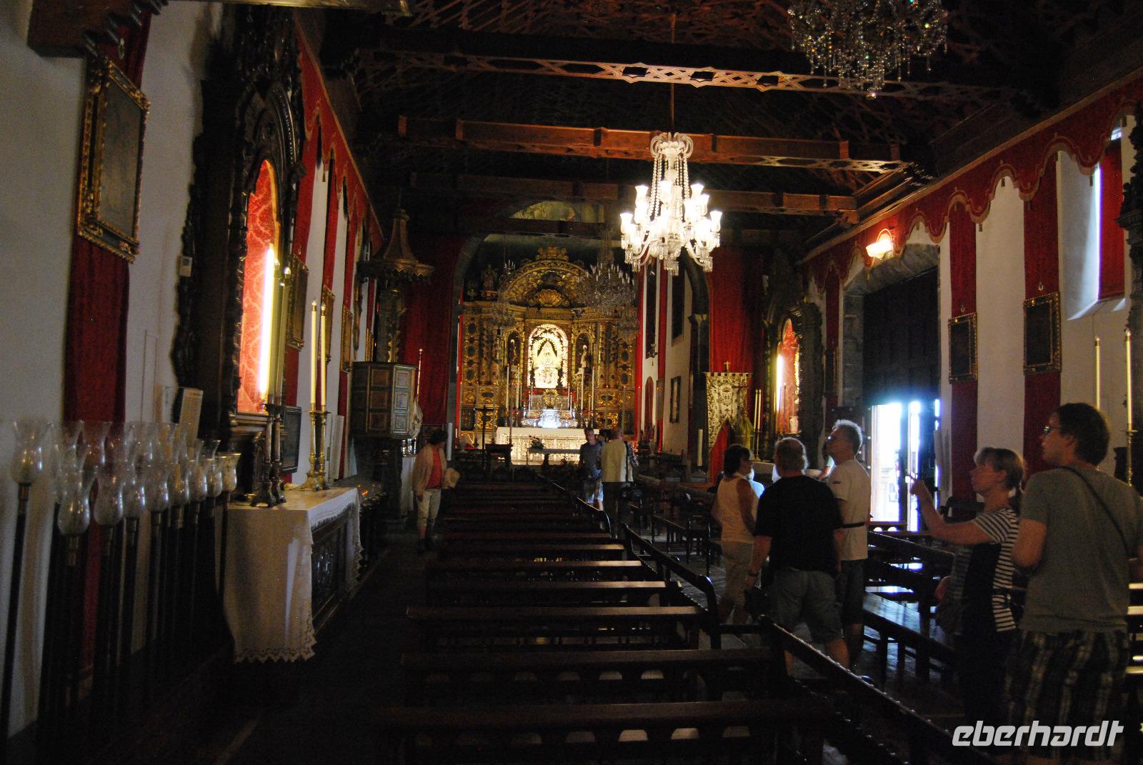 Am heutigen Morgen holte uns Rudi vom Hotel ab. Die heutige Tour führte uns direkt in den Nationalpark Caldera de Taburiente zum Mirador de la Cumbrecita. Von dort konnten wir direkt in den gigantischen Kessel des Vulkans schauen. Das gesamte Gelände ist mit kanarischen Kiefern zugewachsen. Wir spazierten ein wenig den Berg hinunter, bis wir zu einem kleinen Plato gelangten. Dann ging es wieder zurück in den Bus und wir fuhren zum knapp dreißig Kilometer entfernten Volcan San Antonio. Durch das anliegende Besucherzentrum gelangte man auf den Kraterrand des einst aktiven Schlots. Über einen schmalen Schotter und Kiesweg passierten wir die Hälfte des Kraters. Von dort hatten wir einen herausragenden Blick auf Las Indias und Los Quemados. Auch der nun etwas tiefer liegende Vulkan Teneguía mit seinen 439 Metern war nun gut zu erkennen. Man konnte beinahe in den erst 1971 ausgebrochenen Schlot sehen. Als wir diesen Ort besichtigt hatten führte uns Rudi an den Fuß des Teneguía zu zwei Leuchttürmen. Dabei passierten wir riesige Bananenplantagen die auf 1971 durch den Vulkan neugeschaffenen Land errichtet wurden. Gleich hinter den Türmen befindet sich die Salz-Saline von Fuencaliente. An den beeindruckenden Salzbecken machten wir unsere Mittagspause. Nach dem wir uns wieder gestärkt hatten ging es in die Keramikwerkstatt el Molino von Don Ramón. Er zeigt uns seine Arbeitsweise und ließ uns bei ihm und seinen Kollegen über die Schulter schauen. Don Ramón ist einer der wenigen Menschen die es beherrschen die Kunstvollen Keramiken im Stile der Guanchen herzustellen. Jedes Muster wurde analysiert und entsprechende Zeichnungen gefertigt. Nach den Vorgaben der Ureinwohner fertigt der alte Meister die ziervollen Schalen und Krüge. Bevor es nun in die Stadt Santa Cruz de La Palma ging, hielten wir in der Wallfahrtskirche Maria von Schnee - Santuario de Nuestra Señora de las Nieves. Berühmt ist die Kirche auf Grund der Prozession, wo die Jungfrau von Schnee auf einer Sänfte bis nach Santa Cruz getragen wird, die alle fünf Jahre stattfindet. Die Tradition aus dem 17. Jahrhundert soll Dürreperioden und magere Ernten fernhalten. Als wir dann in Santa Cruz hielten, stiegen wir am Denkmal des Kolumbusschiffes Maria, an der Plaza de La Alameda, aus. Gleich daneben, ein Denkmal für den Zwergentanz. Ein lustiger, aber auch sehr kräftezehrender Tanz für den man in außerordentlich guter Verfassung sein muss und den man auch nicht so einfach tanzen darf. Es ist eine große Ehre für die Sportler, die diesen Tanz alle fünf Jahre in Verbindung mit dem Fest der Jungfrau von Schnee tanzen dürfen.