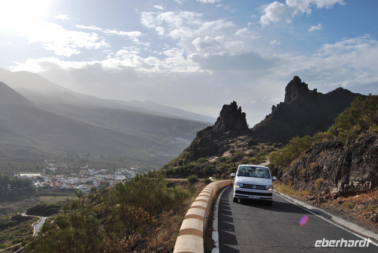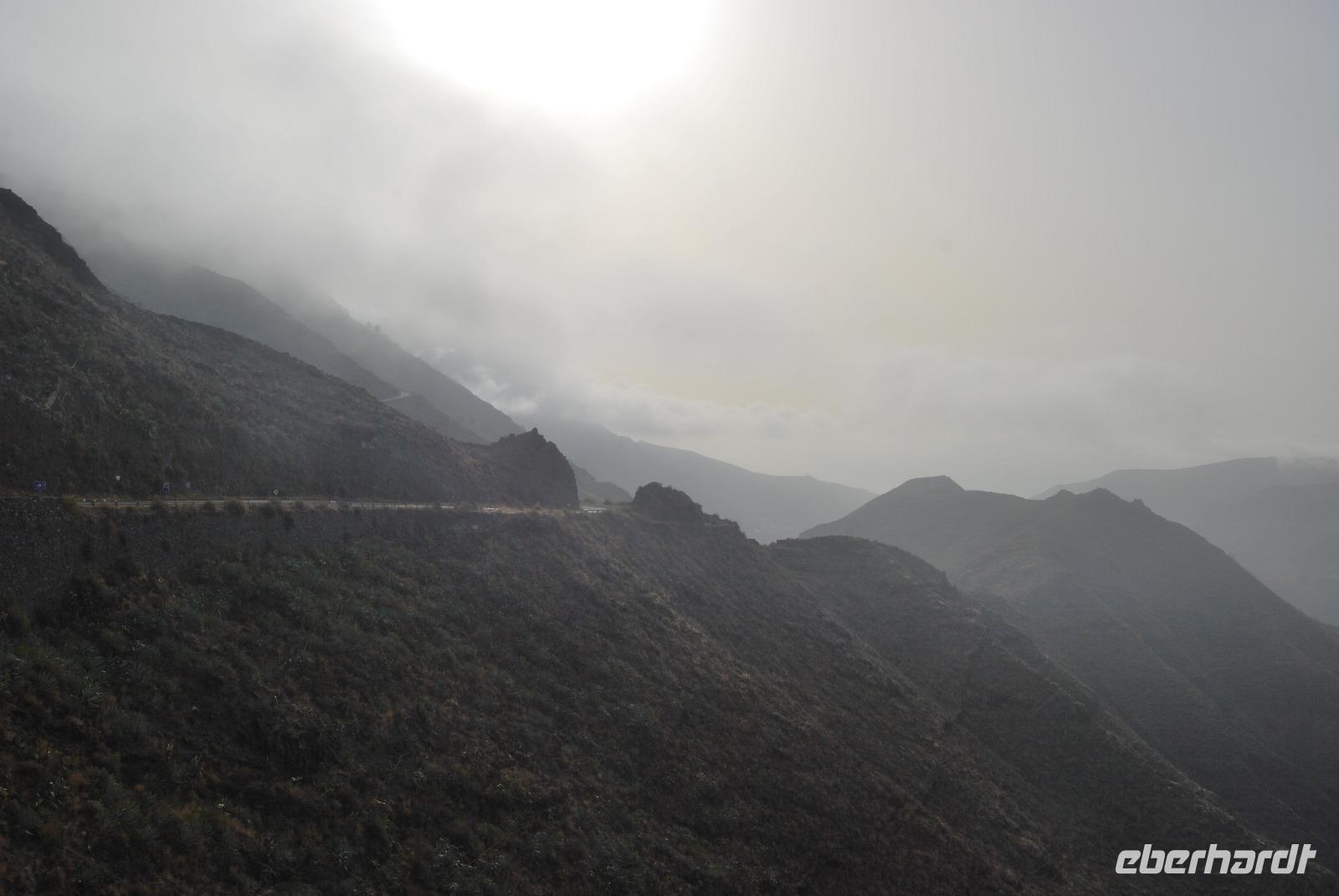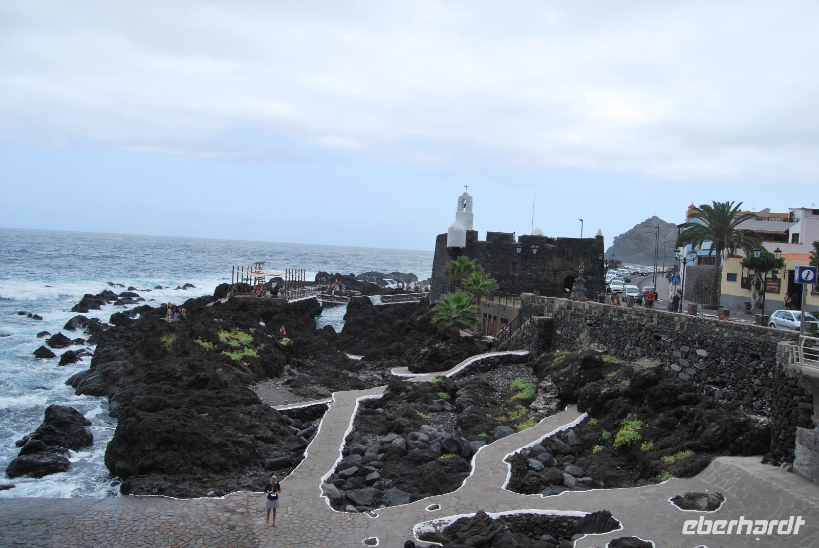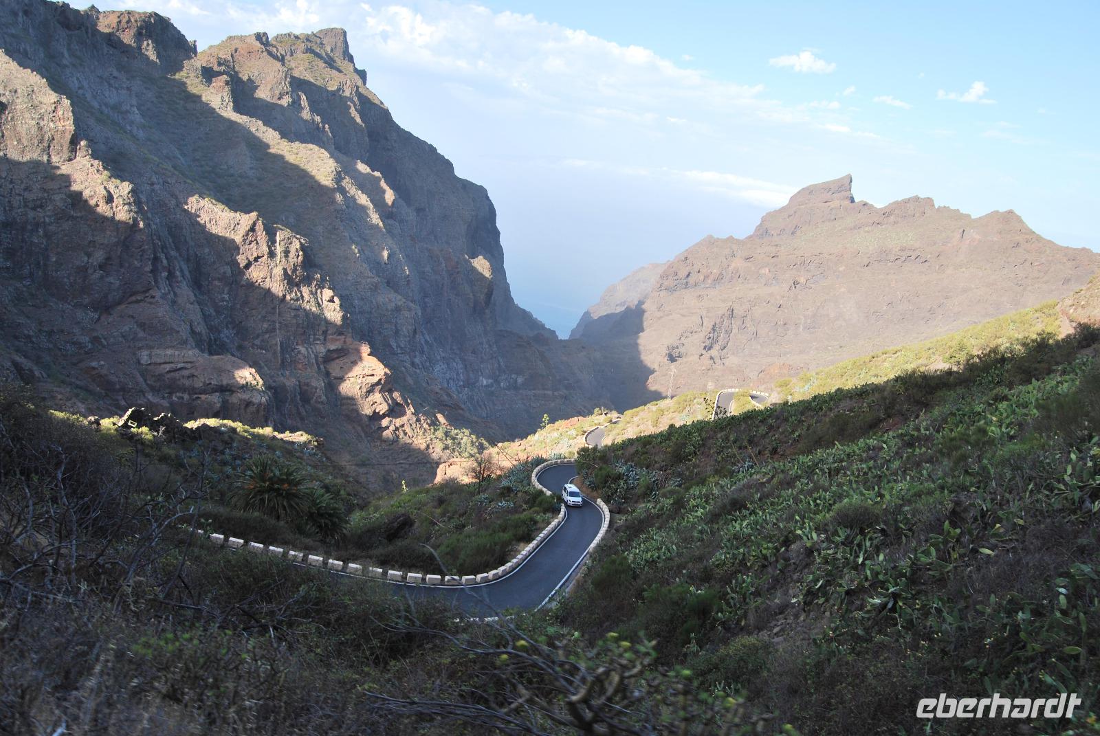 Am heutigen Tag holte uns Gisela vom Hotel ab. Wir fuhren in den Osten von Teneriffa nach Santiago del Teide. Dort bogen wir in eine schmale Straße ein und es ging steil und kurvig aufwärts. Am Pass angekommen legten wir noch einen Foto-Stopp ein und genossen die erfrischende Aussicht in das weite Land. Die Morgensonne strahlte uns entgegen. Wir öffneten das Dach unseres Panorama-Vans und fuhren den steilen Serpentinen zum Dorf Masca hinunter. Die frische Bergluft wehte uns durch die Haare. Das kleine Bergdorf, welches bis vor wenigen Jahrzehnten nur zu Fuß zu erreichen war, lud uns zu einem Spaziergang durch die urigen Wege ein. Tief in der Schlucht gelegen, hielt es schon einige steile Anstiege bereit. Nach einer kleinen Pause und einem frischen Getränk ging die Reise weiter. Wir folgten der Straße weiter Richtung Norden. Als wir um einem Bergkamm herum kamen zogen Nebelschwaden den Berg herunter. Die Wetterscheide! Wir stecken schnell in einem dichten Nebel. Das Wasser von den Passatwinden drückte an die Nordseite. In Garachico besichtigten wir die Altstadt mit Ihrem idyllischen Marktplatz und kehrten nahe der Küsten-Burg Castillo de San Miguel aus dem 16. Jahrhundert zum Mittagstisch ein. Auf dem Nachhause weg ins Hotel machten wir noch halt in einem Café und probierten den landestypischen Barraquito. Ein Café-Getränk mit Milch, Likör und Zimt und Zitrone. Die Fahrt dorthin führte uns an Lavagestein vorbei, wir sahen die Erosion von 1909 welche zu den jüngeren vulkanischen Ausbrüchen zählt. Zahlreiche Kakteen und Mandel- sowie Feigenbäume sahen wir nahe der Straße.