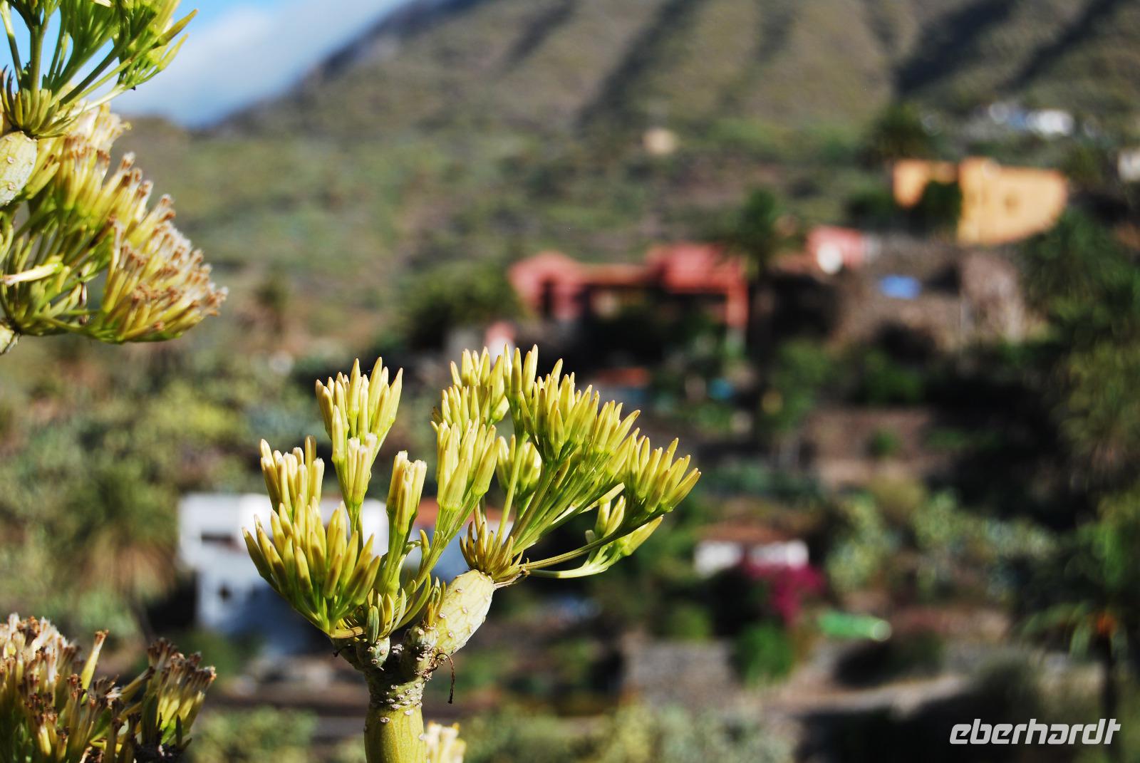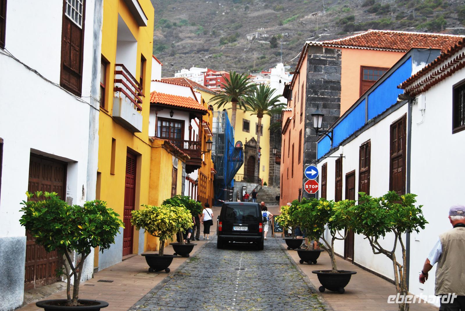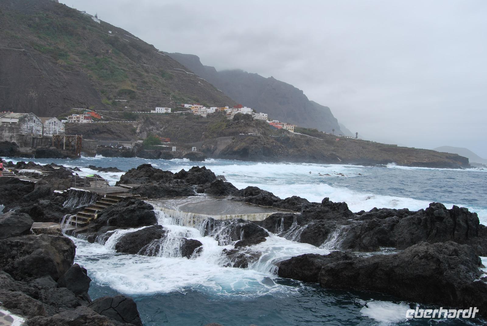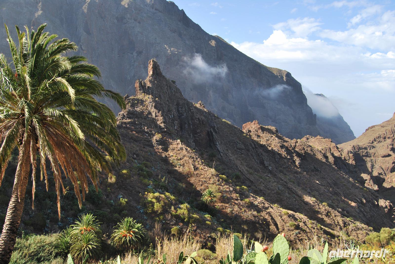 Am heutigen Tag holte uns Gisela vom Hotel ab. Wir fuhren in den Osten von Teneriffa nach Santiago del Teide. Dort bogen wir in eine schmale Straße ein und es ging steil und kurvig aufwärts. Am Pass angekommen legten wir noch einen Foto-Stopp ein und genossen die erfrischende Aussicht in das weite Land. Die Morgensonne strahlte uns entgegen. Wir öffneten das Dach unseres Panorama-Vans und fuhren den steilen Serpentinen zum Dorf Masca hinunter. Die frische Bergluft wehte uns durch die Haare. Das kleine Bergdorf, welches bis vor wenigen Jahrzehnten nur zu Fuß zu erreichen war, lud uns zu einem Spaziergang durch die urigen Wege ein. Tief in der Schlucht gelegen, hielt es schon einige steile Anstiege bereit. Nach einer kleinen Pause und einem frischen Getränk ging die Reise weiter. Wir folgten der Straße weiter Richtung Norden. Als wir um einem Bergkamm herum kamen zogen Nebelschwaden den Berg herunter. Die Wetterscheide! Wir stecken schnell in einem dichten Nebel. Das Wasser von den Passatwinden drückte an die Nordseite. In Garachico besichtigten wir die Altstadt mit Ihrem idyllischen Marktplatz und kehrten nahe der Küsten-Burg Castillo de San Miguel aus dem 16. Jahrhundert zum Mittagstisch ein. Auf dem Nachhause weg ins Hotel machten wir noch halt in einem Café und probierten den landestypischen Barraquito. Ein Café-Getränk mit Milch, Likör und Zimt und Zitrone. Die Fahrt dorthin führte uns an Lavagestein vorbei, wir sahen die Erosion von 1909 welche zu den jüngeren vulkanischen Ausbrüchen zählt. Zahlreiche Kakteen und Mandel- sowie Feigenbäume sahen wir nahe der Straße.