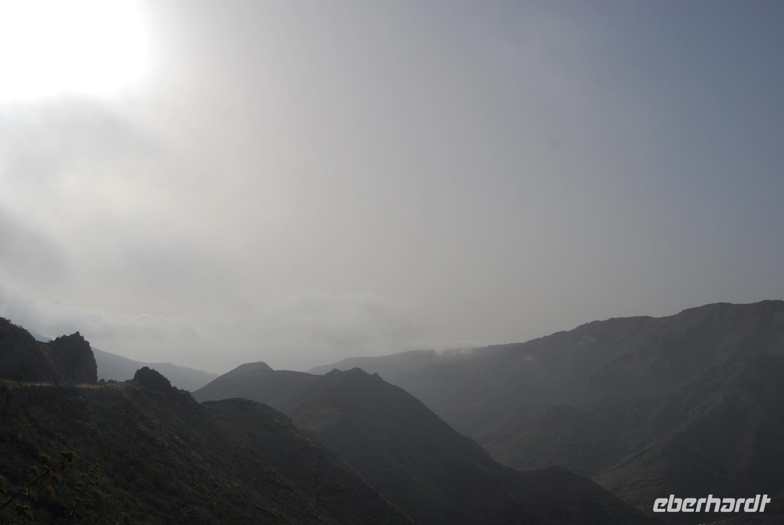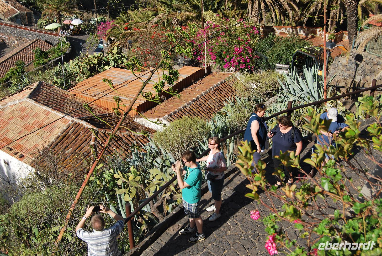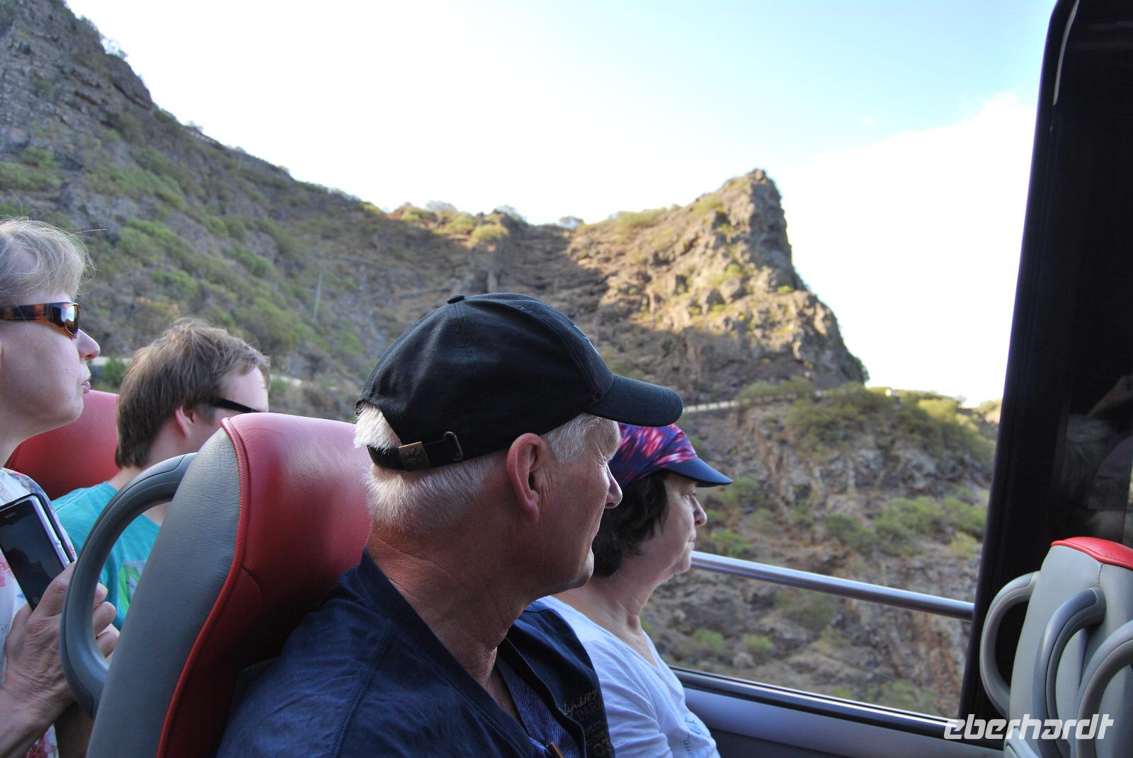 Nach dem Frühstück verladen wir wieder unser Gepäck, denn schon am Abend soll es wieder auf die nächste Insel gehen. Wir spazieren durch San Sebastián bis uns der Busfahrer wieder einsammelt. Wir nehmen diesmal die nördliche Passstraße und halten zuerst am Mirador de Manaderos. Von dort blicken wir in das Tal von Chejelipes und El Atajo. Wir fahren weiter durch den Nationalpark Garajonay, der mit seinem urtypischen Lorbeerwald beeindruckt. Ein fantastisches Lichtspiel ereignet sich bei der Fahrt durch den lichtdurchfluteten Urwald. Wir passierten Las Rosas und La Palmita. In Agulo angekommen unternahmen wir einen Spaziergang durch das eintausend Seelen Örtchen. Um zum Mittagessen zu gelangen mussten wir mit dem Bus noch eine Steile Bergwand überwinden. Hoch oben sah man schon das kleine Lokal über den Hang ragen. Die schmale Straße dorthin führte an einen kargen, feuer-roter Erde vorbei. Nachdem wir im Mirador de Abrante gegessen hatten, führten uns die Kellner die für La Gomera typische Pfeifsprache vor. Denn nur so konnten sich die Bewohner der Insel über die weiten Schluchten hinweg unterhalten. Am Nachmittag ging es dann zurück nach San Sebastián. Auf dem Weg dorthin, hielten wir noch einmal am Rocke de Sombrero, welches ein gewaltiges Felsmassiv mit gewaltige Schluchten ist. Ein wirklich spektakuläres Panorama!