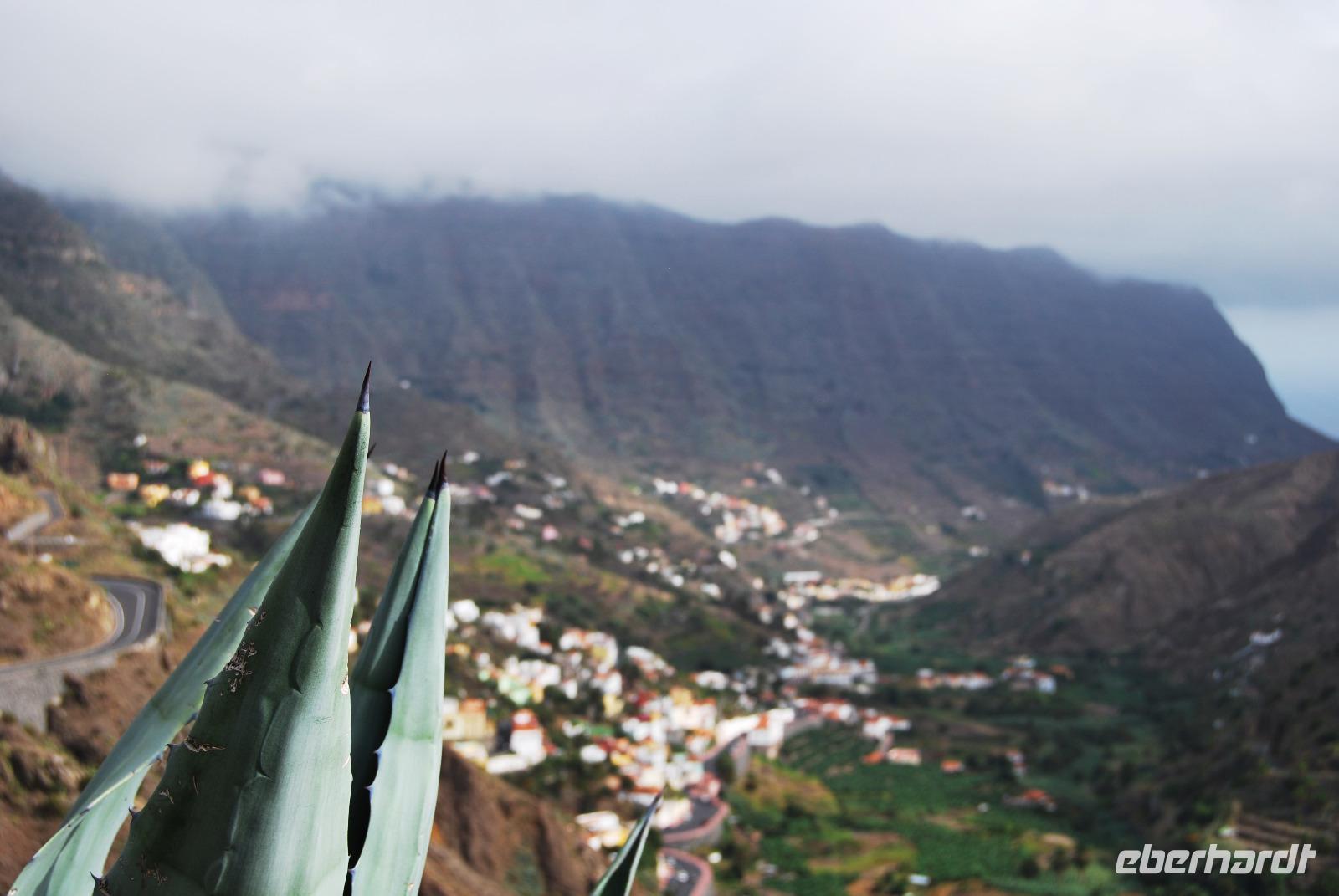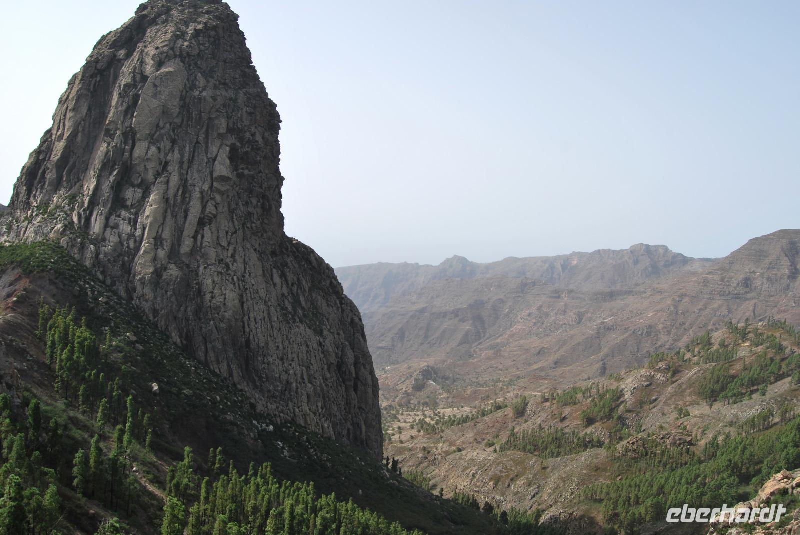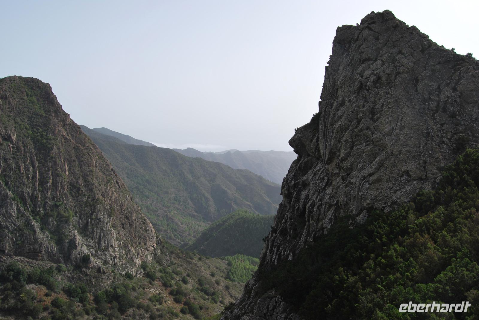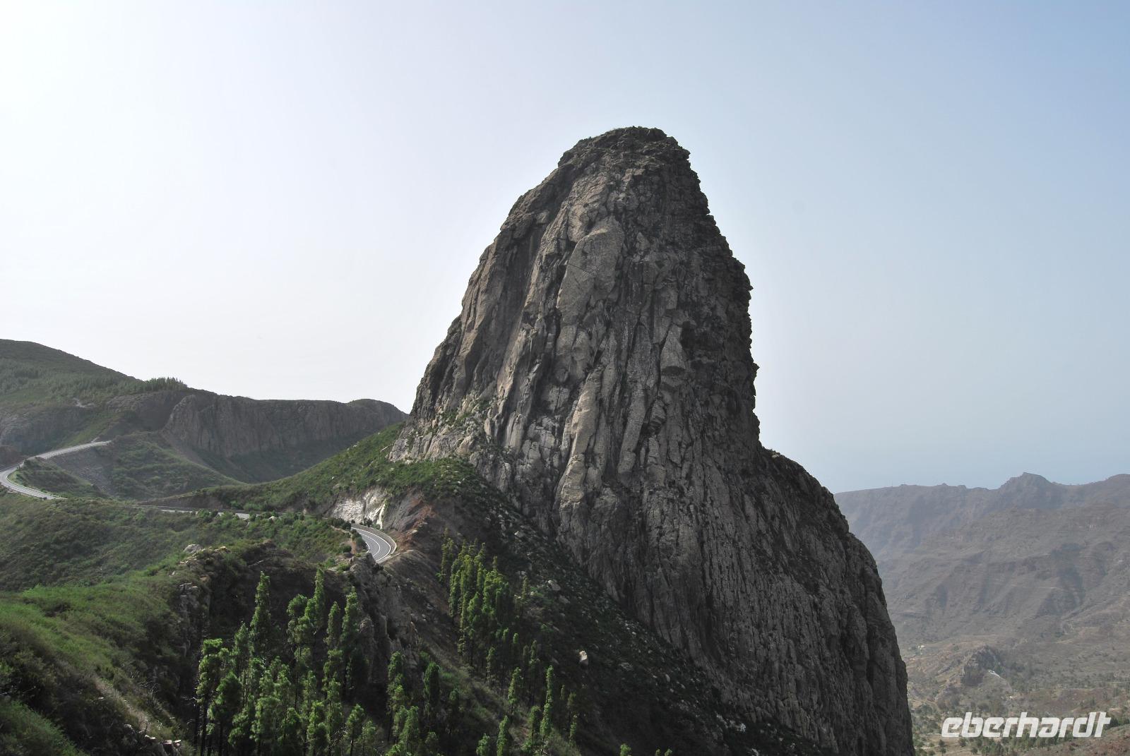 Wir starteten unseren Tag etwas zeitiger als zuvor. Es war an der Zeit die Insel zu verlassen. Wir schipperten mit der Fähre auf die Nachbarinsel La Gomera und legten in San Sebastián an. Dort angekommen wartete Anahi auf uns und schon ging es los! Nachdem das Gepäck sicher verstaut war fuhren wir die steilen Hänge hinauf. Bei der Felsgruppe Los Roques - die Felsen - angekommen, bestaunten wir die Felslandschaft und die Pflanzenwelt. Besonders der Roque de Agando beeindruckte mich sehr. Der 1.251 Meter über dem Meer gelegene Vulkanschlot macht auf mich einen heiligen Eindruck. Anahi berichtet uns, dass schon einst die Guanchen ihn als eine Art Tempel verwendeten. Denn es wurden einige Artefakte dort gefunden. Die Verlockung diesen Tempel eines Tages zu besteigen ist schon groß - aber leider nicht erlaubt.