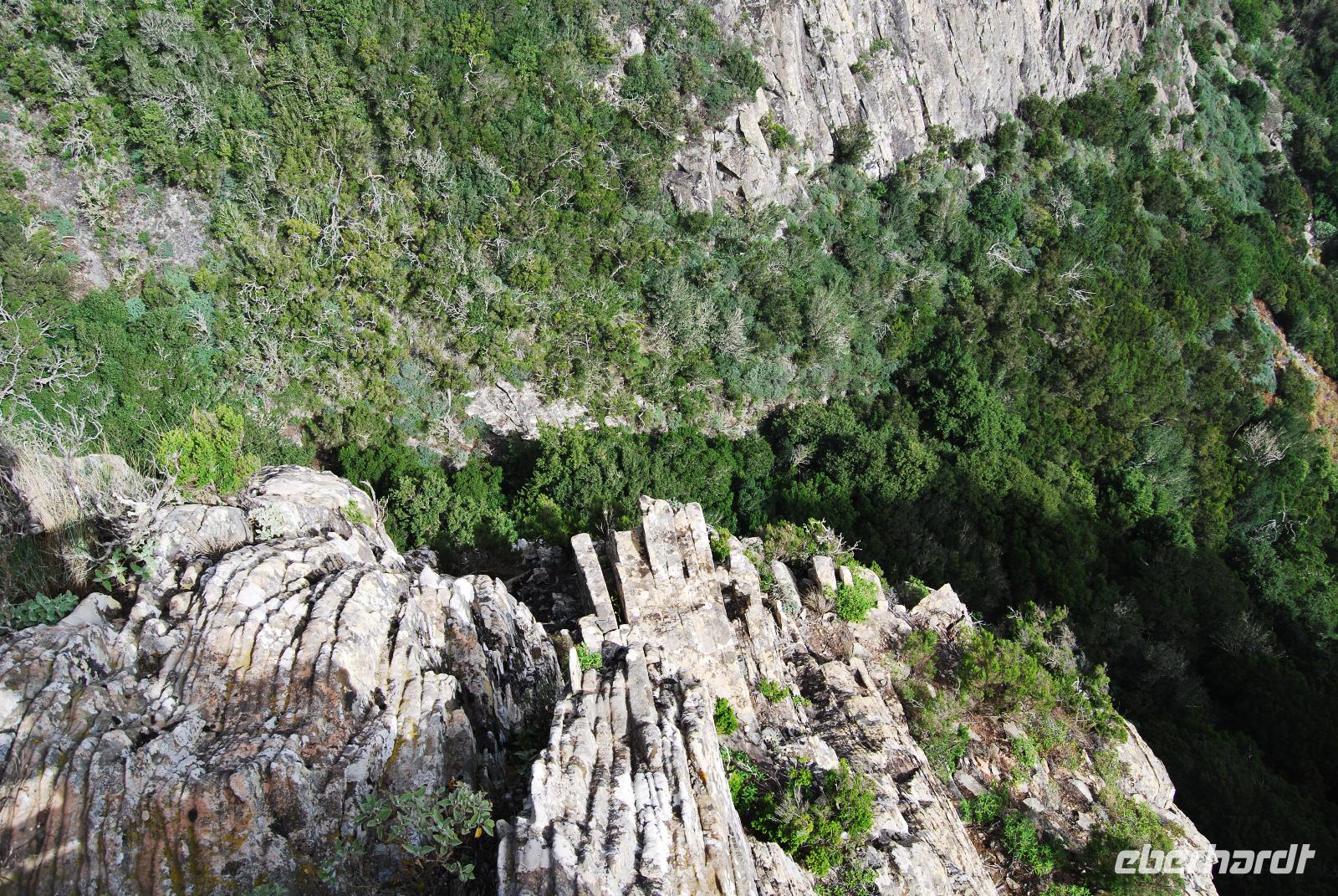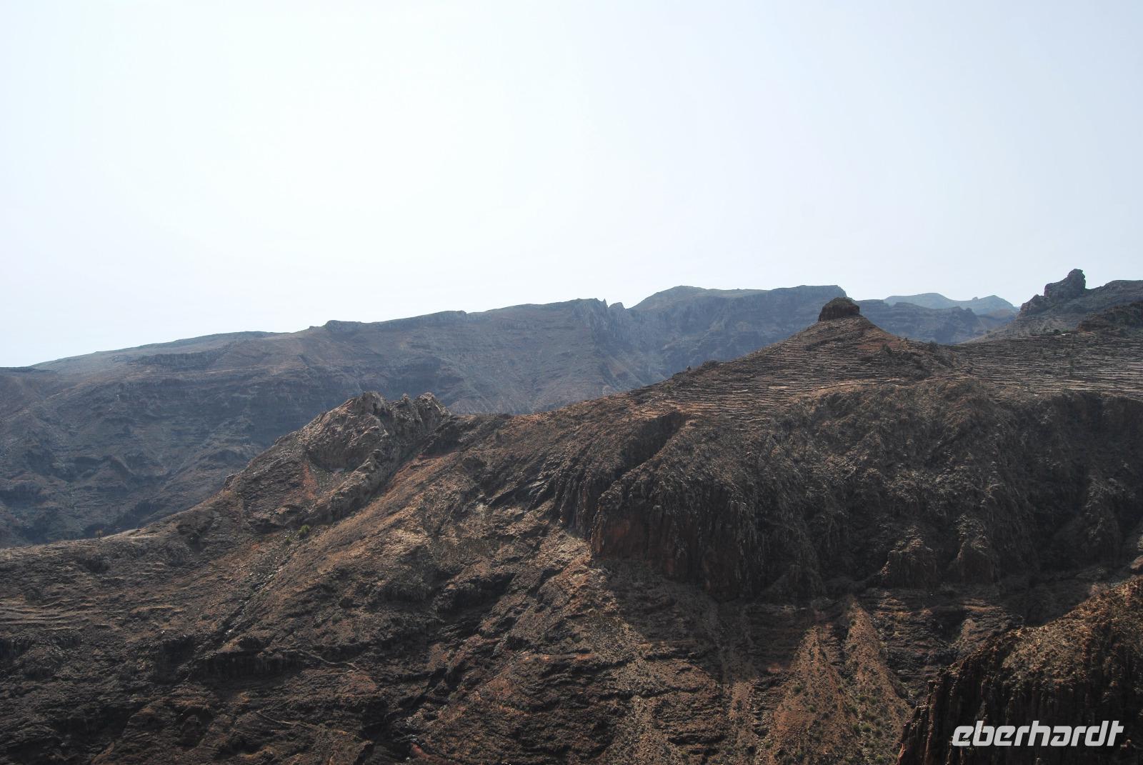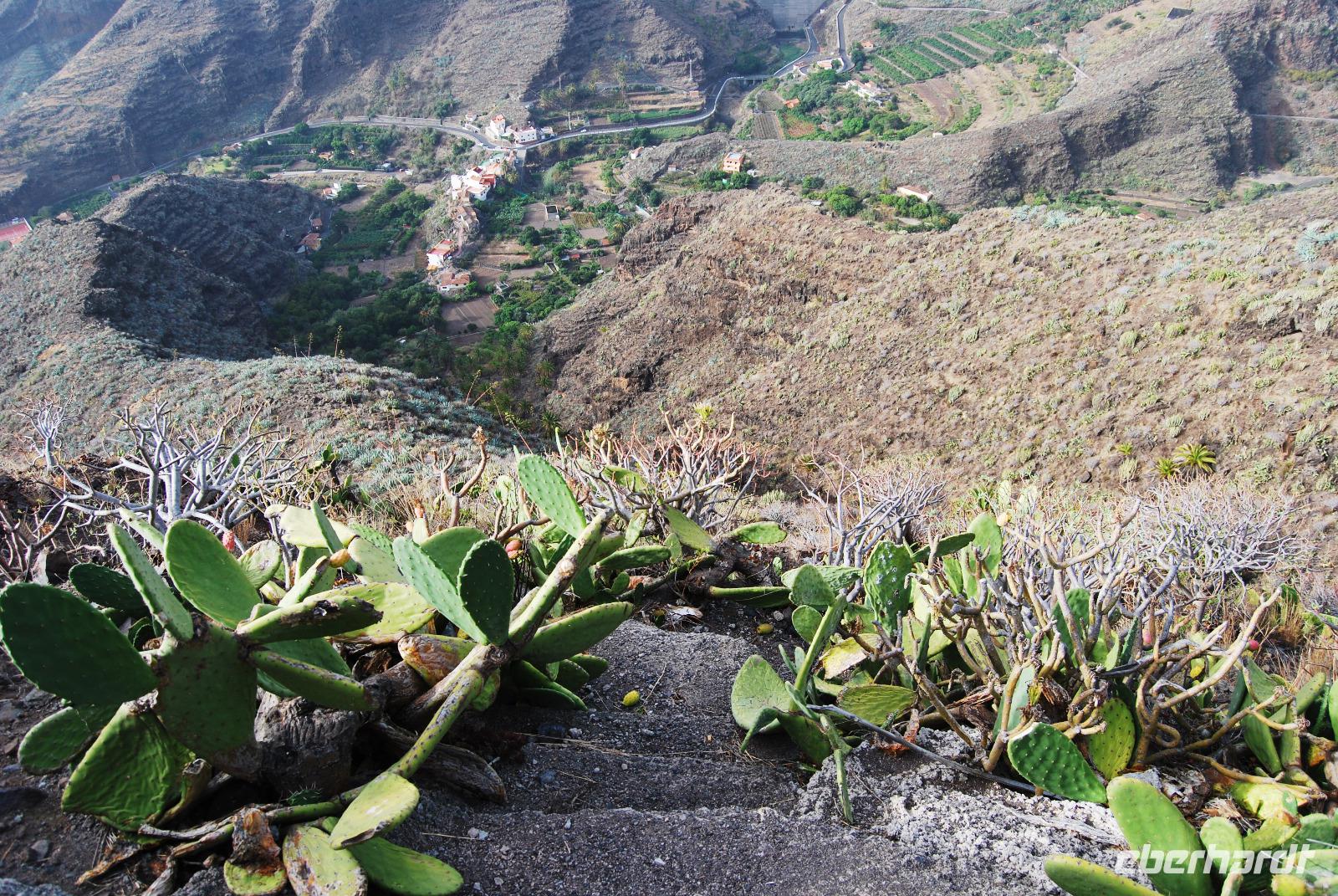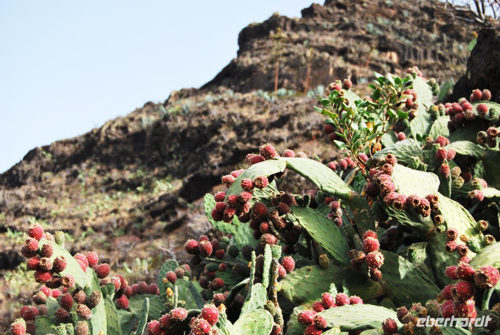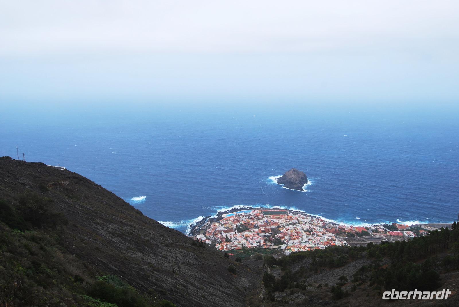 Wir starteten unseren Tag etwas zeitiger als zuvor. Es war an der Zeit die Insel zu verlassen. Wir schipperten mit der Fähre auf die Nachbarinsel La Gomera und legten in San Sebastián an. Dort angekommen wartete Anahi auf uns und schon ging es los! Nachdem das Gepäck sicher verstaut war fuhren wir die steilen Hänge hinauf. Bei der Felsgruppe Los Roques - die Felsen - angekommen, bestaunten wir die Felslandschaft und die Pflanzenwelt. Besonders der Roque de Agando beeindruckte mich sehr. Der 1.251 Meter über dem Meer gelegene Vulkanschlot macht auf mich einen heiligen Eindruck. Anahi berichtet uns, dass schon einst die Guanchen ihn als eine Art Tempel verwendeten. Denn es wurden einige Artefakte dort gefunden. Die Verlockung diesen Tempel eines Tages zu besteigen ist schon groß - aber leider nicht erlaubt.