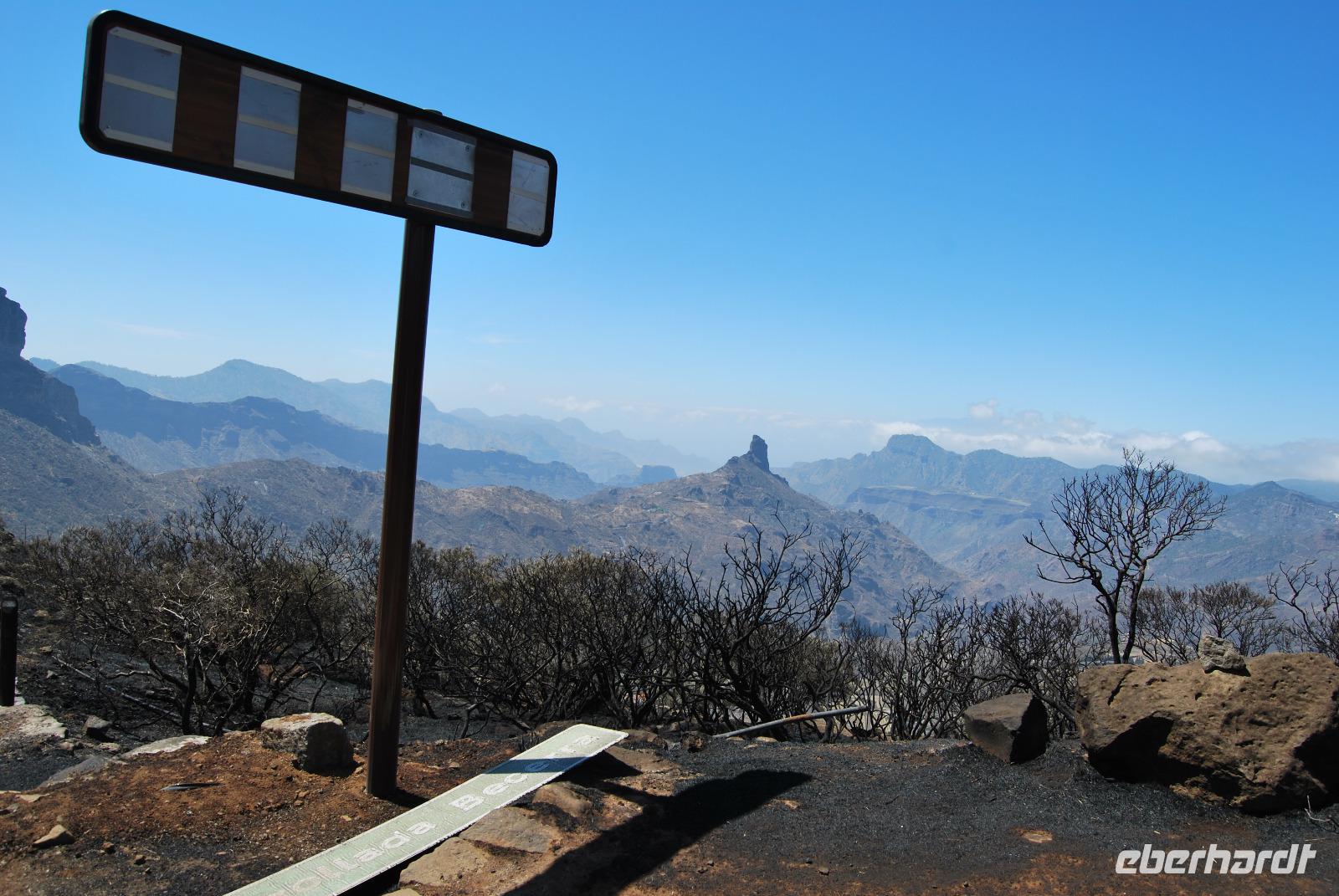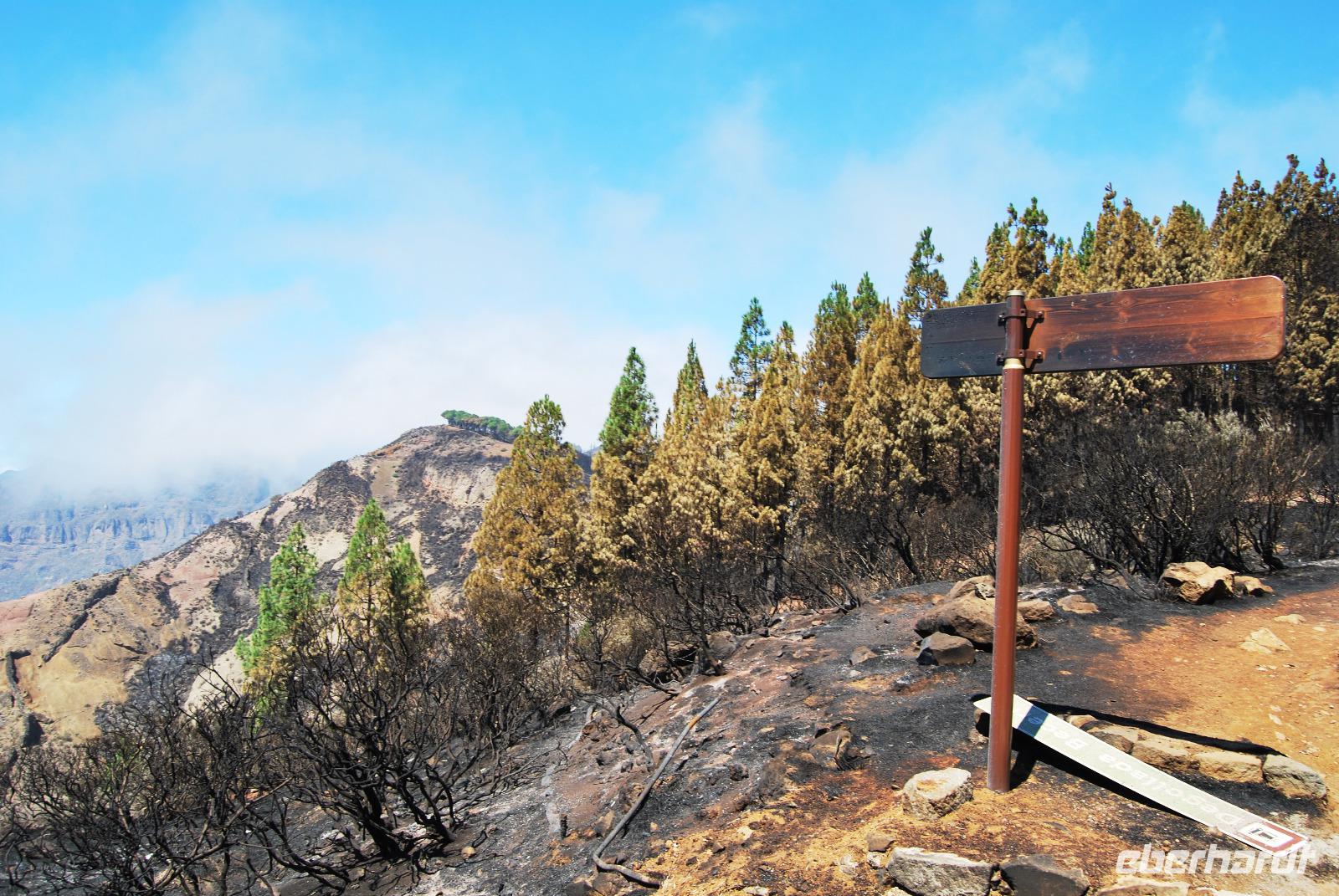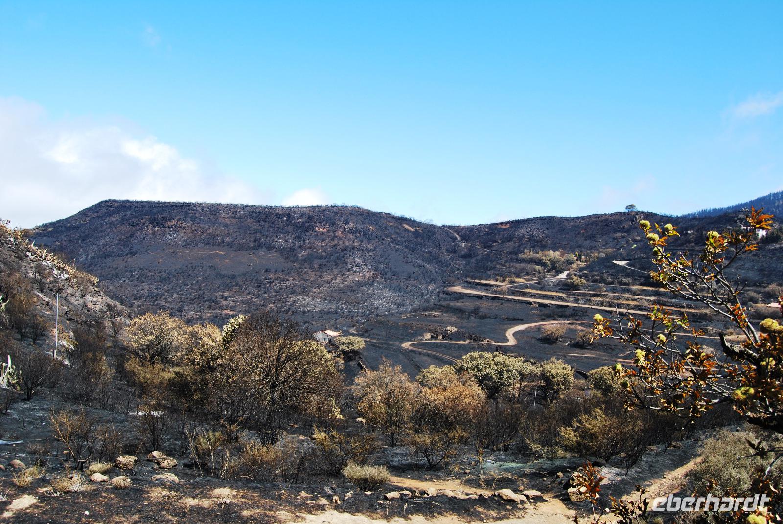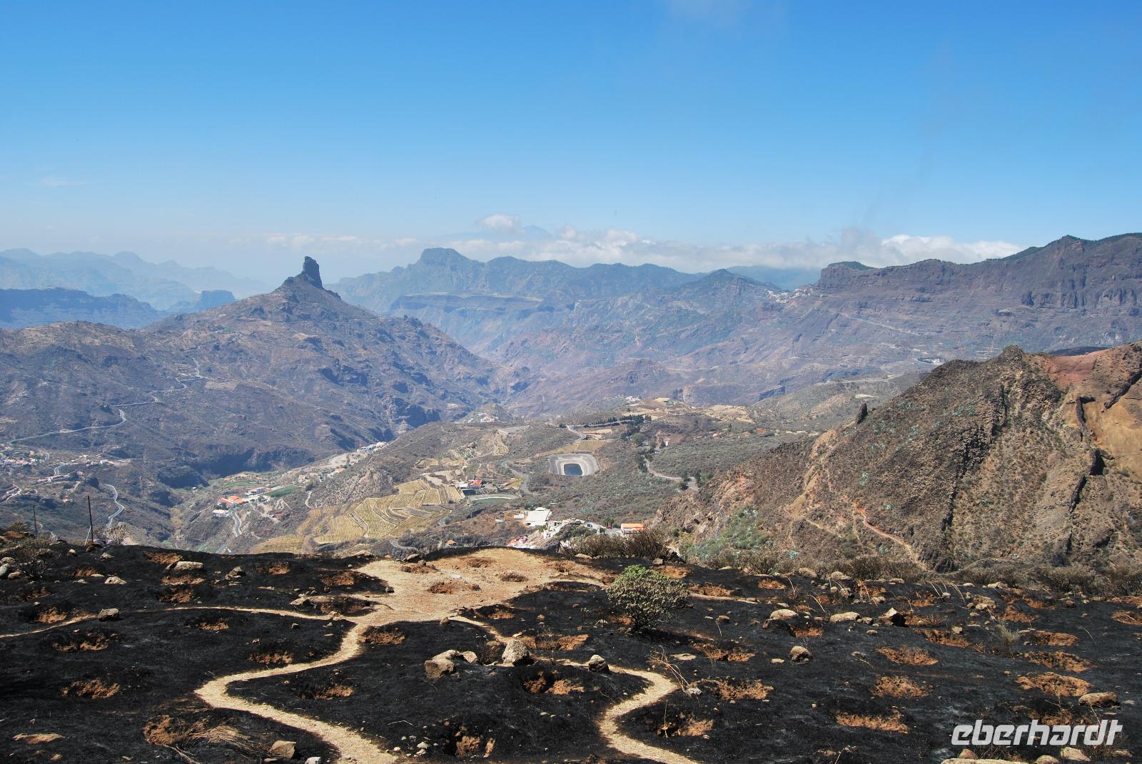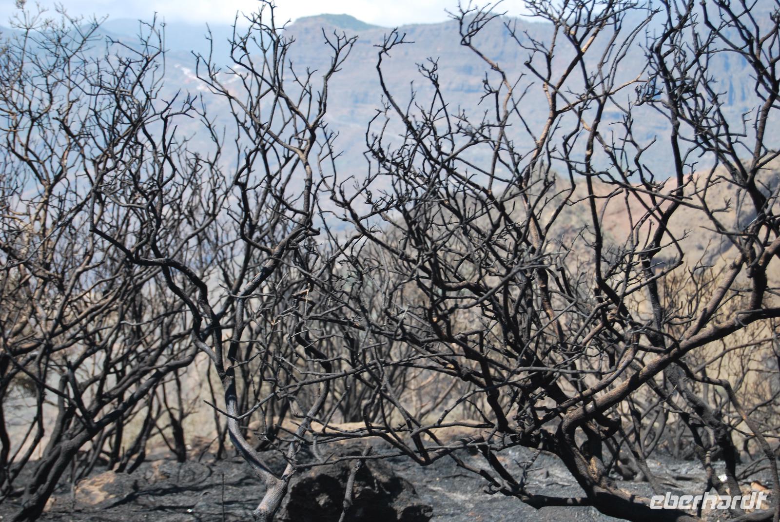 Nach einem Zwischenstopp im Restaurant Balcón de Zamora in Valleseco zum Mittagessen, ging es auf den höchsten Pass Gran Canarias, dem Cruz de Tejada und weiter zum Mirador de Degollada Becerra, wo uns eine wirklich steife Brise entgegen wehte. Aber das beeindruckenste Schauspiel war doch der Waldbrand, der dort wenige Tage zuvor ausgebrochen war. Überall waren nur noch die Stiele der Pflanzen zu erkennen, die Erde kohlrabenschwarz. Alles war verbrannt und an manchen Stellen rauchte es noch. Ein wirklich sehr erschreckendes Bild! Aber gut zu wissen, dass zumindest die kanarische Kiefer einen Schutz gegen Brände entwickelt hat. Sie brennt nicht vollständig nieder. Aus ihrem schwarzen Stamm kann sie nach einigen Jahren wieder neue Triebe bilden und sich so langsam regenerieren.