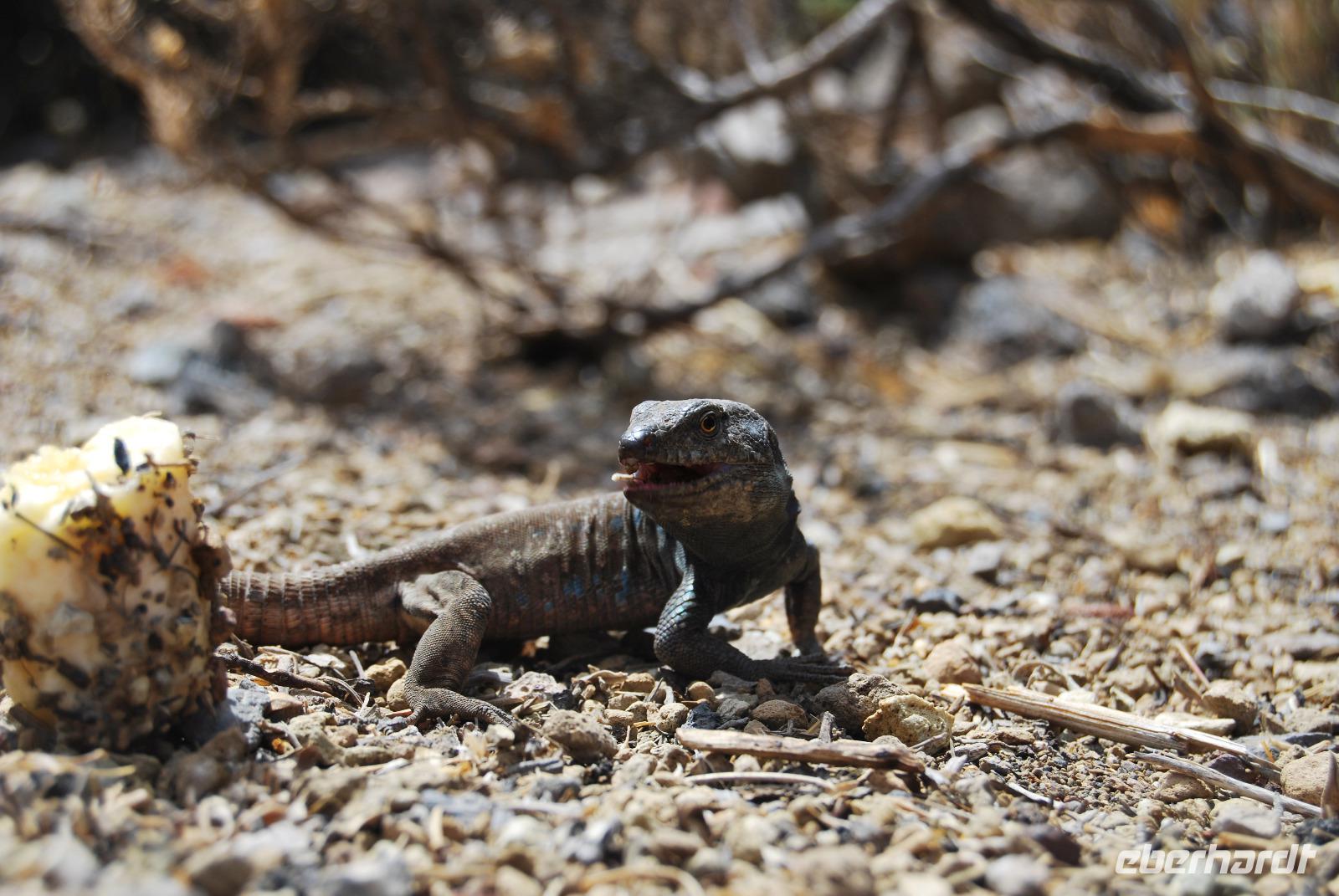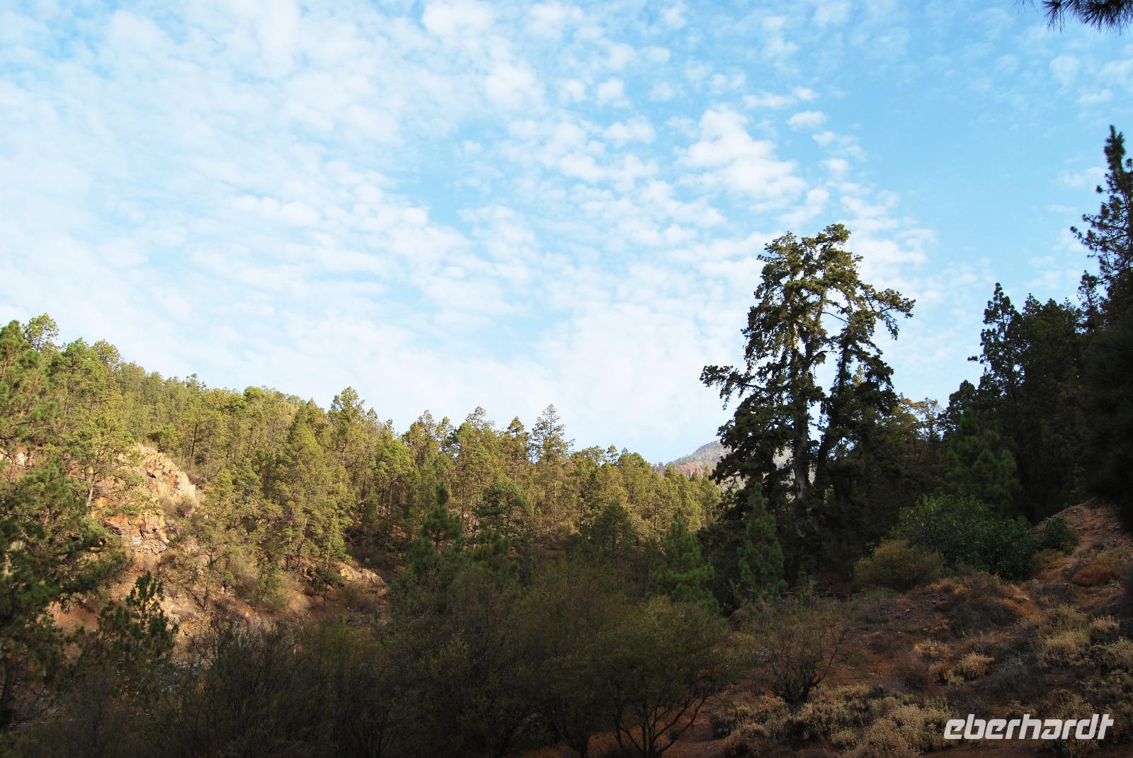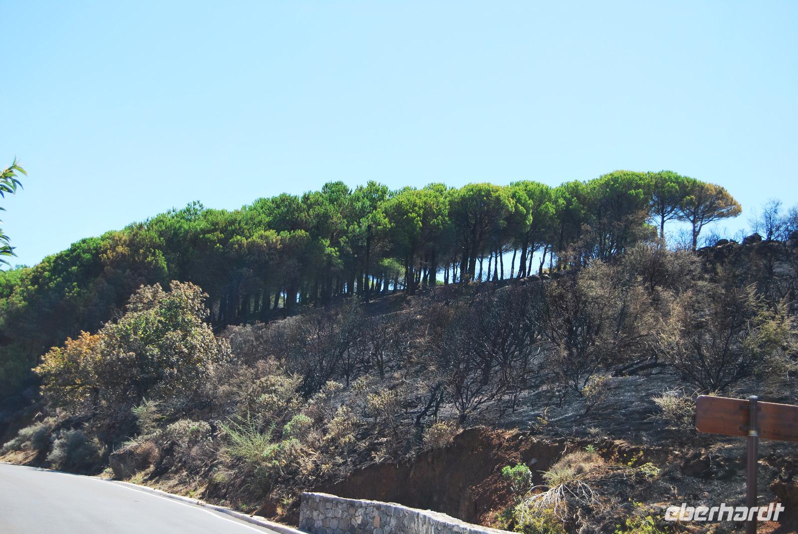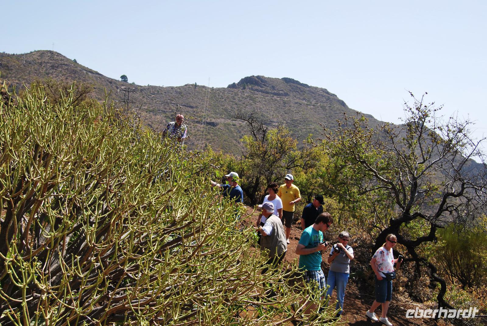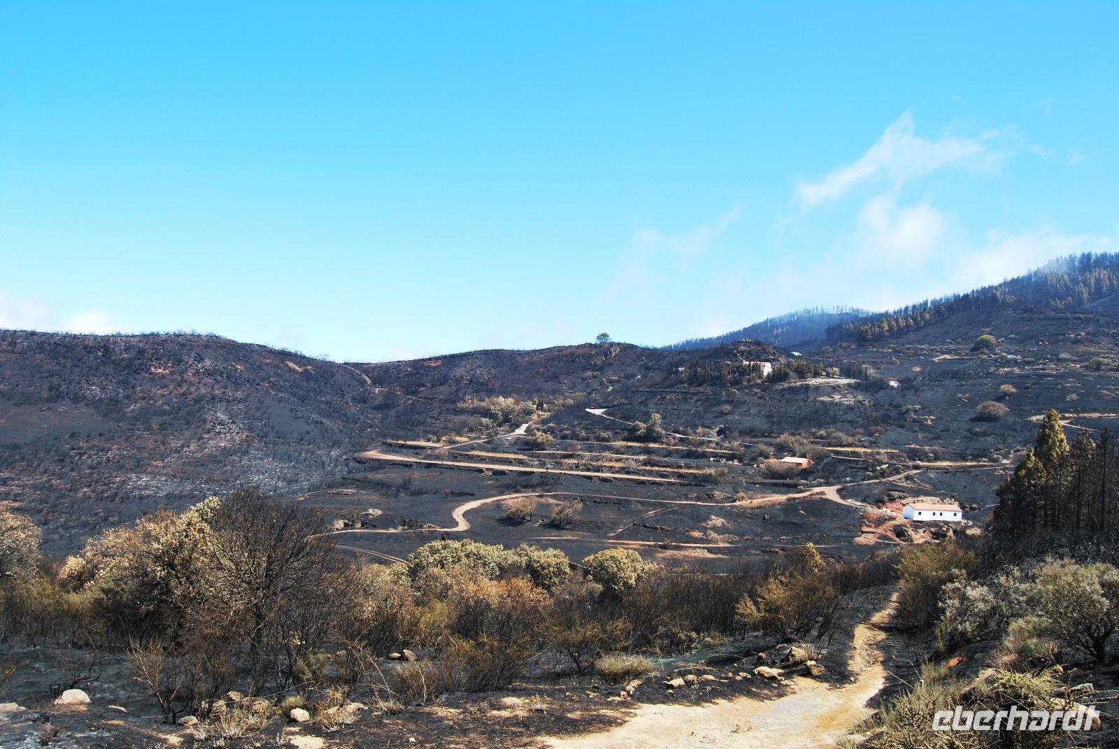 Nach einem Zwischenstopp im Restaurant Balcón de Zamora in Valleseco zum Mittagessen, ging es auf den höchsten Pass Gran Canarias, dem Cruz de Tejada und weiter zum Mirador de Degollada Becerra, wo uns eine wirklich steife Brise entgegen wehte. Aber das beeindruckenste Schauspiel war doch der Waldbrand, der dort wenige Tage zuvor ausgebrochen war. Überall waren nur noch die Stiele der Pflanzen zu erkennen, die Erde kohlrabenschwarz. Alles war verbrannt und an manchen Stellen rauchte es noch. Ein wirklich sehr erschreckendes Bild! Aber gut zu wissen, dass zumindest die kanarische Kiefer einen Schutz gegen Brände entwickelt hat. Sie brennt nicht vollständig nieder. Aus ihrem schwarzen Stamm kann sie nach einigen Jahren wieder neue Triebe bilden und sich so langsam regenerieren.