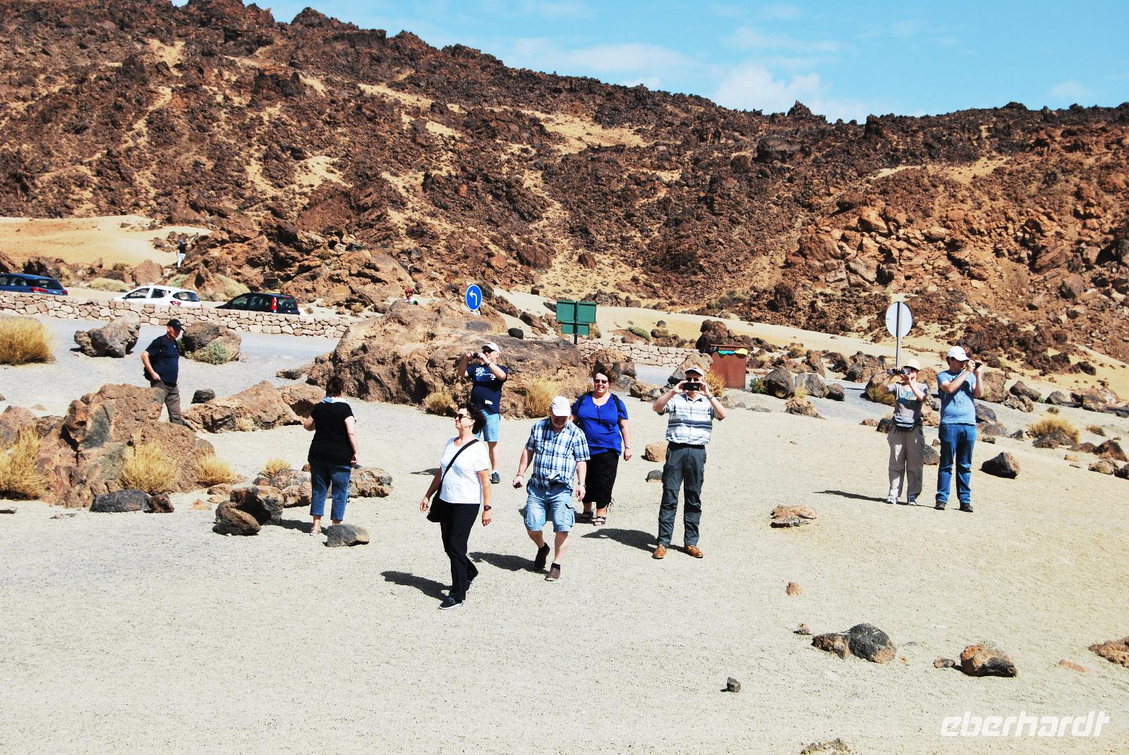 Mit großer Hoffnung sahen wir diesen Tag entgegen. Am Hotel, nahe der Playa de las Americas schien das Wetter super. Wir warteten gespannt auf Oliver. Doch leider konnte er uns keine positive Nachricht verkünden. Die Seilbahn auf den Teide war noch immer gesperrt. Es herrschten zu starke Winde am Gipfel. Dennoch ließen wir uns nicht entmutigen. So fuhren wir Richtung großen Kessel und kamen durch Vilaflor, wo wir nahe des Ortes einen Halt am Pino Gordo machten - der „Fetten Pinie". Ein wirklicher Mammut-Baum, ein Gigant! Mit sieben Personen haben wir es gerade so geschafft ihn zu umrunden. Wir fuhren weiter bis zum Rand des Kessels. Wir öffneten wieder das Dach unsers Busses und konnten so noch mehr das atemberaubende Panorama bestaunen. Nach ein paar Foto-Stopps und spacigen Bildern sind wir am Mirador Llano de Ucanca und dem Roques de García angekommen. Nach ein wenig Freizeit auf dem Plato folgte die Auffahrt zur Seilbahn, um dort einen kleinen Toiletten-Stopp einzulegen. Wenig später durchquerten wir die Basalt-Wüste und fanden uns in der Taverne „Bamby" zum Mittagstisch ein. Dabei immer im Blick: der Teide. Mit seiner Höhe von 3.718 Metern ist er der höchste Berg Spaniens. Unser Ausflug führt uns weiter in ein Besucherzentrum wo uns noch einiges über die Entstehung der Insel gezeigt wurde. Vor dem Gebäude begeisterten uns noch ein paar Echsen, die sich an einem Stück Banane erfreuten. Wir fuhren am Mirador de la Piedra de la Rosa vorbei und kamen nach La Orotava. Als erstes besuchten wir dort die Kirche aus dem 16. Jahrhundert mit dem angefügten Augustiner Kloster. Von der angrenzenden Plaza hatten wir einen schönen Ausblick über die Stadt. Oliver erzählte uns, dass viele Gebäude in der Stadt einen maurischen Architekturstil aufweisen. Und, dass gar nicht weit von unserer Route, ein dominikanisches Kloster liegt, wo er einst zur Schule ging. Wir besichtigten noch das Casa de los Balcones, welches zu den Sehenswürdigkeiten der Stadt zählt. Mit aufwändig holzgeschnitzten Balkonen erweckt es einen imposanten Eindruck.
