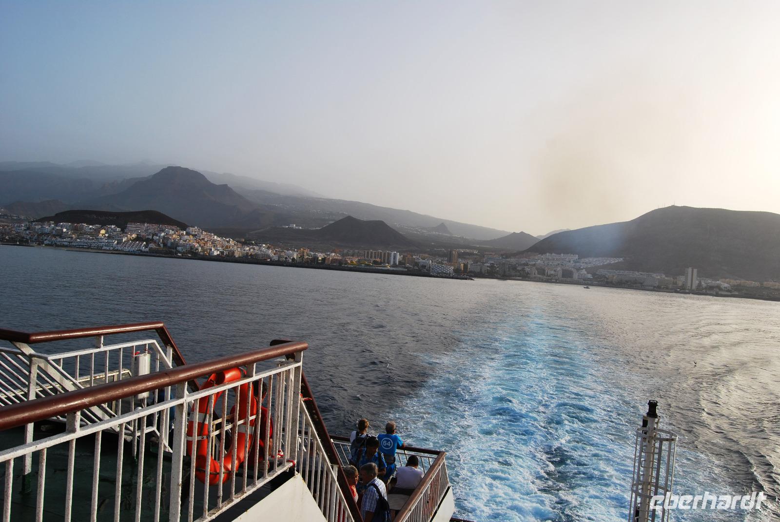 In der Stadt angekommen, stand noch ein kleiner Rundgang auf den Spuren von Christoph Columbus auf dem Programm. Wenig später sind wir zu einem köstlichen Abendmahl über dem Hafen von La Gomera zusammen gekommen. Im abendlichen Sonnenschein genossen wir verschiedenste kanarische Spezialitäten. Nun dauerte es auch nicht mehr lang bis unsere Fähre im Hafen anlegte. Durch den Frachtraum gingen wir an Bord des Katamarans. Nach gut zweieinhalb Stunden erreichten wir unsere dritte Insel - La Palma. Mit dem Bus ging es dann in das Hotel in Los Cancajos.