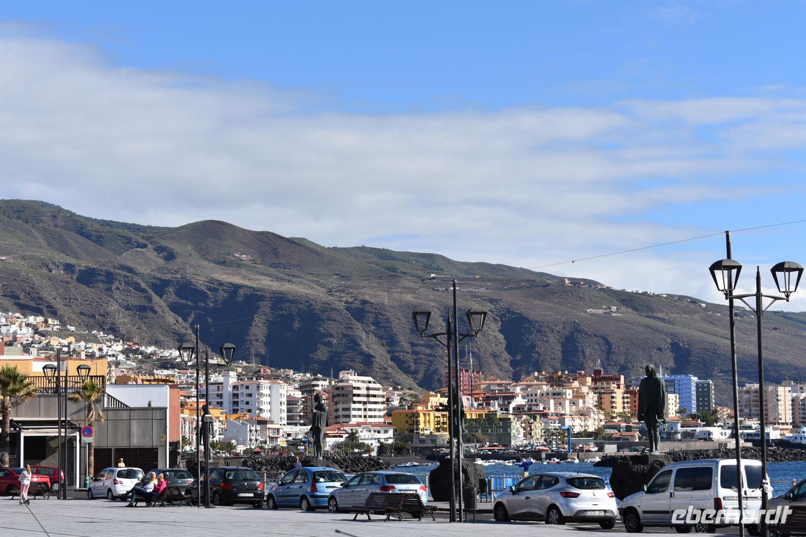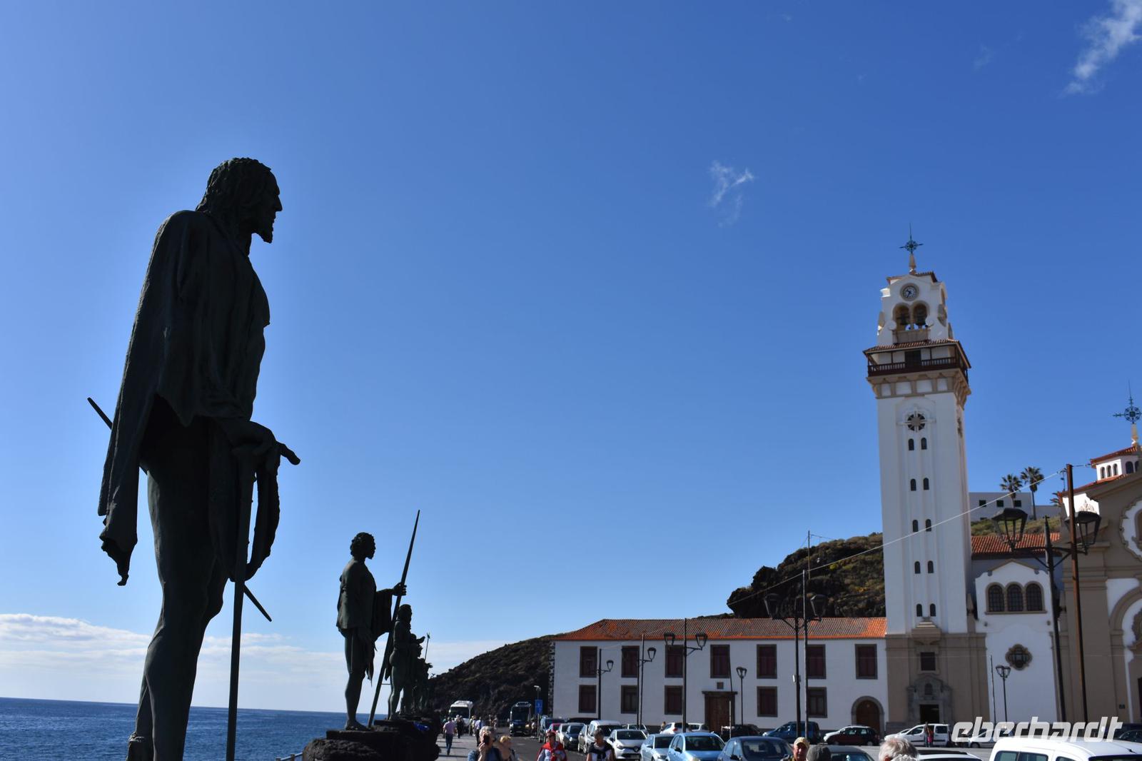 Nach einem ausgiebigen Frühstück begrüßte uns unsere örtliche Reiseleiterin. Wir begannen unsere Insel-Rundfahrt in nördlicher Richtung. In Candelaria, ein bekannter Wallfahrtsort, erfuhren wir etwas über die Geschichte der Guanschen und deren Bezirke. Heute ziert der Platz die Basílica de Nuestra Señora de Candelaria aus dem 20. Jahrhundert sehr schön anzusehende Skulpturen der Ureinwohner-Könige. Das aus Nordafrika stammende Berbervolk lebte zu seiner Zeit zwar technologisch noch in der Jungsteinzeit, zeigte aber in der Kultur schon hoch moderne Formen wie wir sie heute kennen. Die Guanschen besaßen damals riesige Hunde, die sie eigentlich als Hütehunde einsetzten, die sich aber auch als gute Kriegshunde erwiesen und die Römer sowie später andere europäische Nationen in Angst und Schrecken versetzten. Durch die großen Hunde der Ureinwohner erhielten die Inseln den beinamen Hundeinseln. Dies spiegelt sich auch noch heute im Wappen wieder.