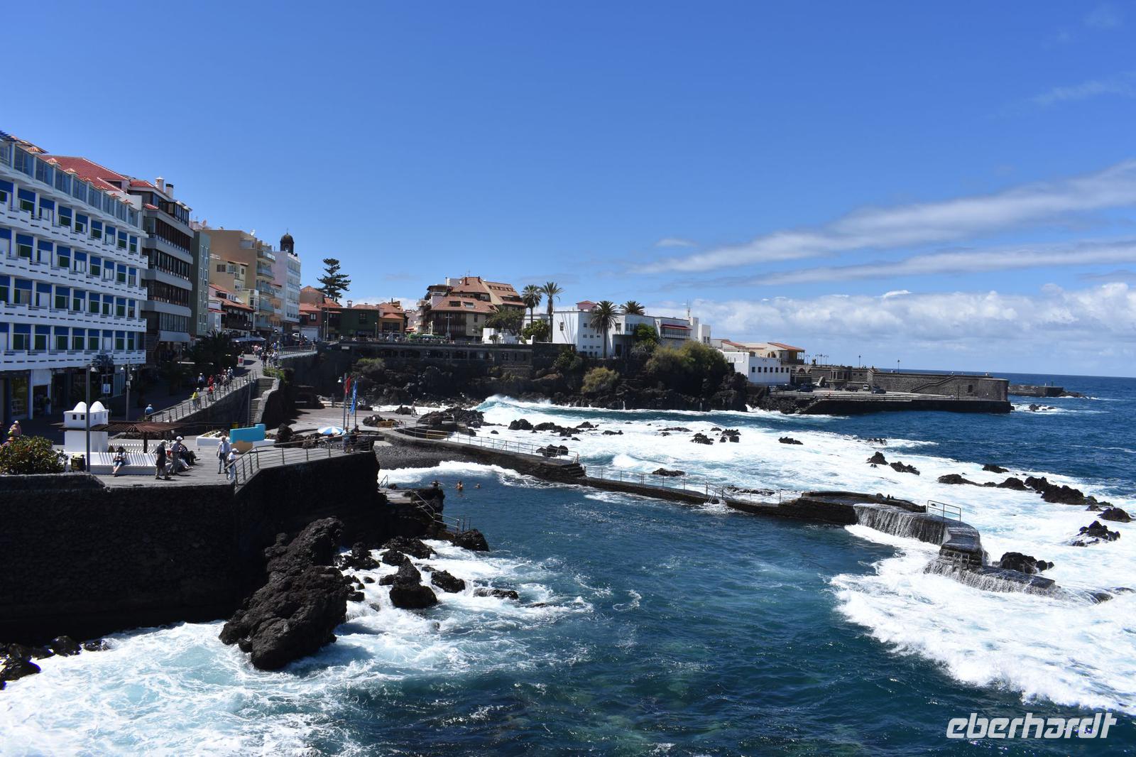 Zum Mittag ging es in die Hafenstadt Puerto de la Cruz, welches ziemlich kanarisch ist, da die Einheimischen eher hier zu Hause sind als im Süden, wo man mehr Hotelpaläste findet als Wohnungen. Frisch gestärkt spazierten wir an der Promenade entlang und sahen die Meeresschwimmbecken des Kanaren-Architekten César Manrique, die kleine Kapelle Ermita de San Telmo, das Rathaus, den alten Hafen an der Playa del Muelle, die Fischfrau und einiges mehr.