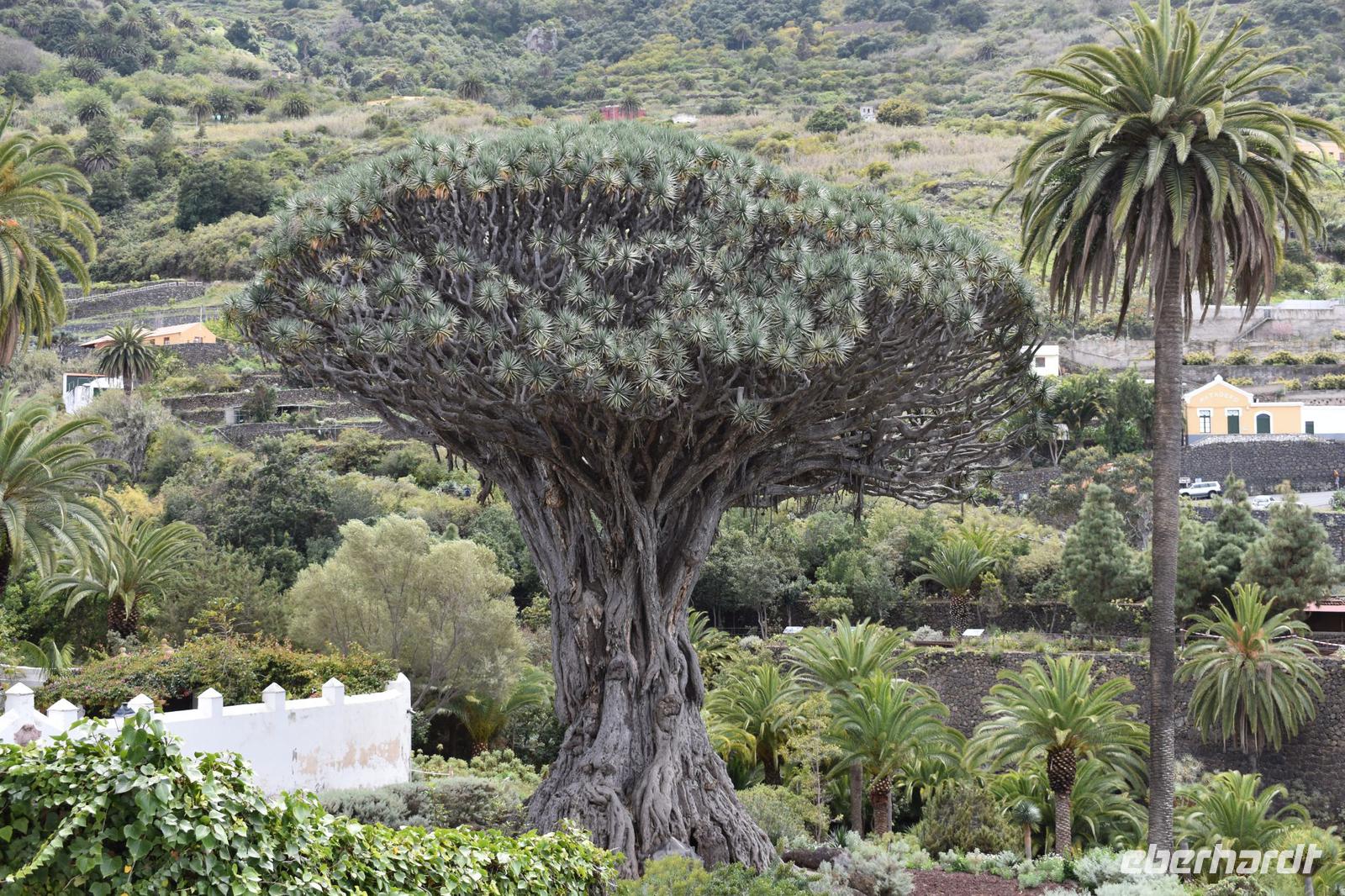 Die Inselrundfahrt führte uns weiter in den Nord-Osten der Insel. Am sogenannte „Schwänzchen der Ente", in Icod de los bewunderten wir den ältesten Drachenbaum der Kanaren und einige andere interessante Pflanzen. Der Drachenbaum, mit einer Vielzahl an Verzweigungen und alter, knorriger Luftwurzeln, macht er einen sehr ehrwürdigen Eindruck.