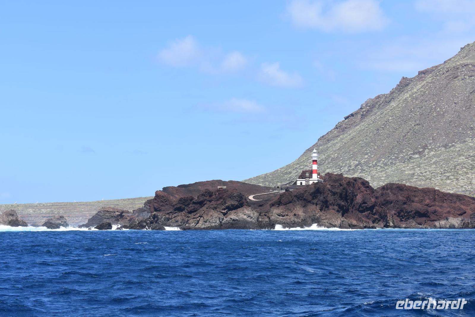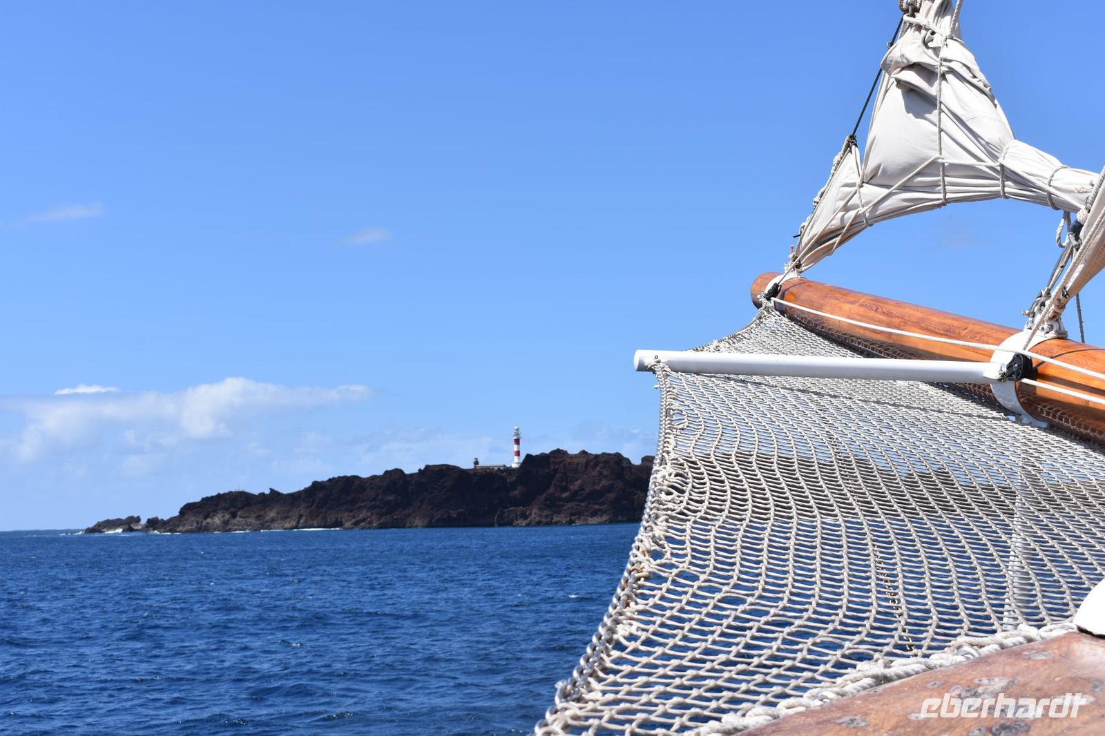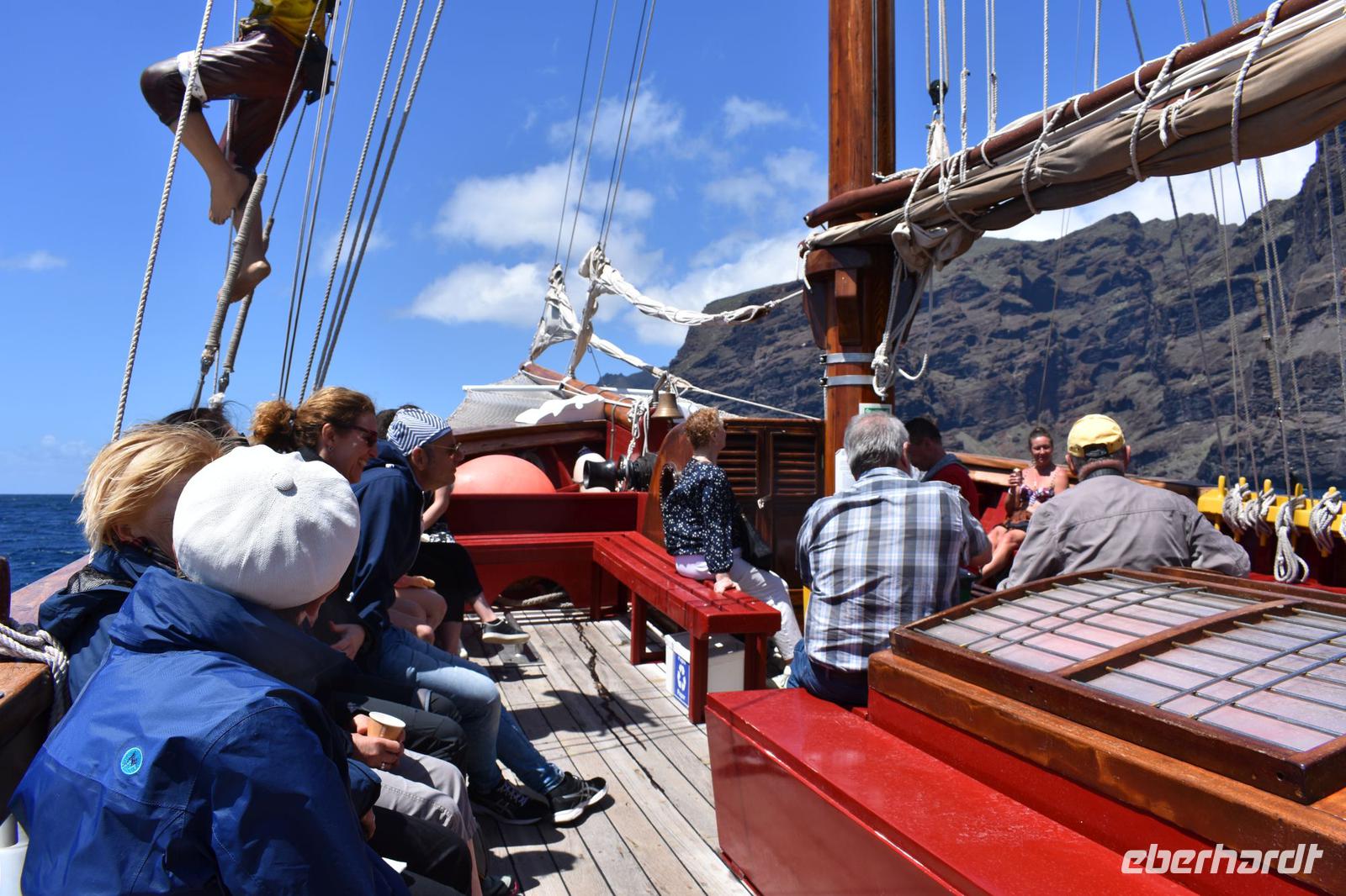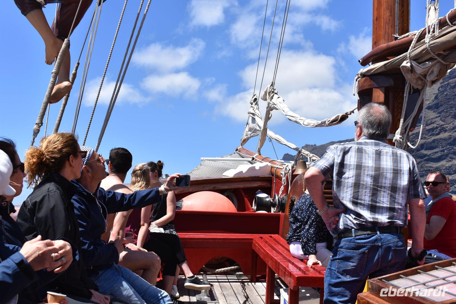 Wir kamen dann nach Los Gigantes, wo wir im Hafen das Piratenschiff der Flipper Uno bestiegen. Ein paar Leute gingen gerade von Bord, als wir den Kai erreichten. Die Mannschaft schwang noch fleißig den Wischmopp. Das Schiff sah und wieder wie neu aus und war bereit für unseren Turn. Rauf auf die stürmische See! Die Crew verteilte gratis Bier und Wein und heiterte die Stimmung schon mal etwas an. Der Wellengang war wirklich enorm. Wir schipperten unter der riesigen Felswand der Los Gigantes entlang. Immer wieder schwabte eine Welle so stark an den Bug, dass ein Schwall Wasser über das ganze Schiff verteilt wurde und alle gehörig nass machte. Doch alles nahmen es mit Humor und ließen sich von der Sonne und dem Wind trocknen, bis der nächste Schwung Wasser einen übergoss. Schließlich kamen wir an der Punta de Teno an, wo auch ein Leuchtturm auf dem Felsen stand. Dort sahen wir zwei Tümmler Delphine im Wasser schwimmen. Doch leider tauchten sie immer wieder ab und wir bekamen sie nur aus der Distanz zu sehen. Der Wellengang war noch immer enorm stark - es war wirklich ein Wunder das niemandem schlecht geworden ist.