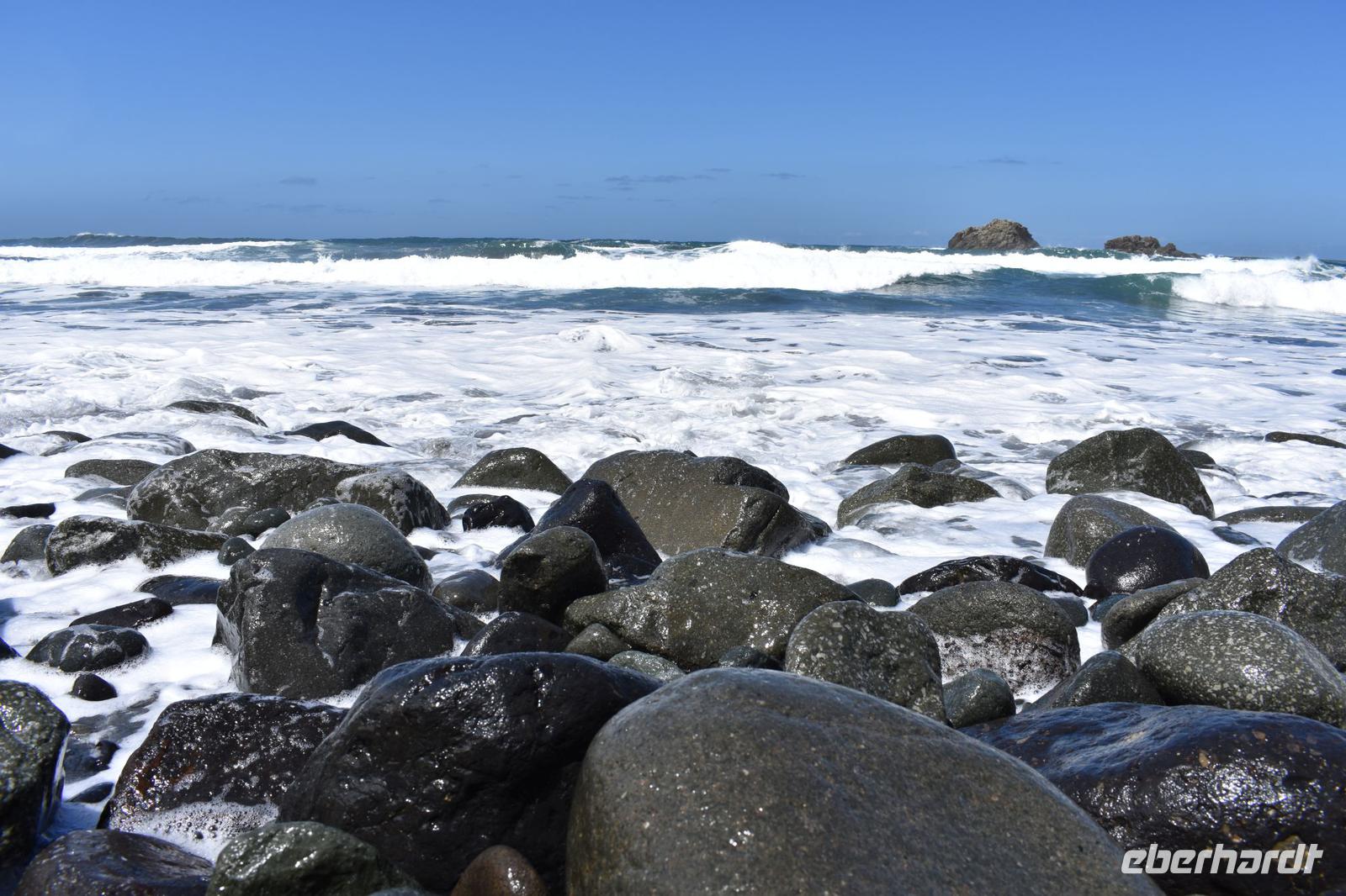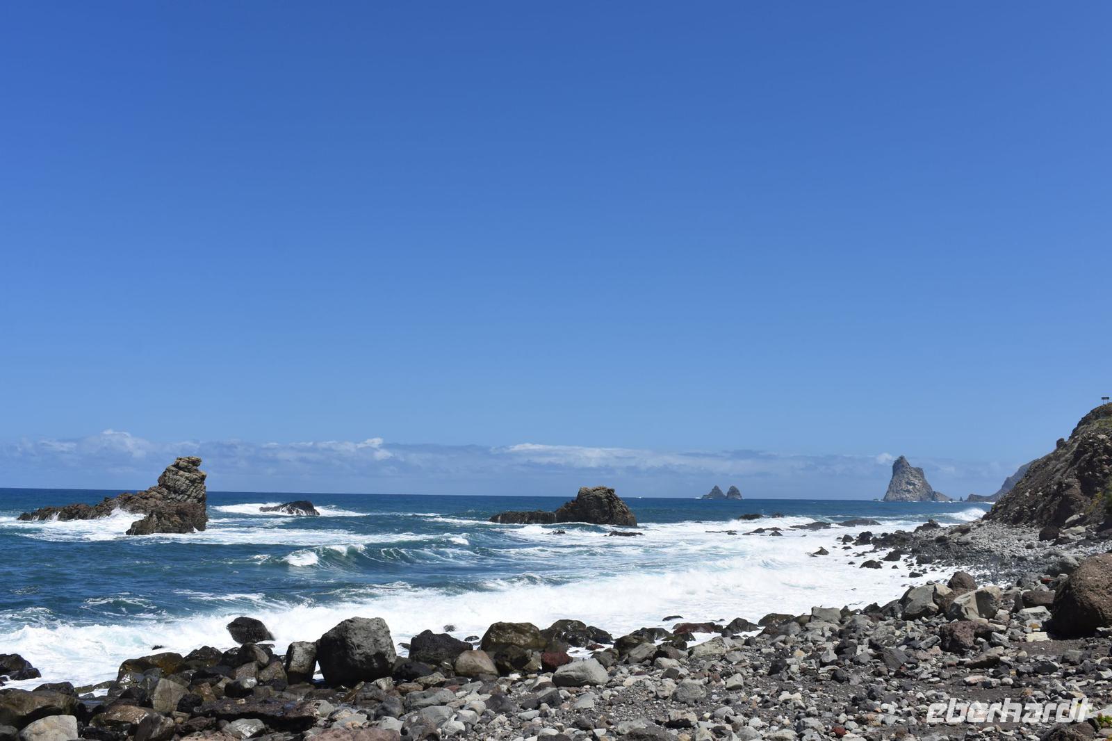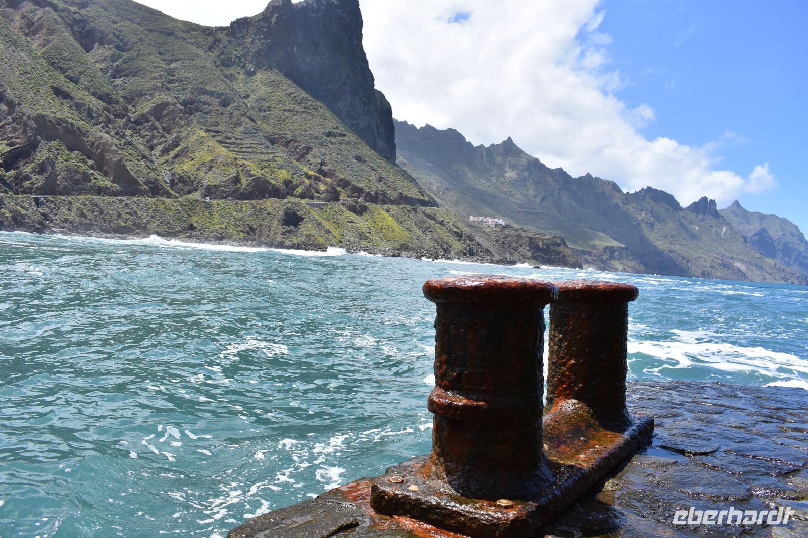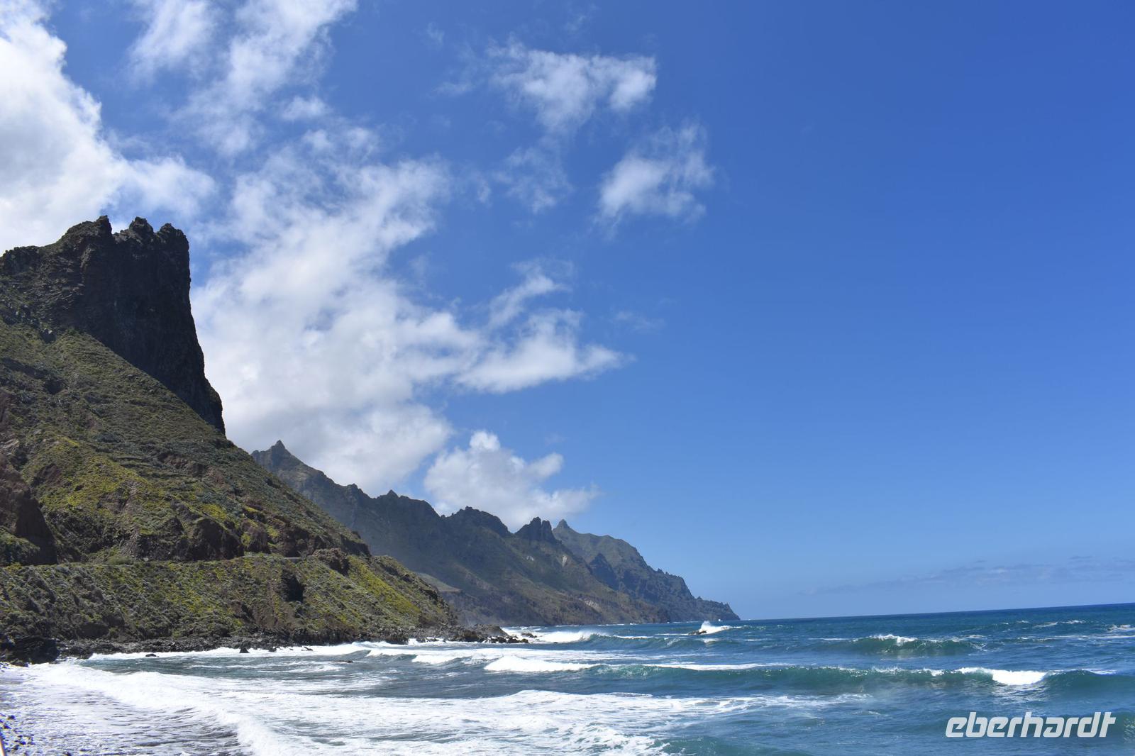 Nun kamen wir dem Gebirge schon ein Stück näher. Am Strand von Las Teresitas machten wir eine kurze Pause, dann schraubten wir uns die Serpentinen hinauf. Wir fuhren durch den ländlichen Naturpark des Anaga-Gebirges. Durch den Tunnel de Anaga gelangten wir auf die andere Seite der Ente. Wir sahen das Dorf Taganana von oben und schlängelten uns allmählich wieder nach unten an die Küste. Zum Mittagessen kehrten wir in das Casa Africa ein und ließen uns von einheimischen Spezialitäten begeistern. Nachdem wir gut gegessen hatten, blieb uns noch Zeit um das spektakuläre Gebirgspanorama und die rauschende Brandung zu genießen.