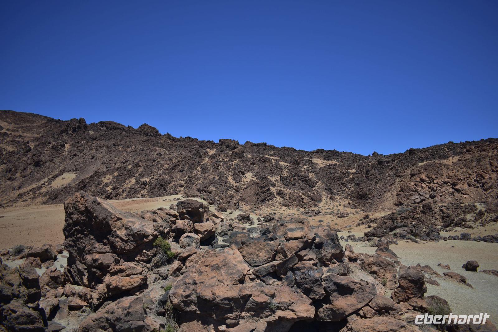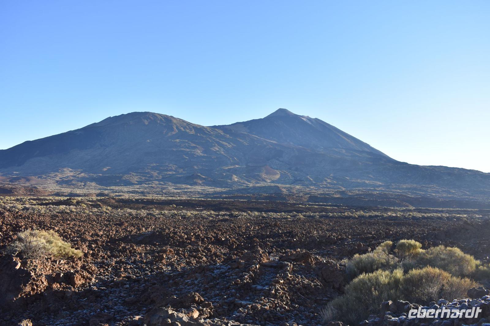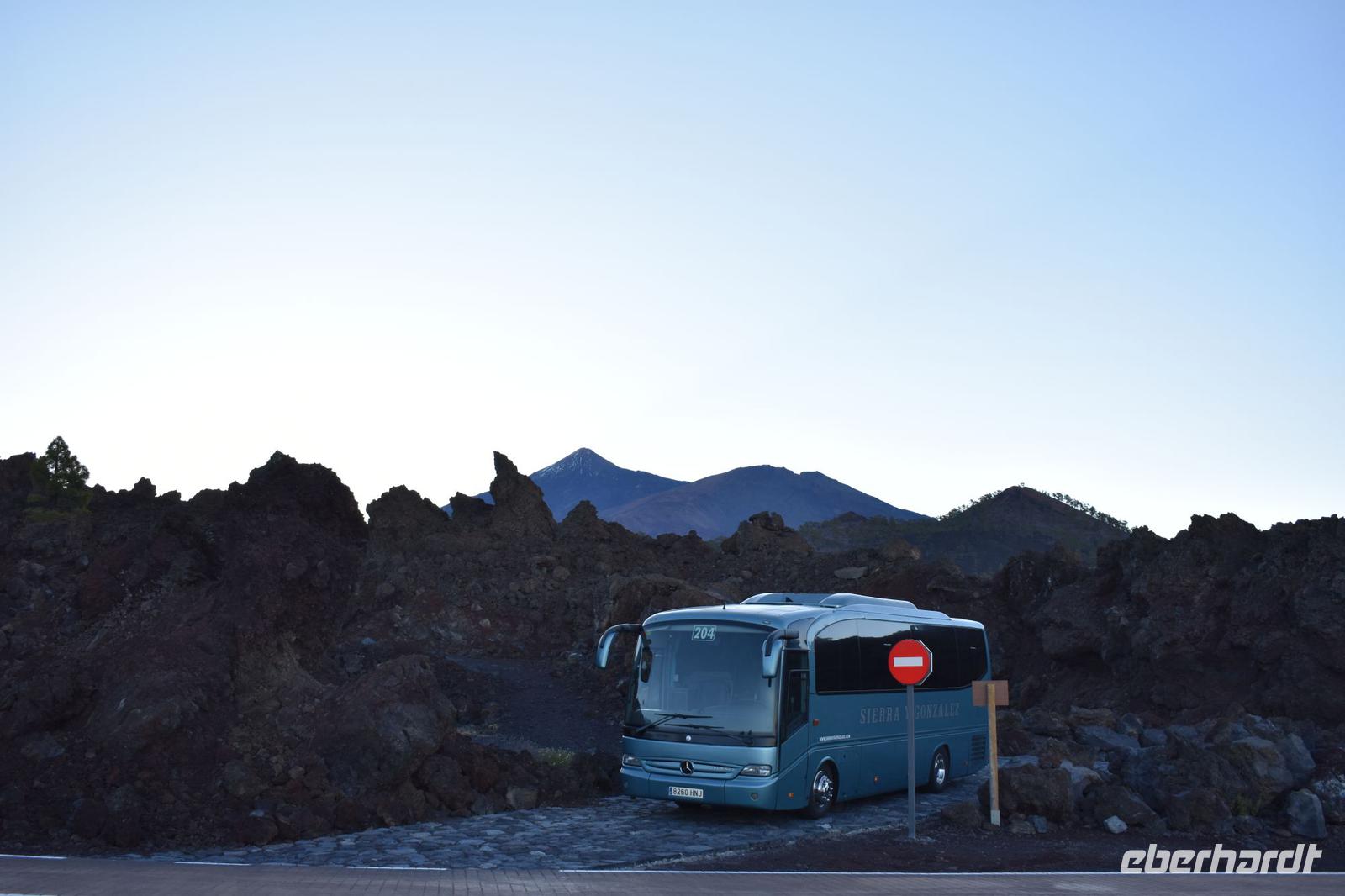 Da wir uns aber nicht viel bewegen konnten fuhren wir schon etwas früher wieder nach unten. Nachdem wir alle Gäste wieder eingesammelt hatten, fuhren wir ins Besucherzentrum des Nationalparks, wo wir noch einiges Wissenswertes über die Entstehung der Kanarischen Inseln lernten. Der Teide-Geist berichtete uns. Wir verweilten noch ein wenig auf dem Hochplateau und stärkten uns im Restaurant Bamby. Wenig später stapften wir über den Mond - beinahe. In Wirklichkeit war es ein ockerfarbenes Basalt-Feld unterhalb des Teide. Aber sah schon ziemlich genau so aus wie auf dem Mond, zumindest unserer Vorstellung nach.